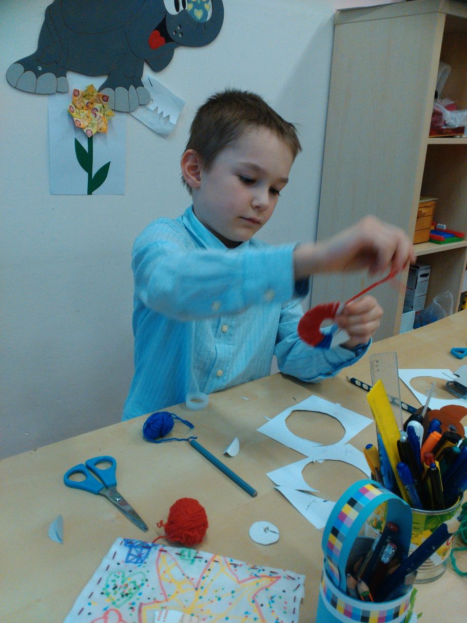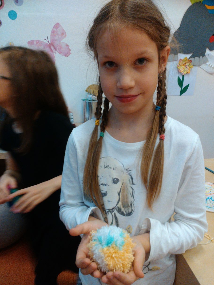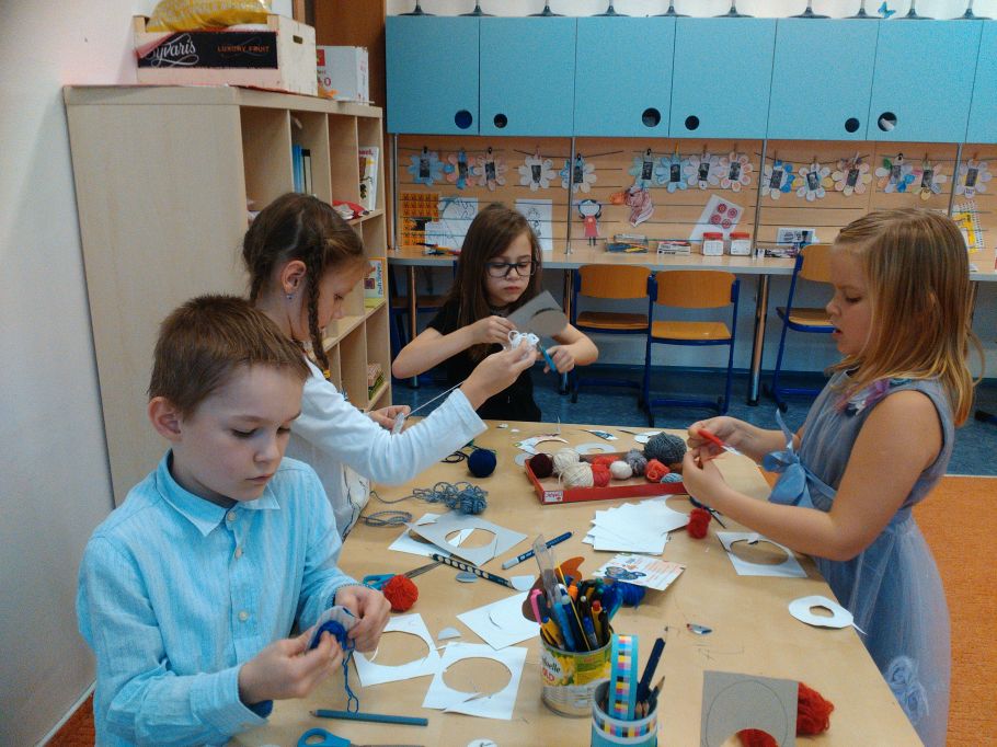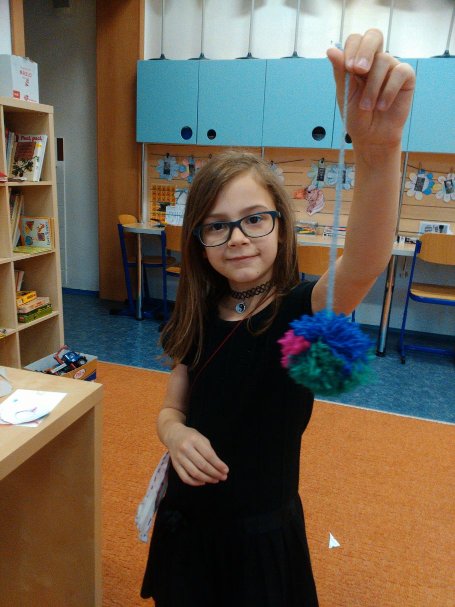 Je tady středa a před námi 4 dny volna. Rodiče si děti vzali mnohem dříve, než si je běžně berou a tak nás v družině zůstala jenom hrstka. Učili jsme se vyrábět bambulku na čepici. Moc nás to bavilo a jak vidíte, dětem se povedli. Jsou hodně barevné a velké. U naší práce jsme si zpívali písničky z pohádky o Třech bratřích a poslouchali pohádku.