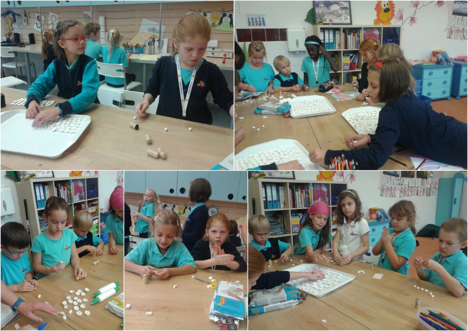Dnes jsme se pustili do malování našich včerejších zvířátek a a pak jsme všichni i s druhou družinou vyráběli groše na naše vánoční trhy. Nejprve jsme nakouleli spoustu malých kuliček a pak předem připravenými raznicemi razili mince. Mezitím některé děti odcházely na kroužky - výtvarný a florbal. Kluci si postavili stavby z molitánků a hezky si v něm hráli na obchod. Děvčata si malovali princezny a pak se z nich stali ukňourané kočičky.