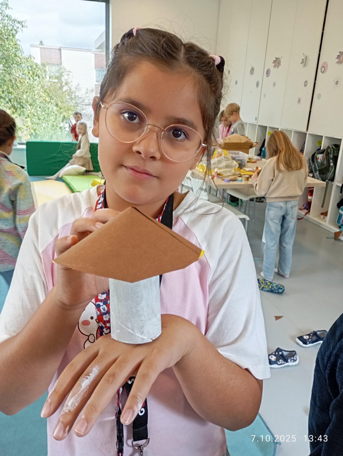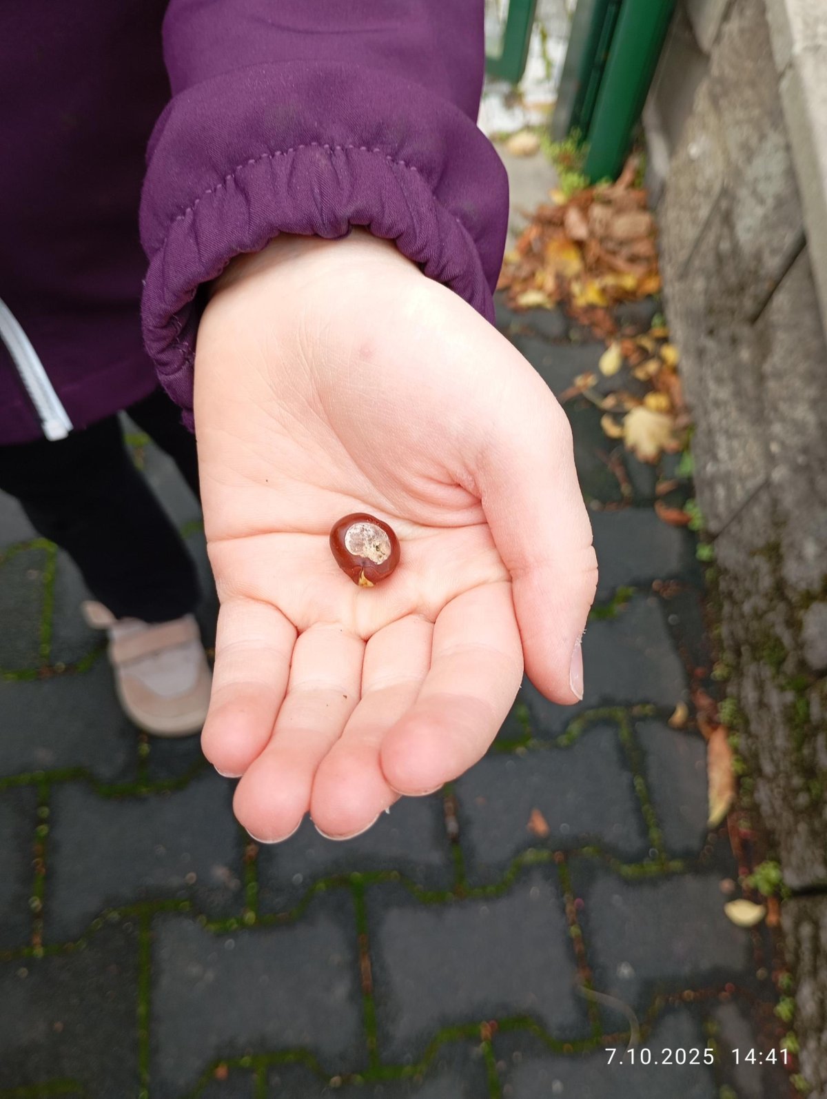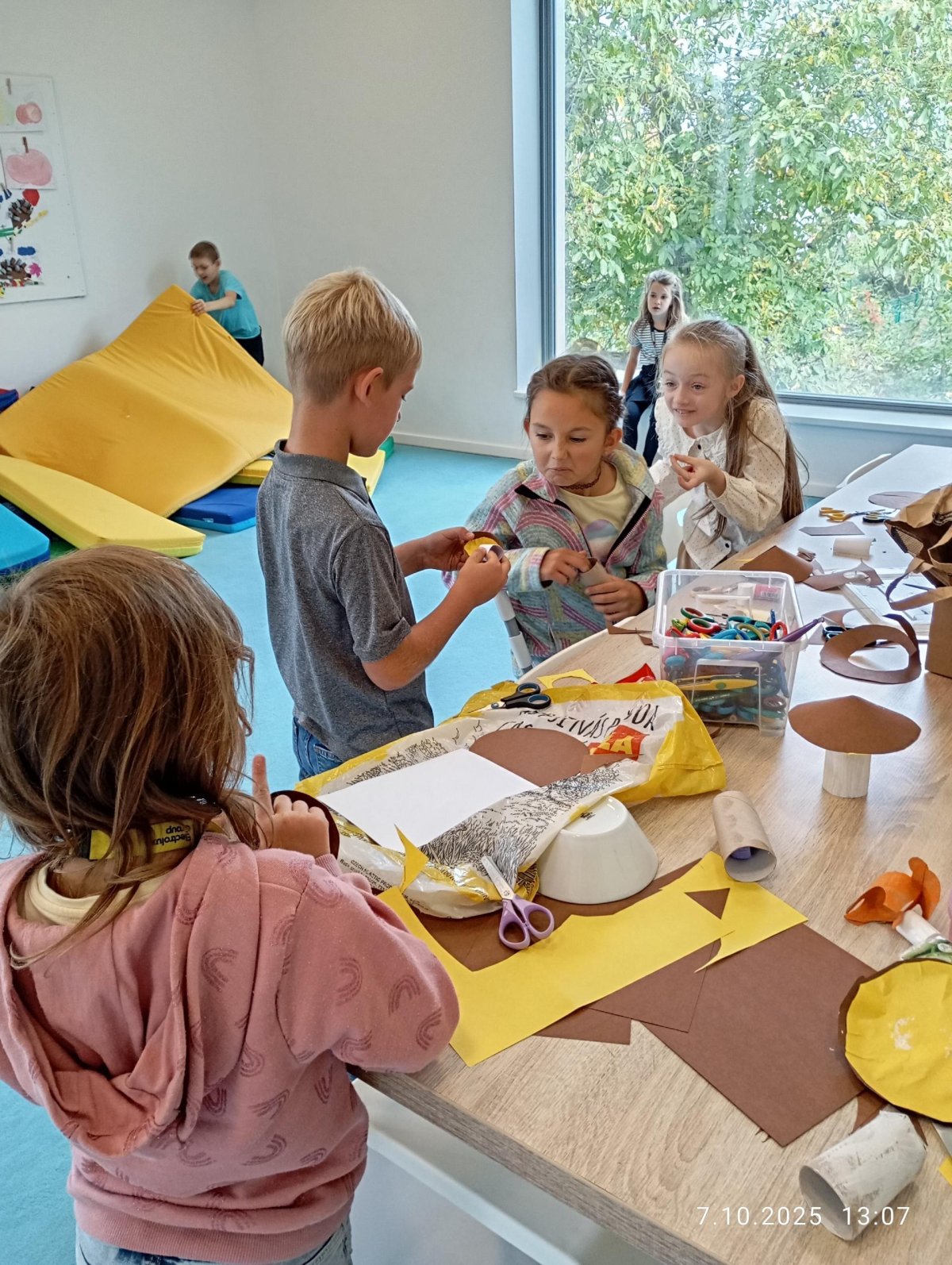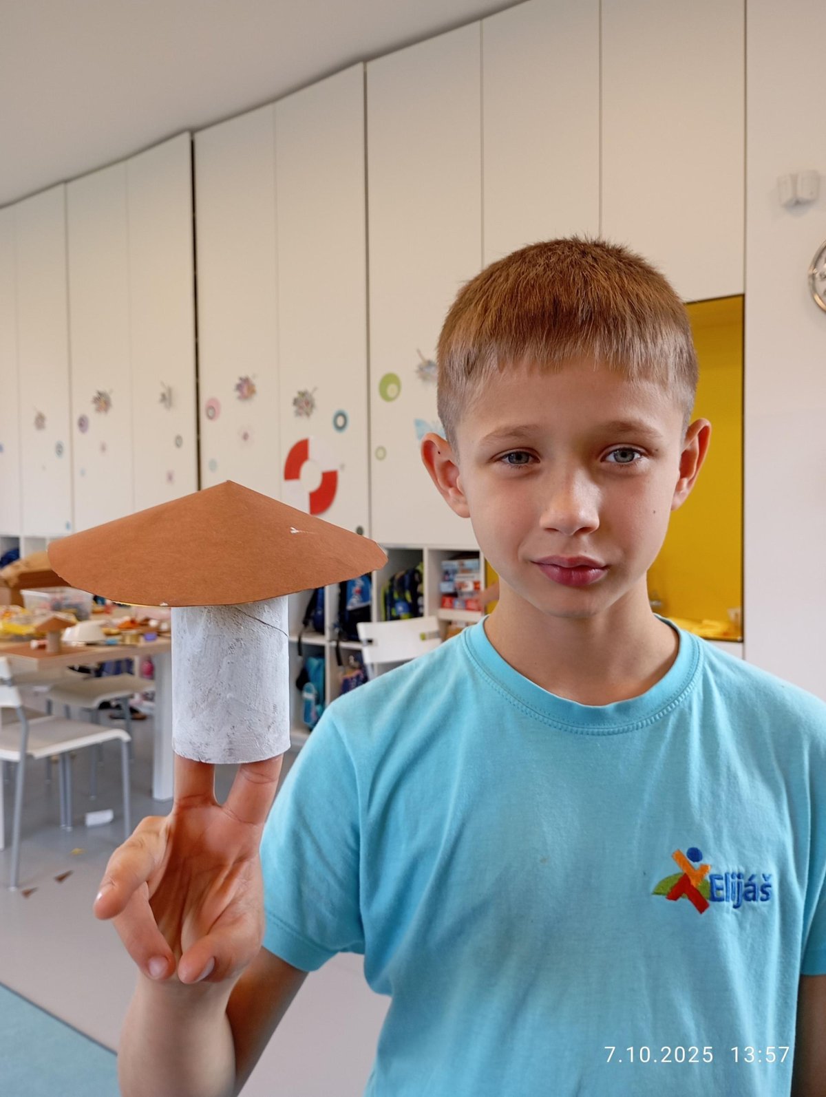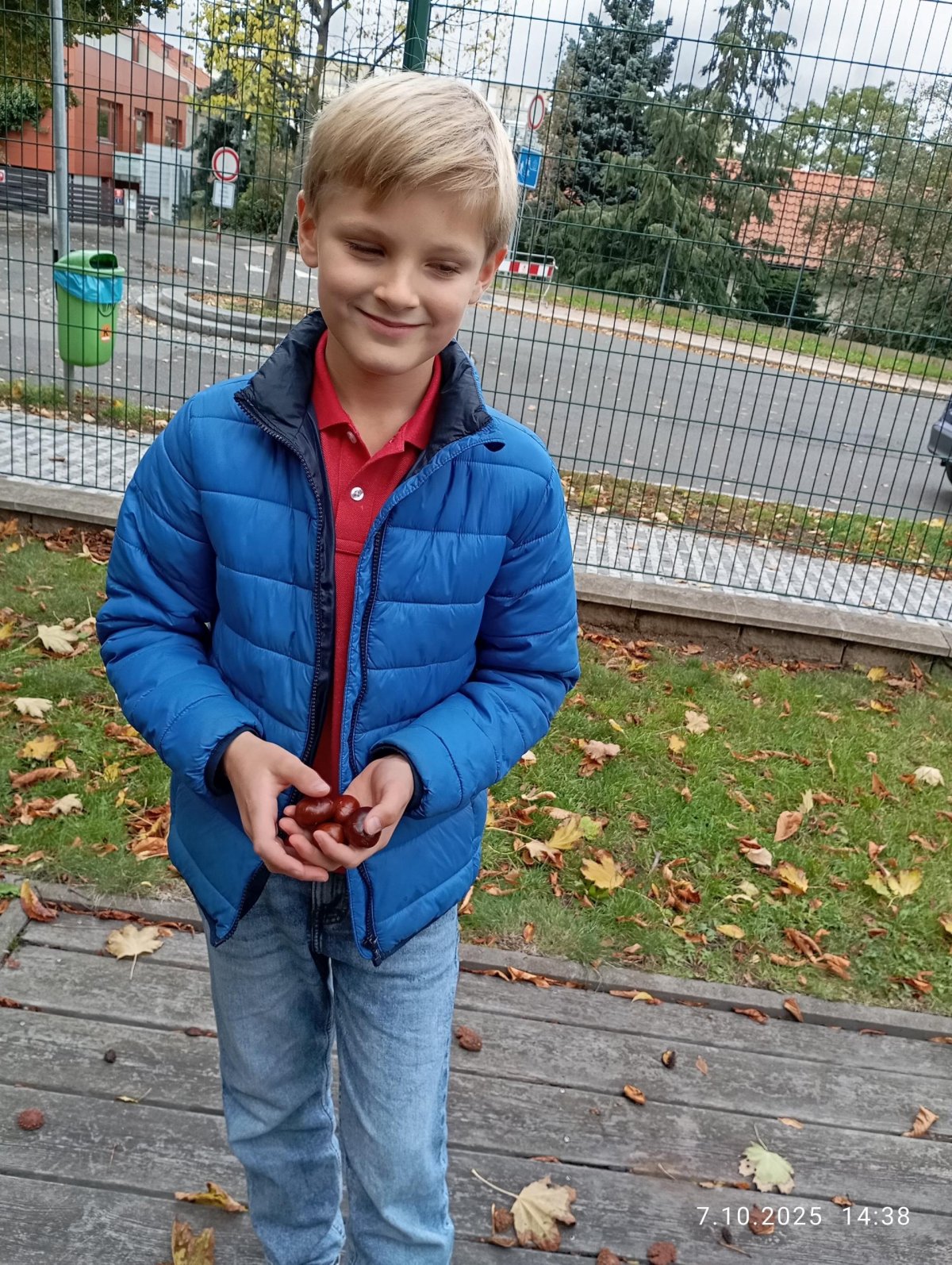 Když jsme u těch hub, vyrobili jsme včera i hříbky. Tentokrát v 3D provedení. Vystříhly jsme kruhy, ze kterých vznikl po nastřižení a opětovném slepení klobouk, pak byl potřeba menší kroužek na ze žlutého papíru a spodek a nohu nám pomohly nahradit ruličky wc papíru. Prostorově ztvárnit houbu není jednoduché, ale děti si s tím poradily, trochu pomohla paní učitelka a trochu tavná pistole, a hřibky byly na světě. Samosebou, někteří dali přednost autíčkům, legu a magnetické stavebnici. venku si to pak užívali všichni, vydali jsme se totiž na hřiště u školy na kaštánky, pokusíme se vypěstovat sazenčky a třeba i zasadíme stromky.