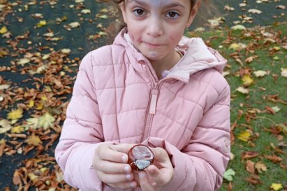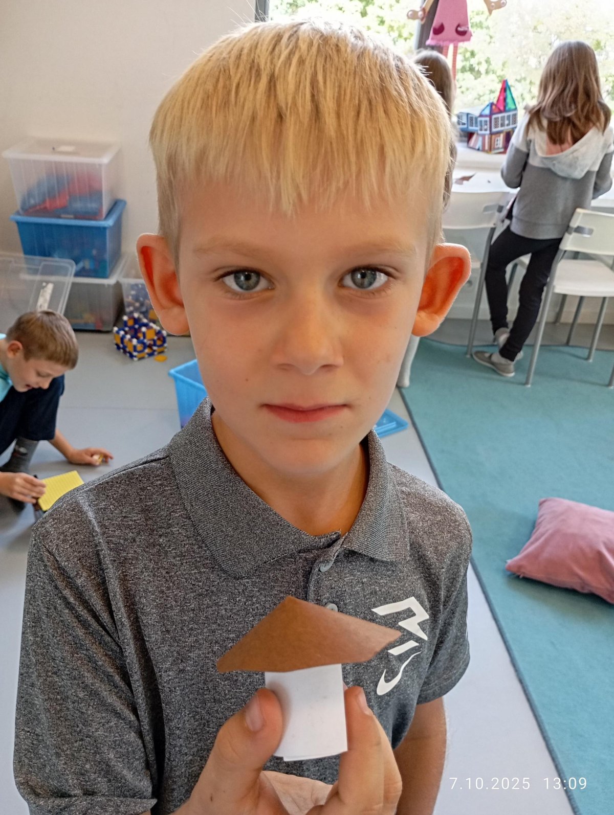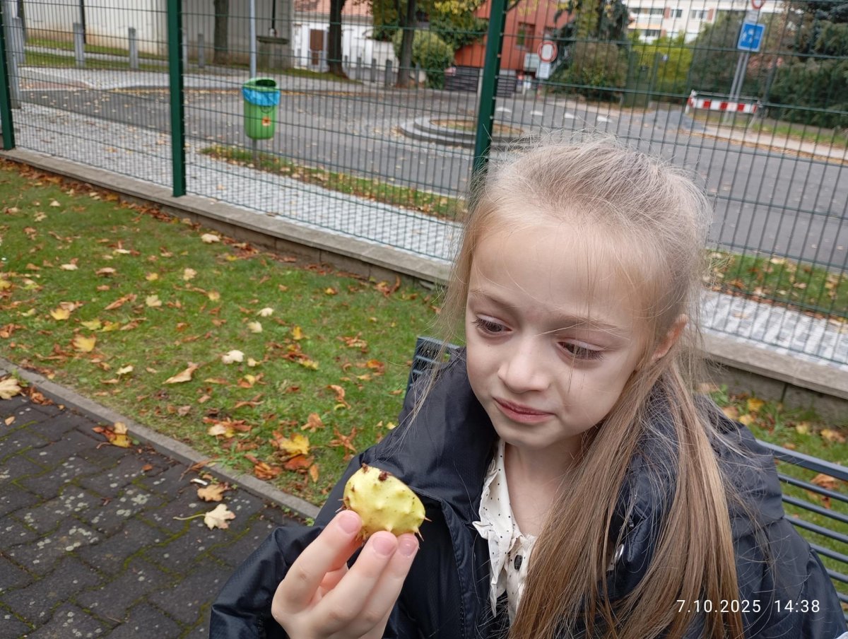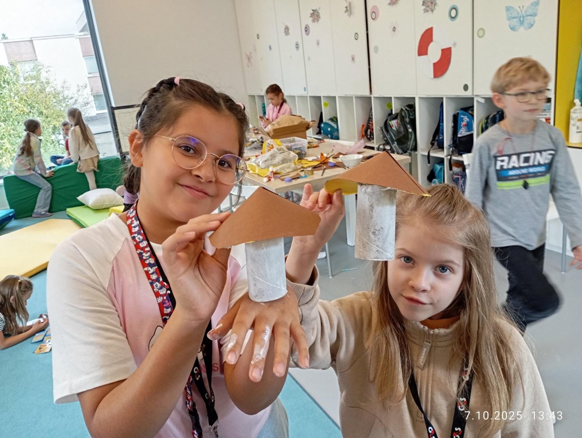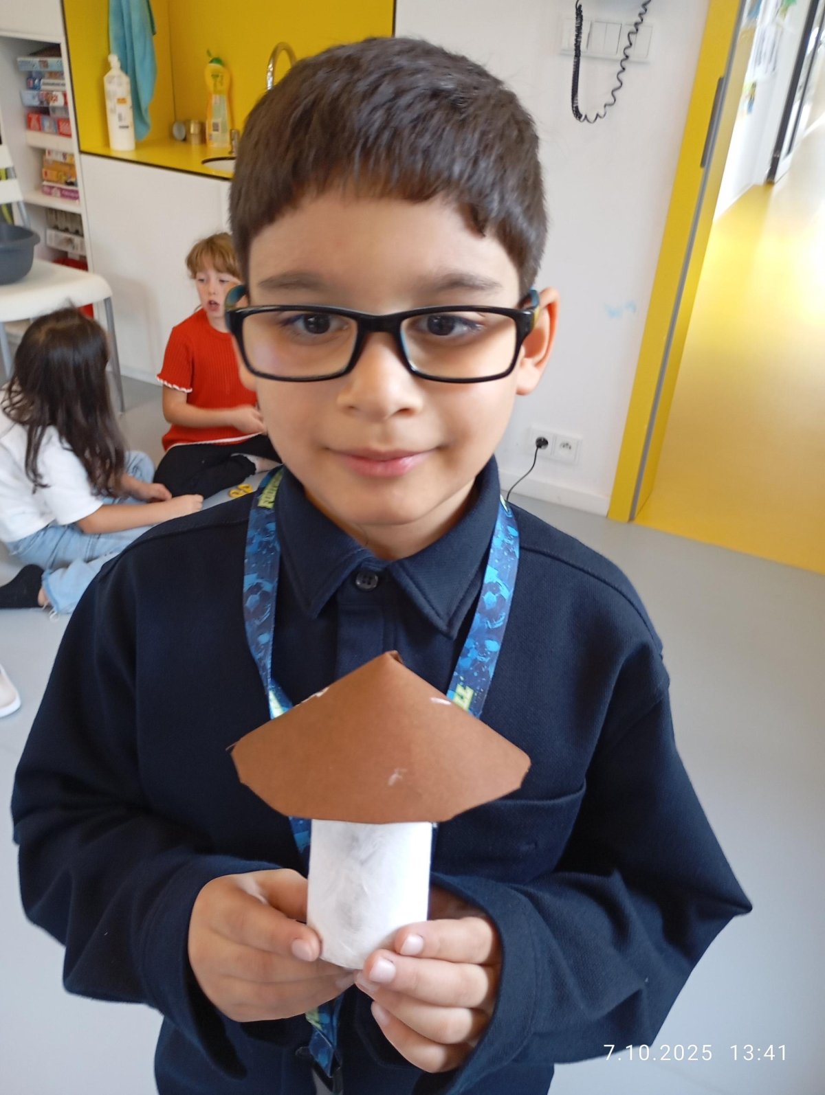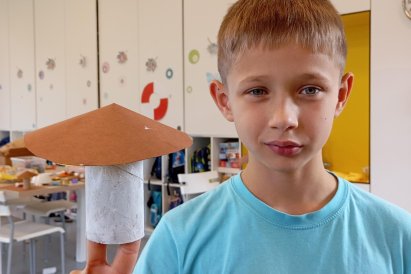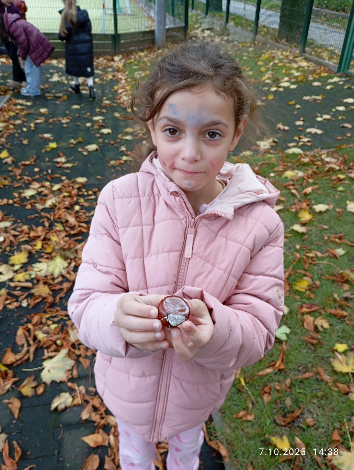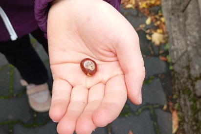Když jsme u těch hub, vyrobili jsme včera i hříbky. Tentokrát v 3D provedení. Vystříhly jsme kruhy, ze kterých vznikl po nastřižení a opětovném slepení klobouk, pak byl potřeba menší kroužek na ze žlutého papíru a spodek a nohu nám pomohly nahradit ruličky wc papíru. Prostorově ztvárnit houbu není jednoduché, ale děti si s tím poradily, trochu pomohla paní učitelka a trochu tavná pistole, a hřibky byly na světě. Samosebou, někteří dali přednost autíčkům, legu a magnetické stavebnici. venku si to pak užívali všichni, vydali jsme se totiž na hřiště u školy na kaštánky, pokusíme se vypěstovat sazenčky a třeba i zasadíme stromky.