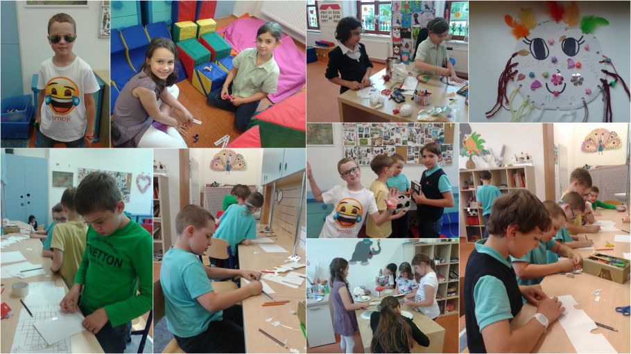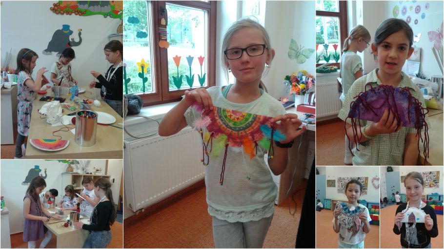 Dnes se z nás stali indiáni. Vyrobili jsme si indiánsky bubínek. Nejdřív jsme si vymalovali papírový talířek, pak jsme ho slepili a nasypali tam rýži nebo hrách. Když jsme talířek zalepili, udělali jsme si dírky a do nich natálhli barevnou vlnu s korálky. Hotový bubínek jsme vyzdobili pírky a začali jsme hrát a zpívat. Děti se smály, když jsem jim zaspívala lidovou písničku a zahrála na bubínek.