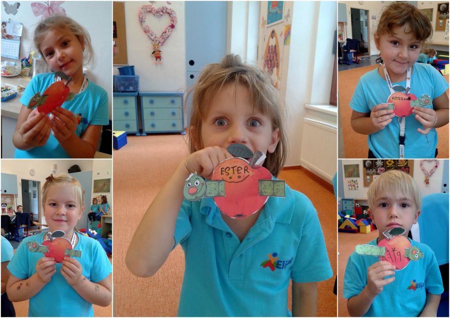 Podzimní jablíčka jíme skoro denne a může se stát, že se v nich objeví také housenka. Takové jablíčko jsme si dnes vyrobili a nalepili do oken družiny.