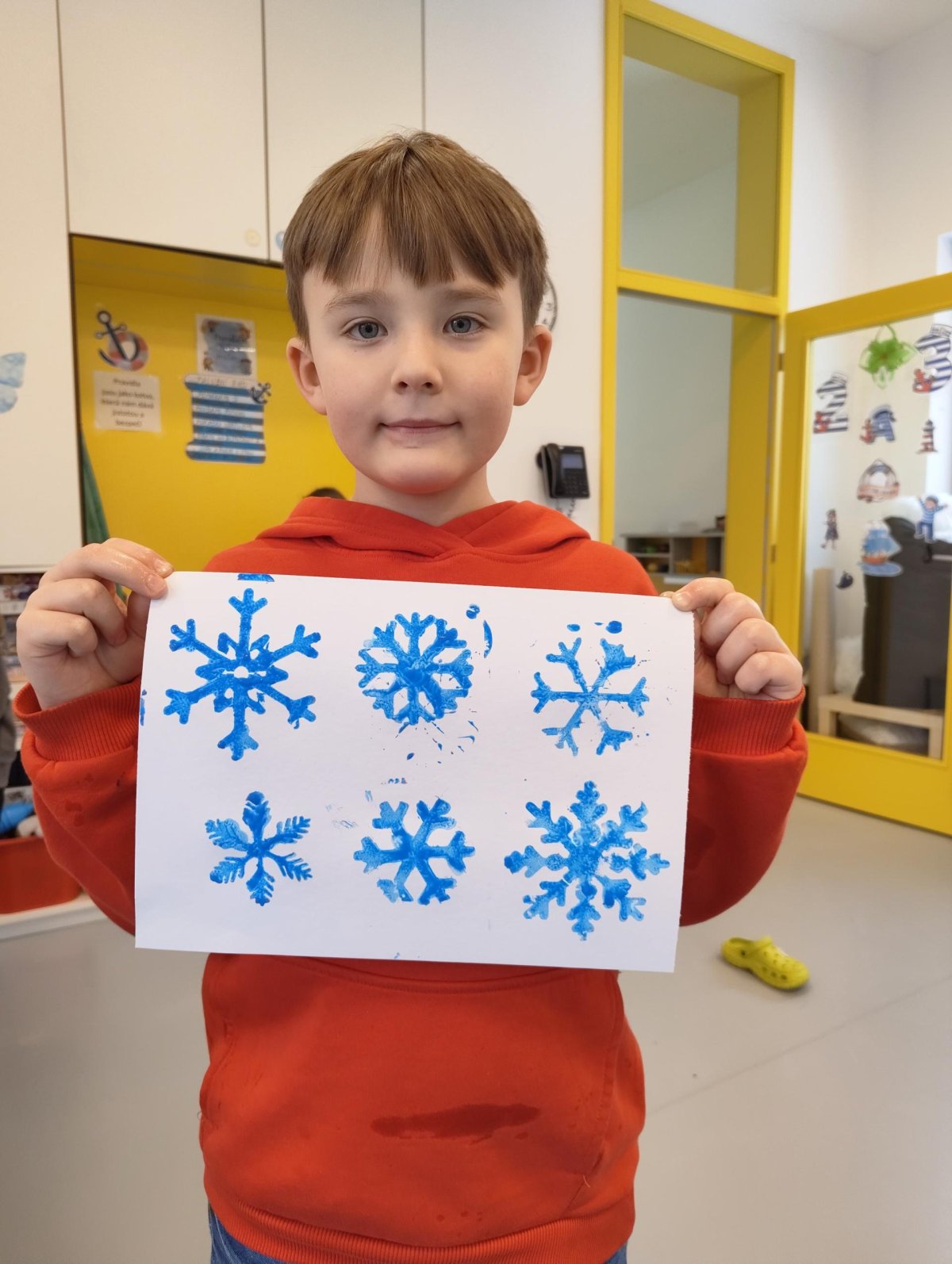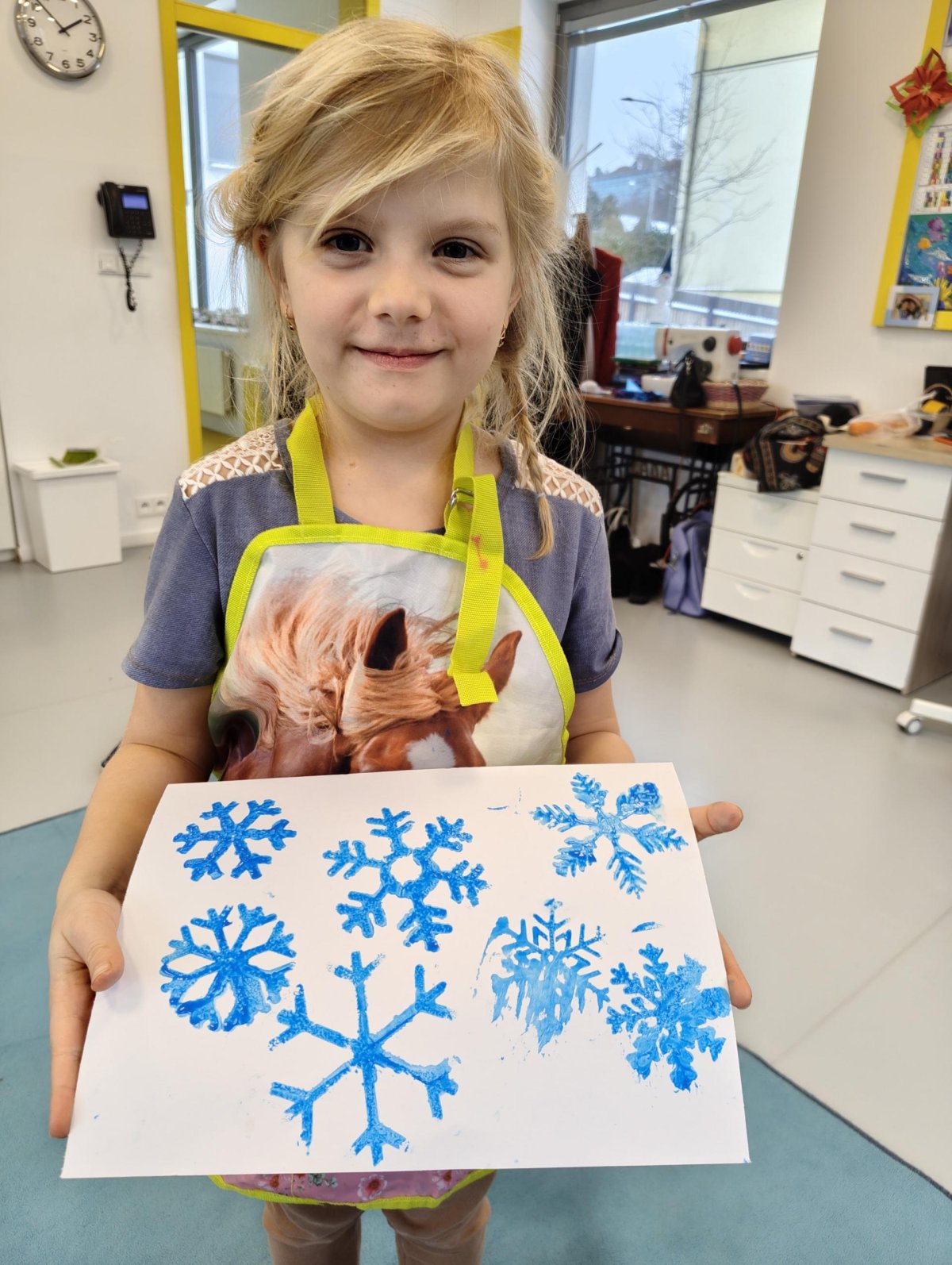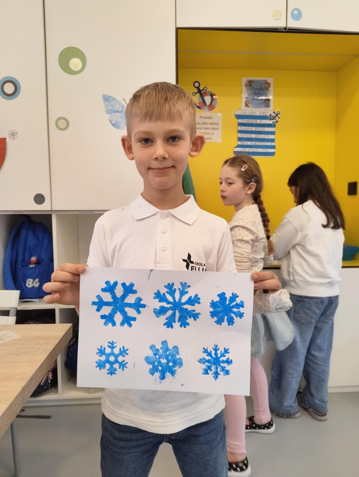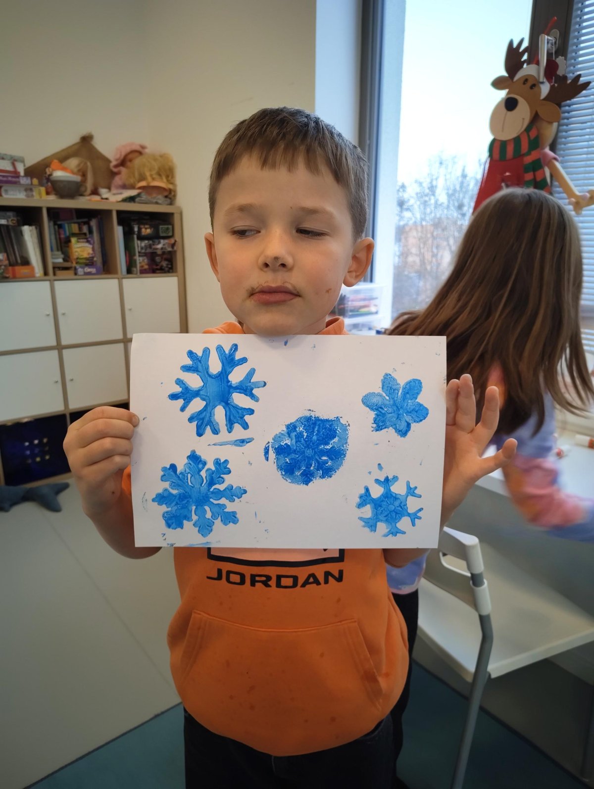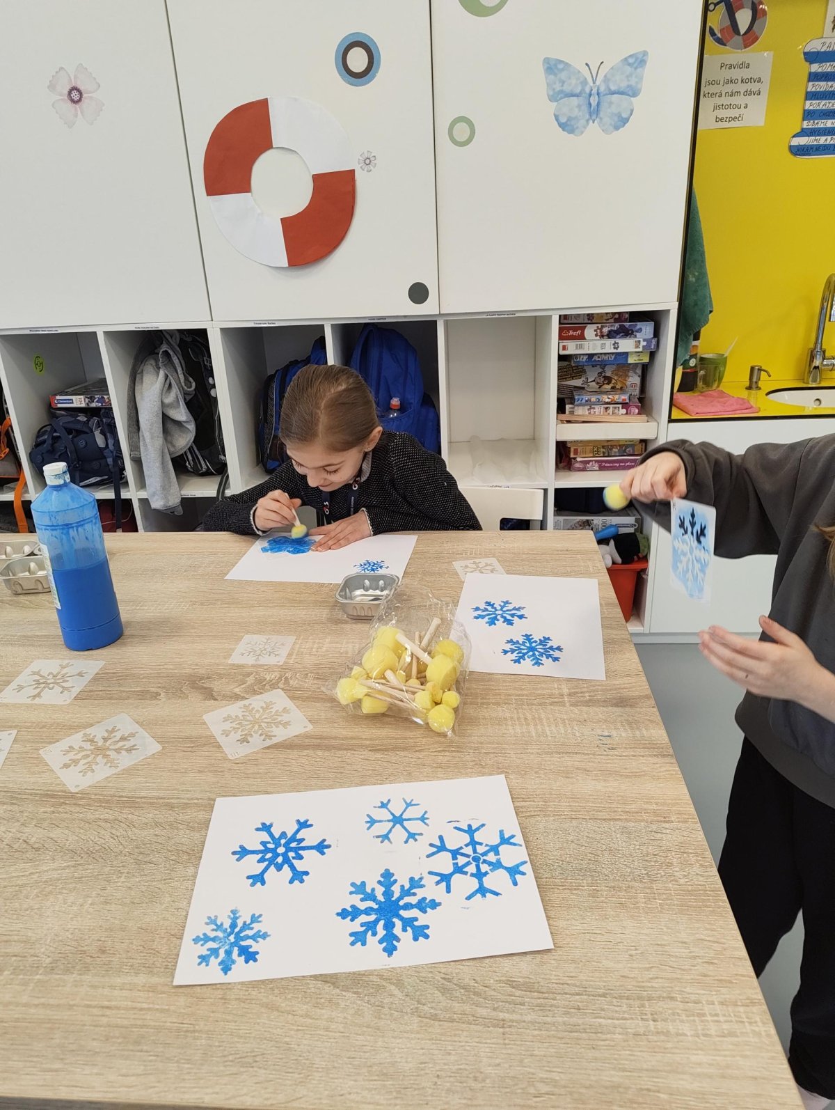 Dnes jsme si vyráběli vločky – na karton jsme obtiskovali šablonky vloček a moc nás to bavilo. Potom jsme se teple oblékli a šli jsme ven užívat si zimní radovánky.