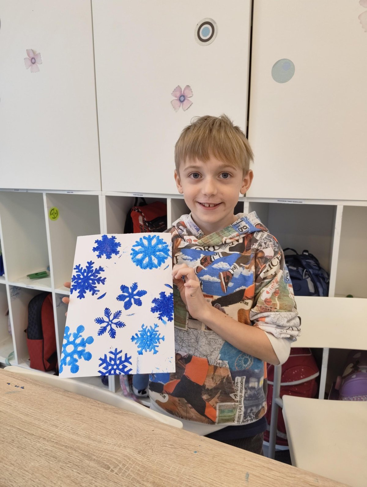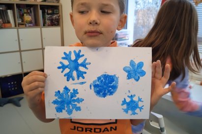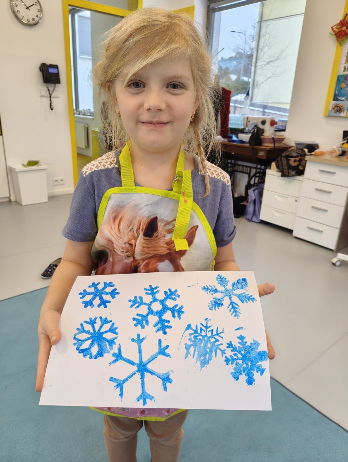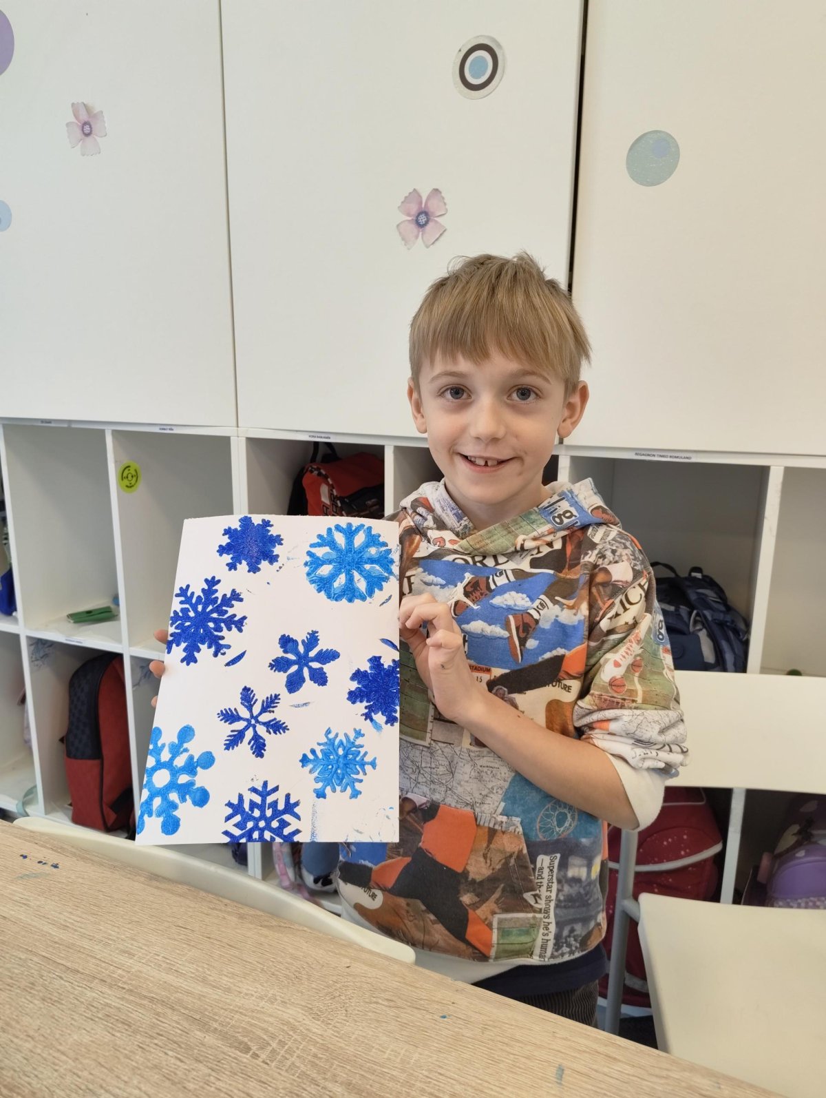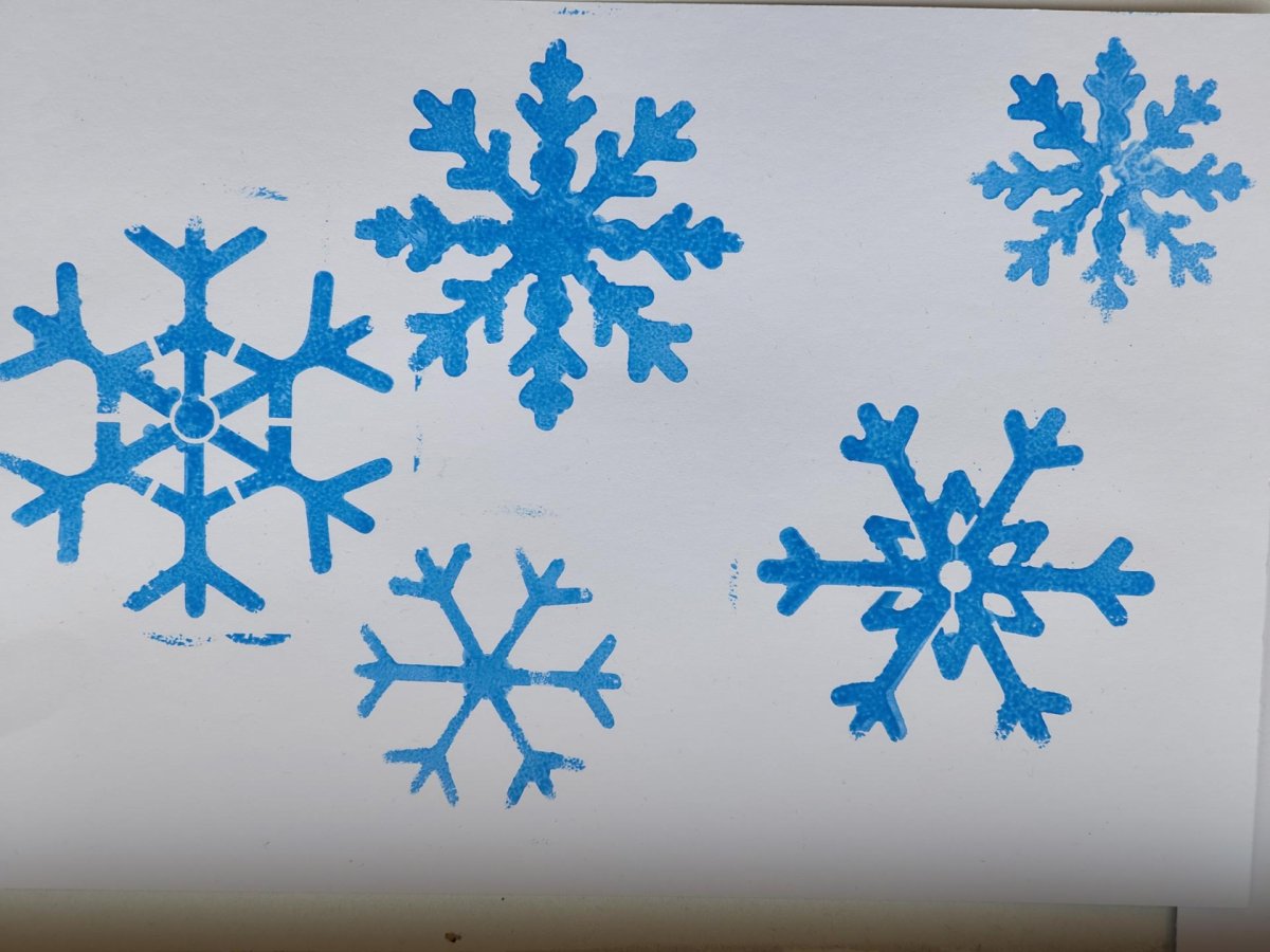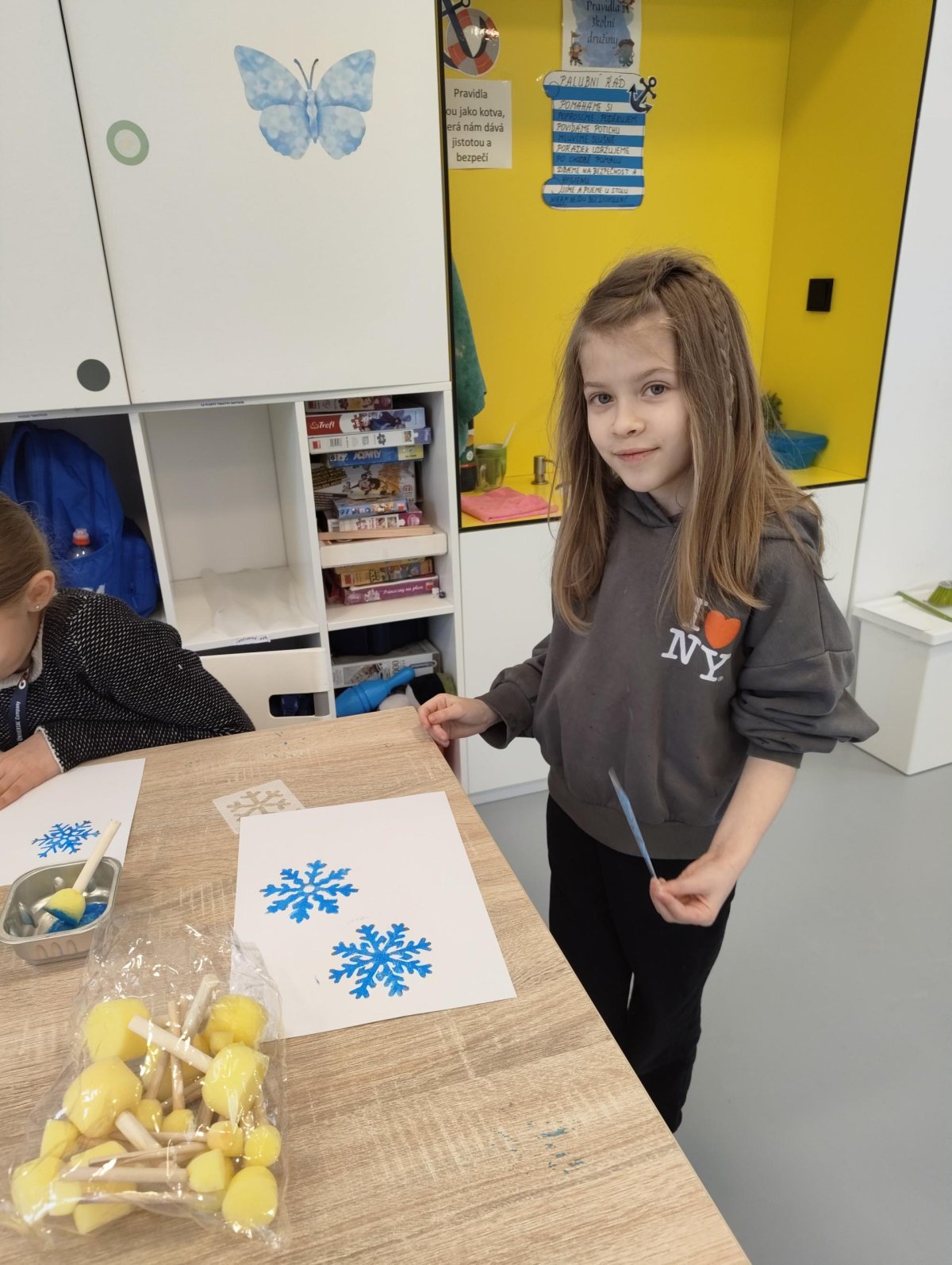 Dnes jsme si vyráběli vločky – na karton jsme obtiskovali šablonky vloček a moc nás to bavilo. Potom jsme se teple oblékli a šli jsme ven užívat si zimní radovánky.