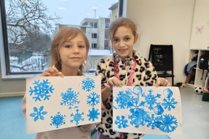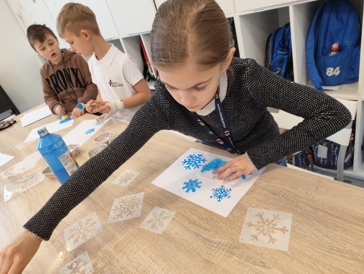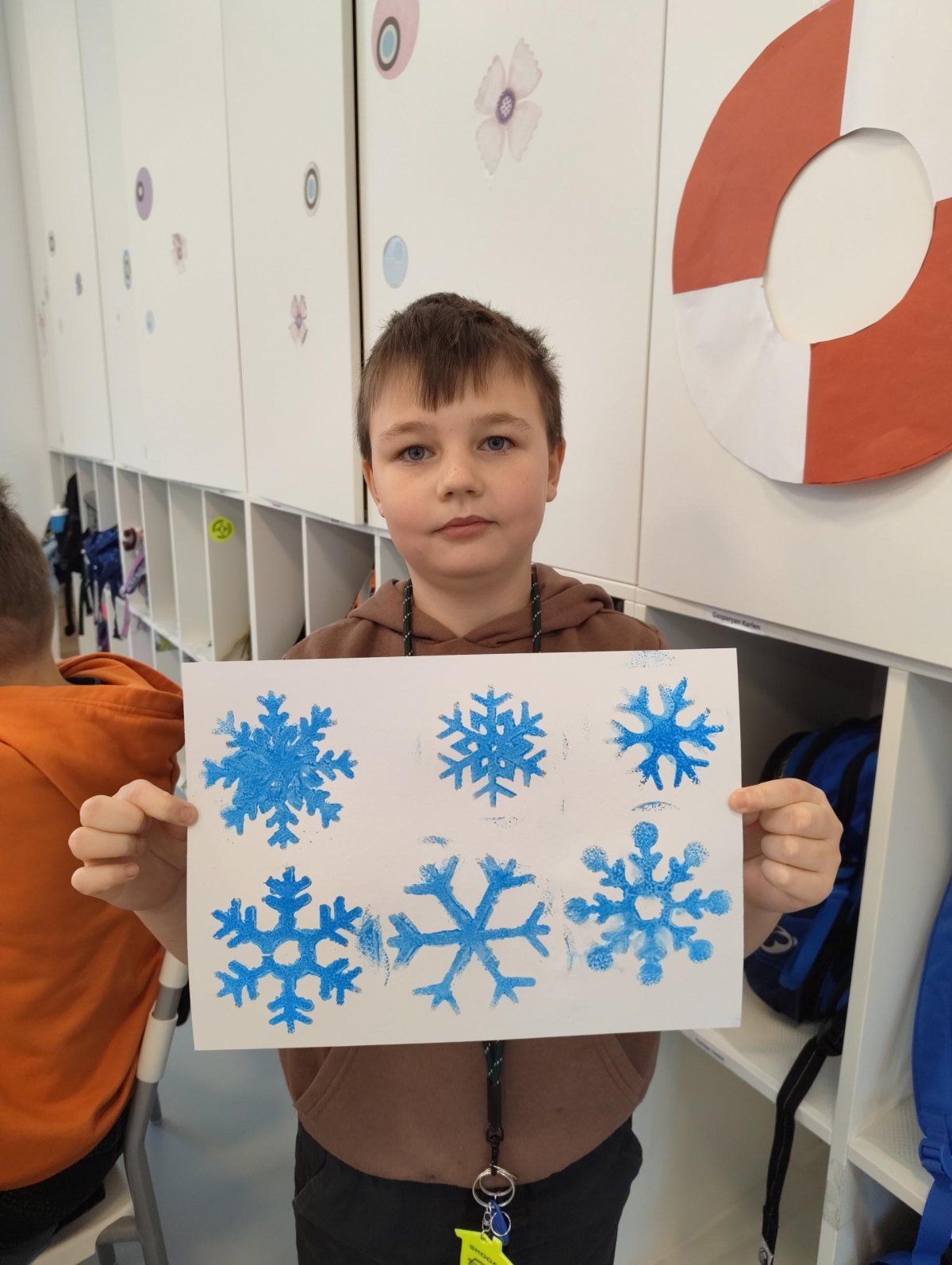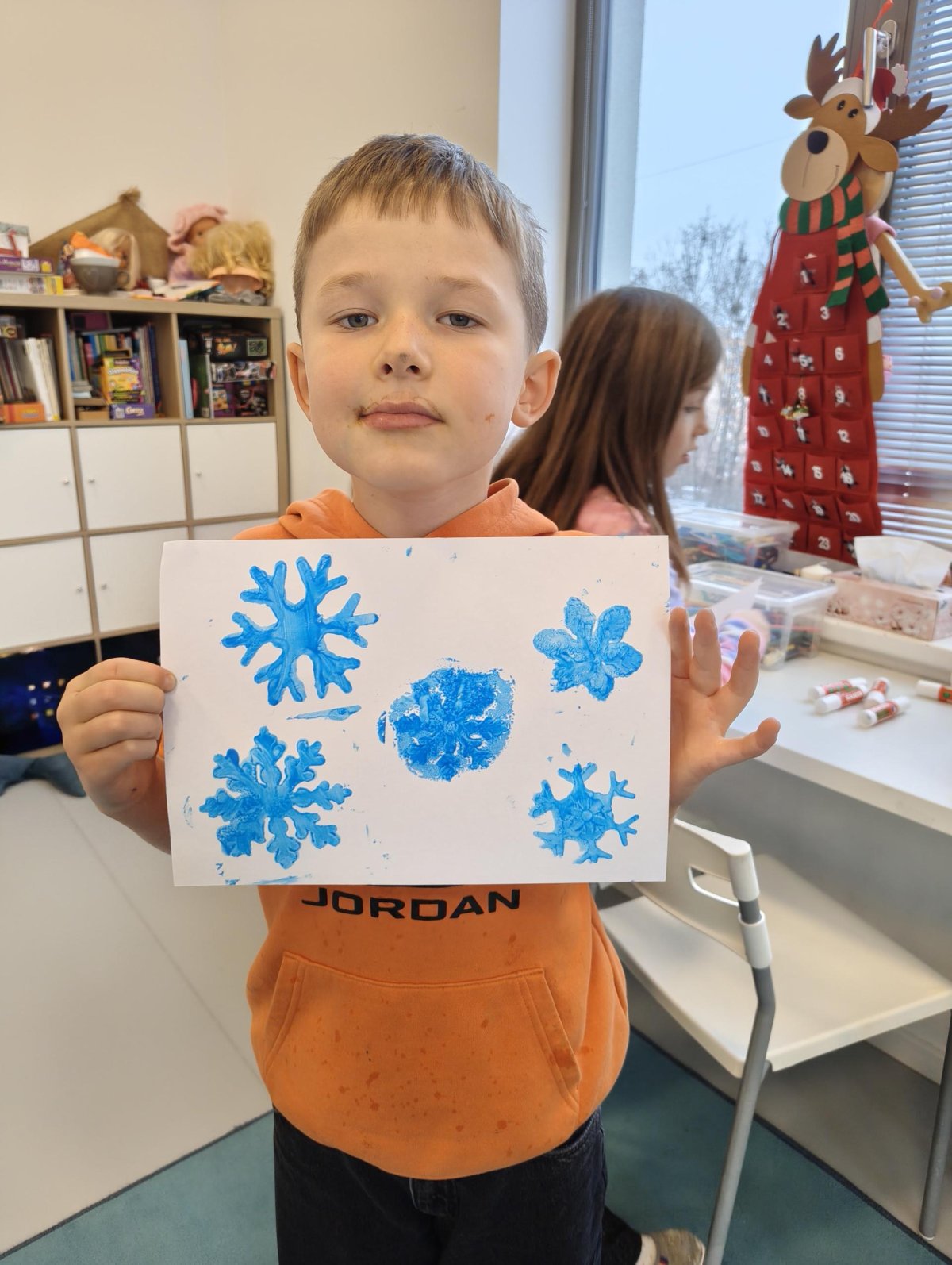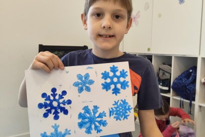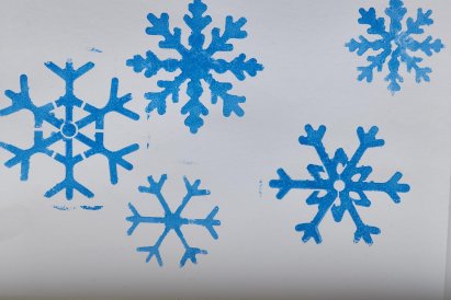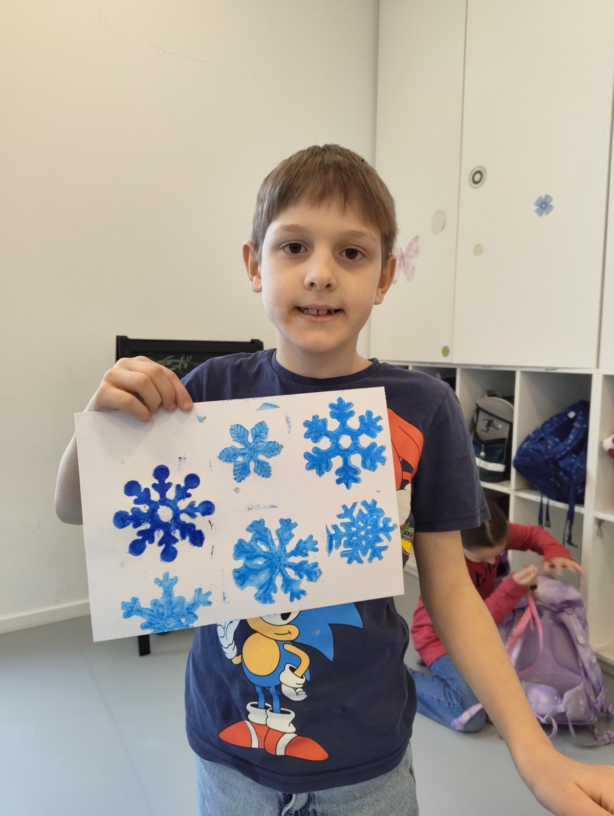 Dnes jsme si vyráběli vločky – na karton jsme obtiskovali šablonky vloček a moc nás to bavilo. Potom jsme se teple oblékli a šli jsme ven užívat si zimní radovánky.