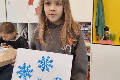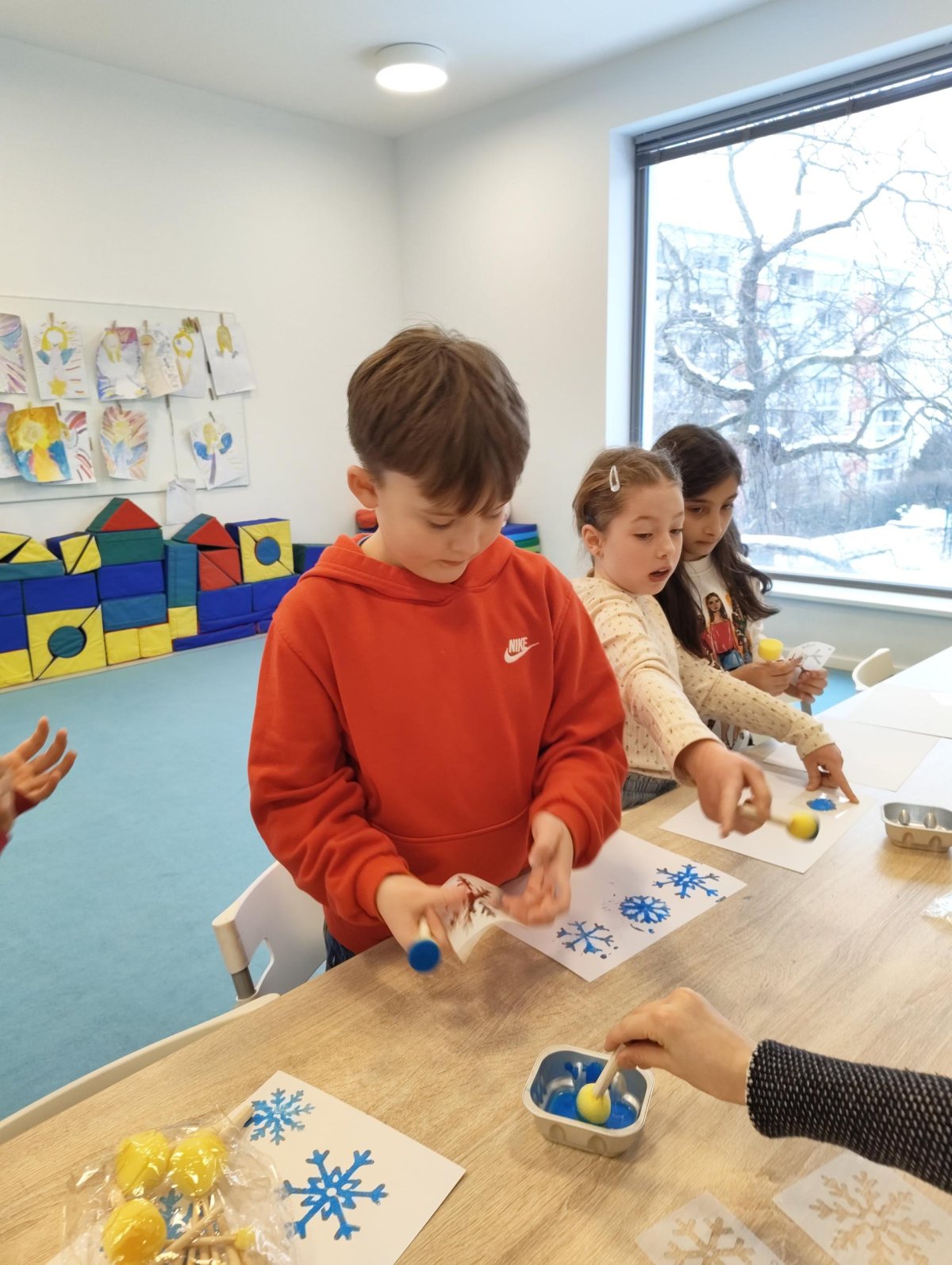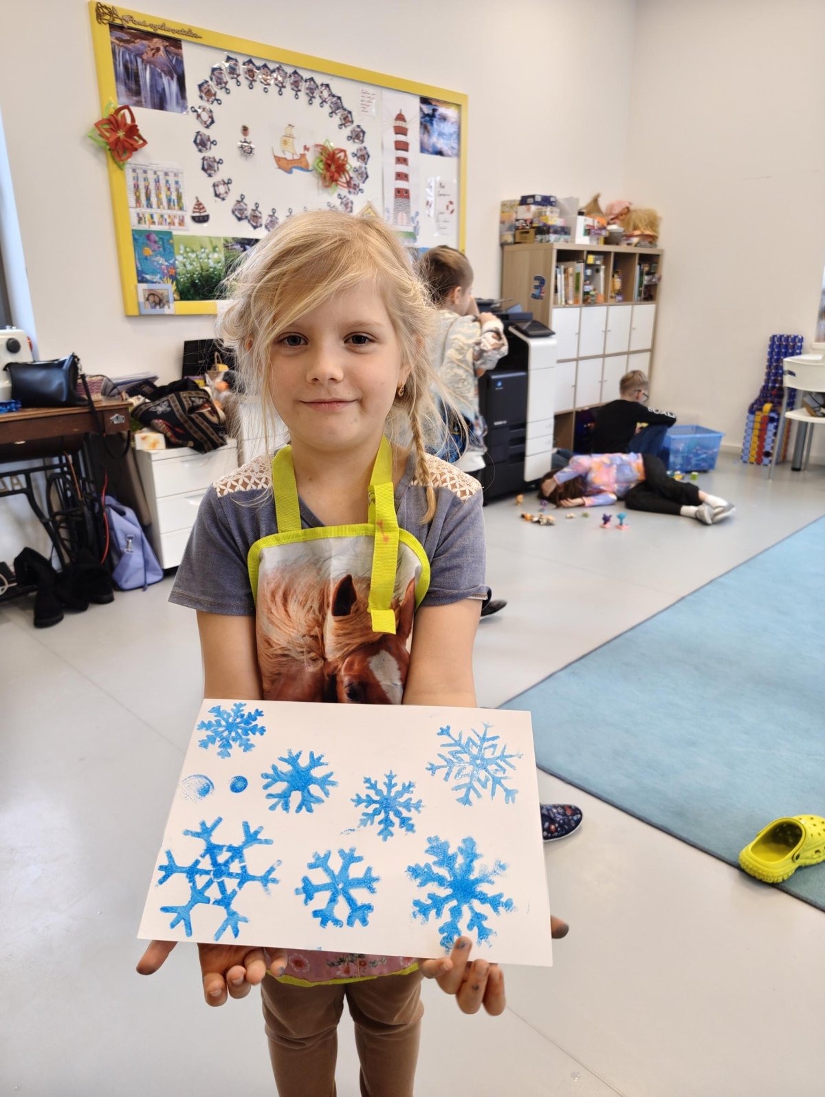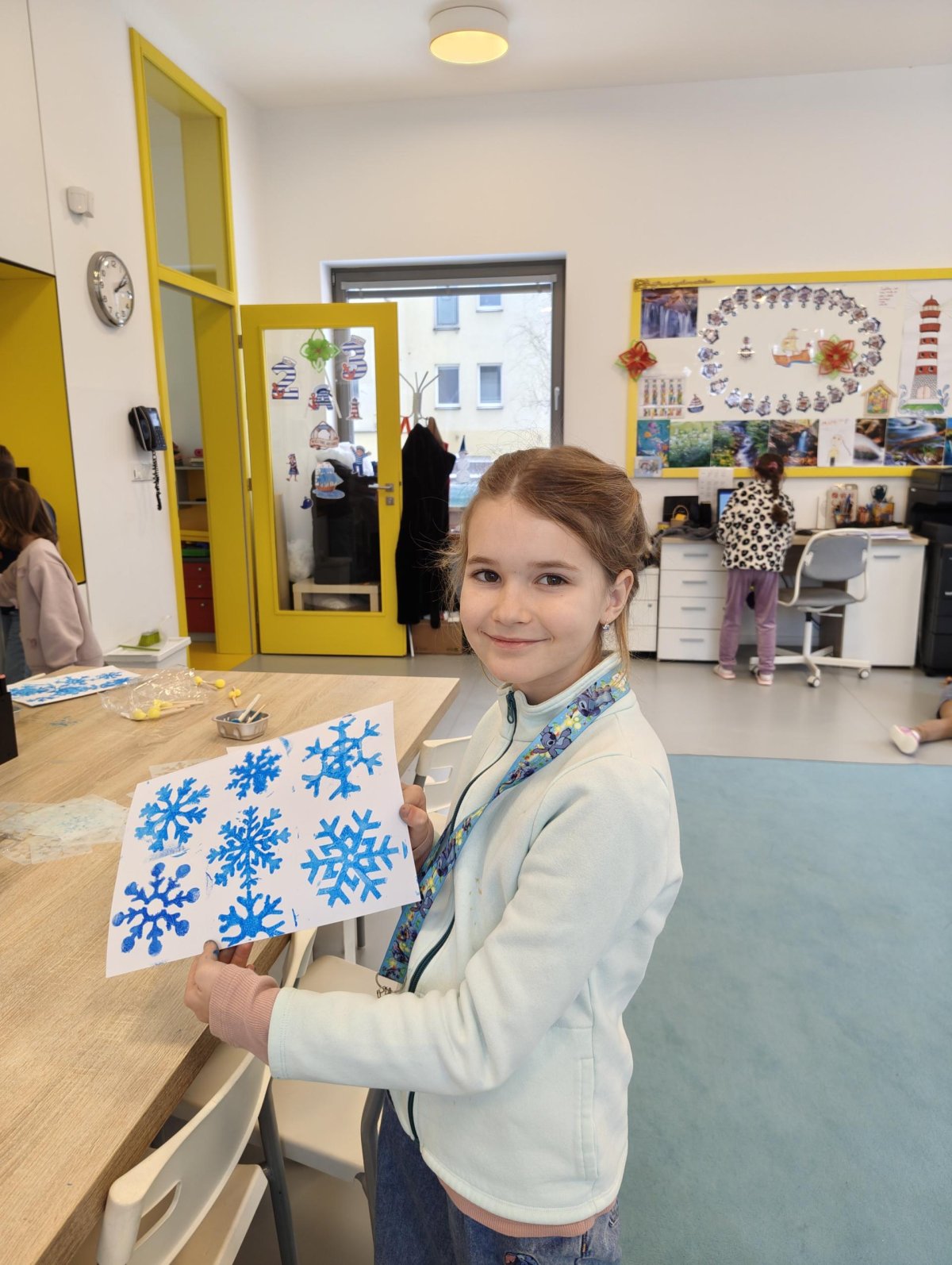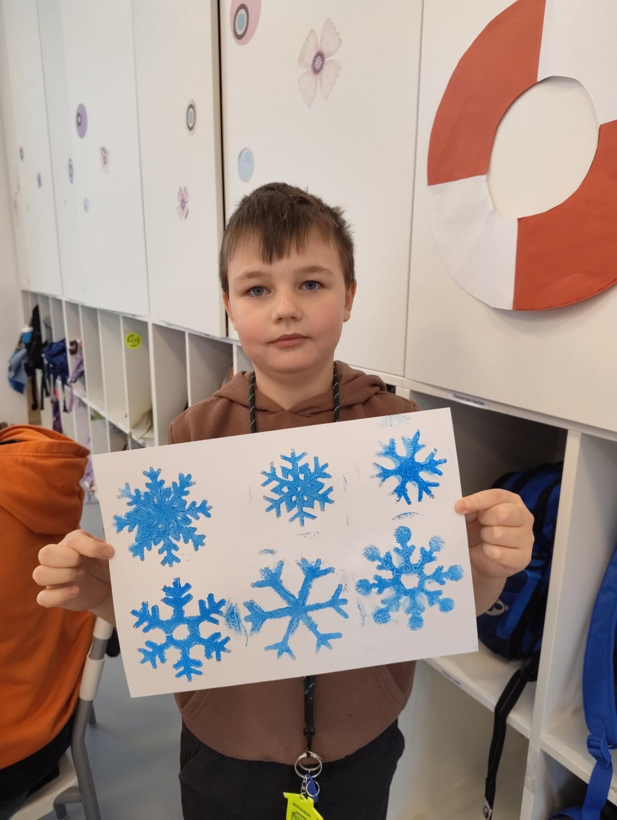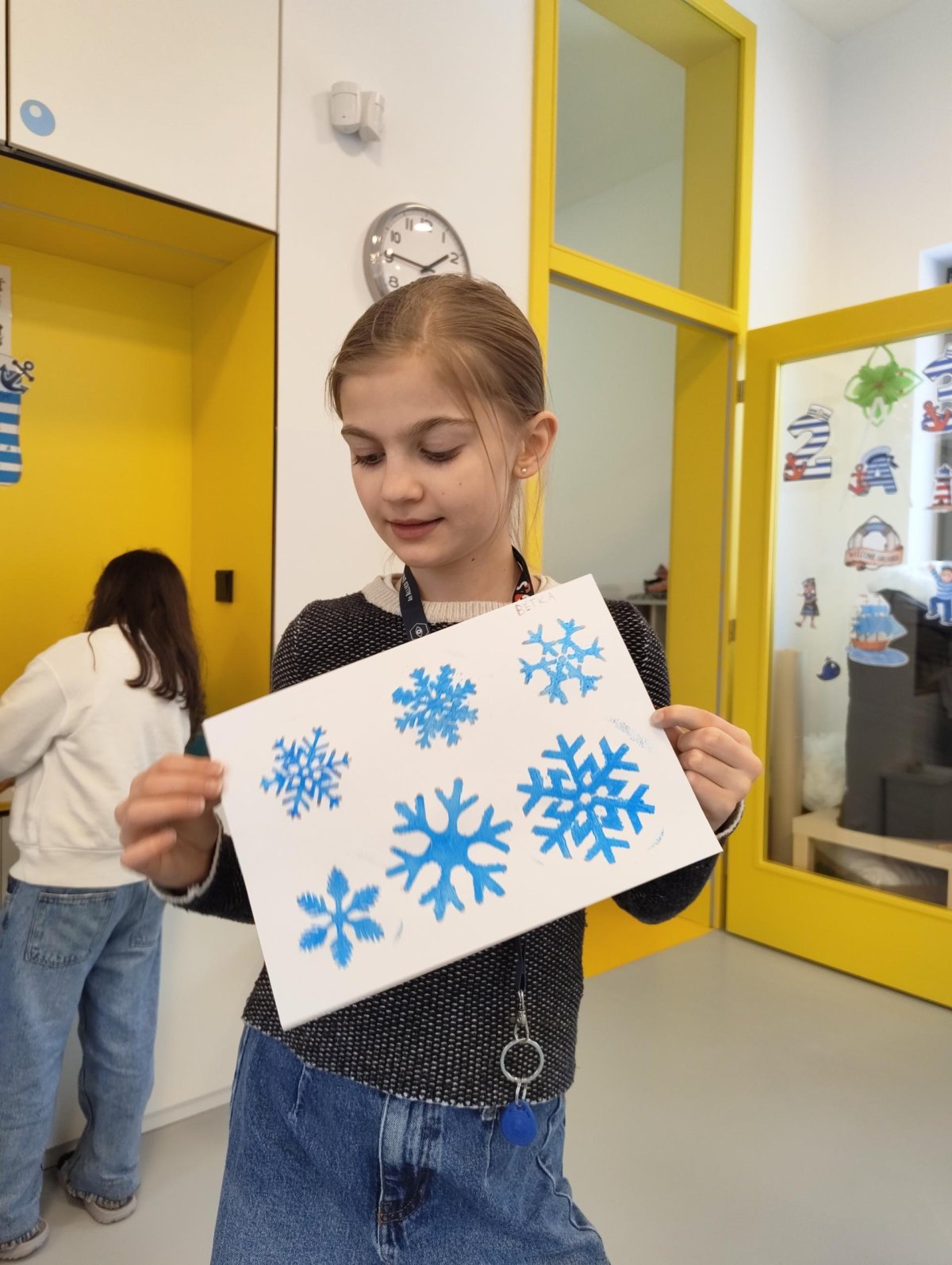 Dnes jsme si vyráběli vločky – na karton jsme obtiskovali šablonky vloček a moc nás to bavilo. Potom jsme se teple oblékli a šli jsme ven užívat si zimní radovánky.