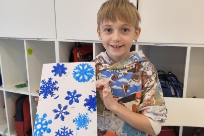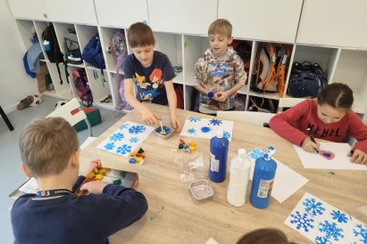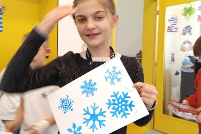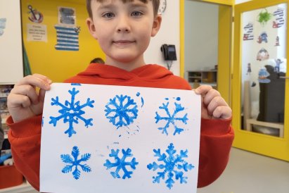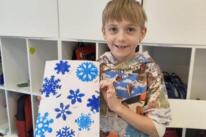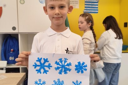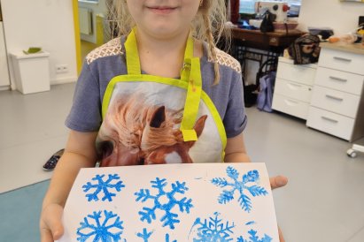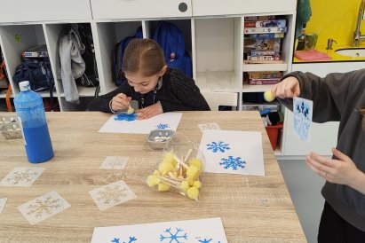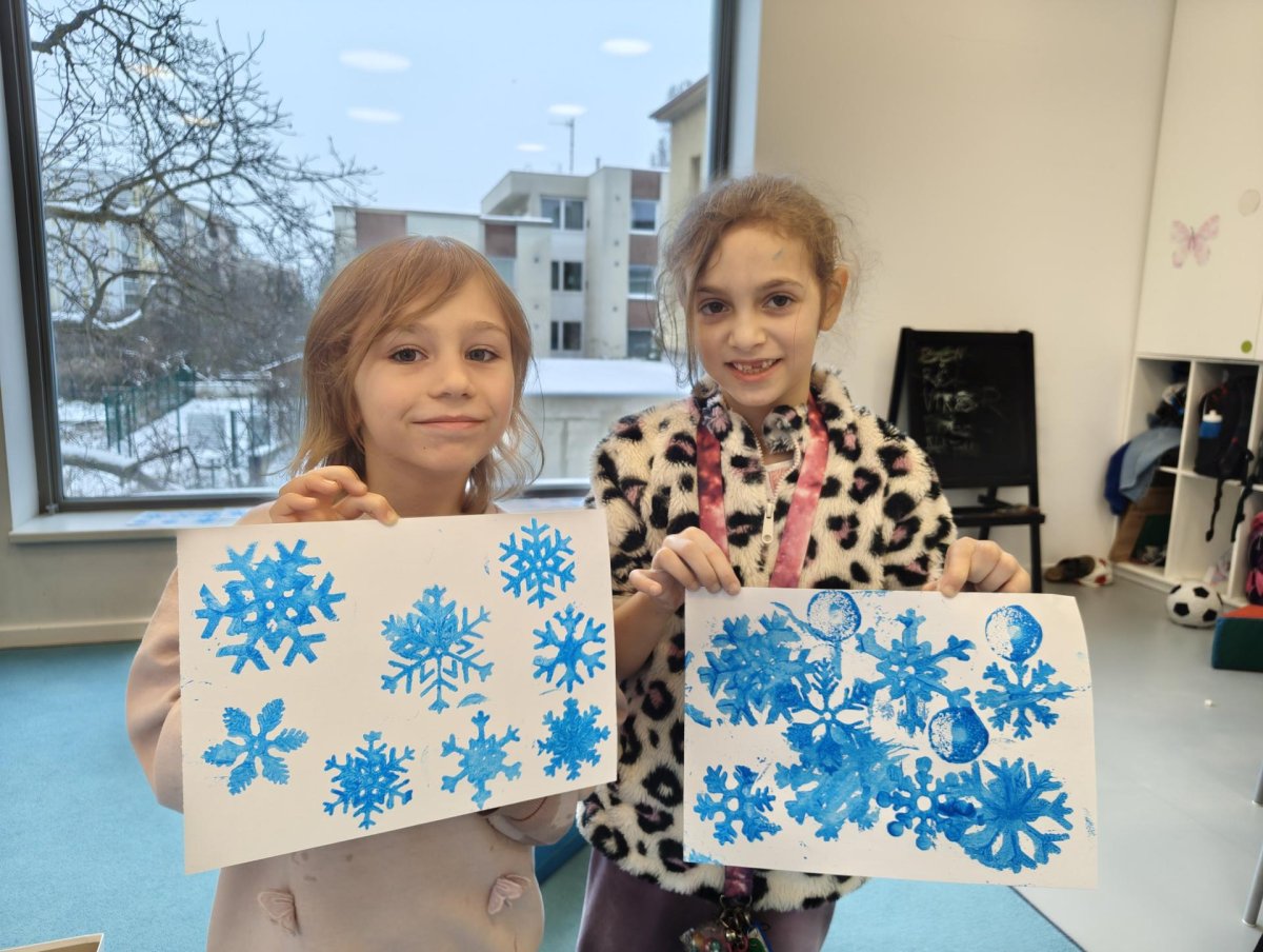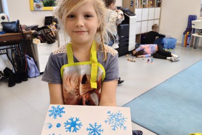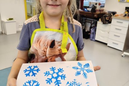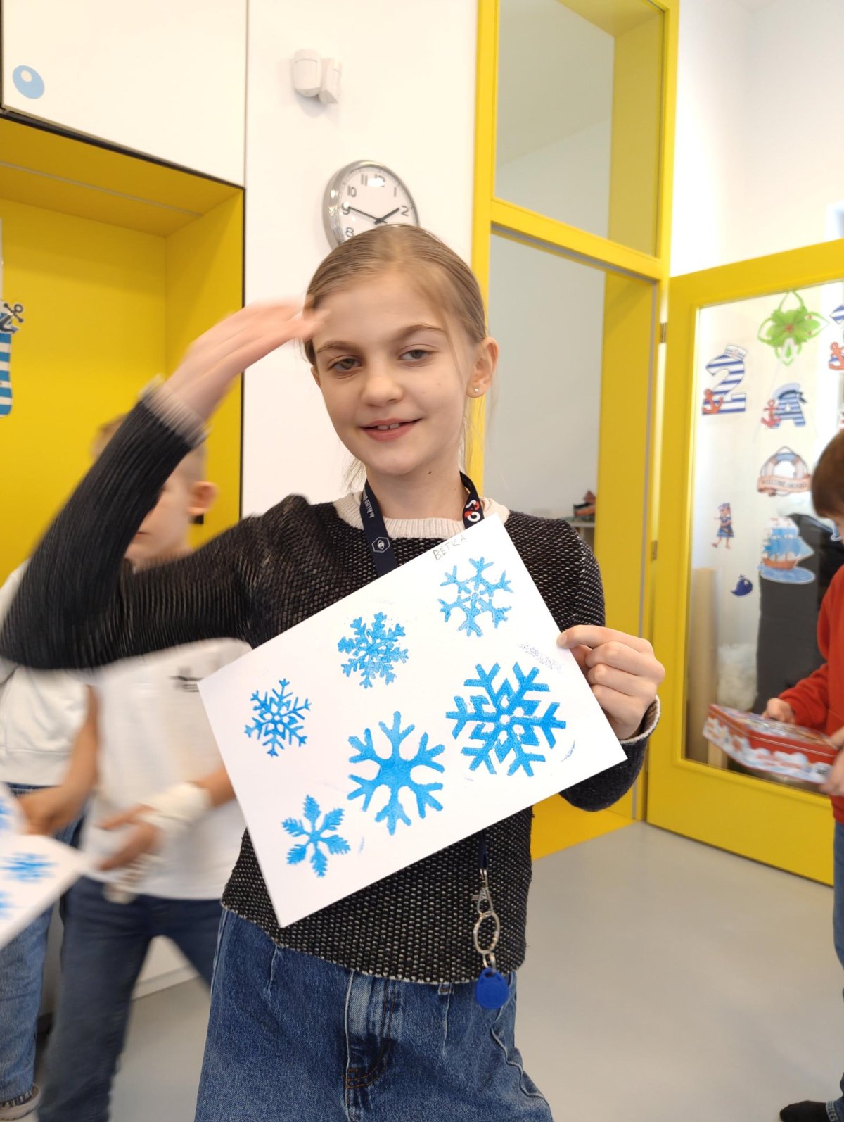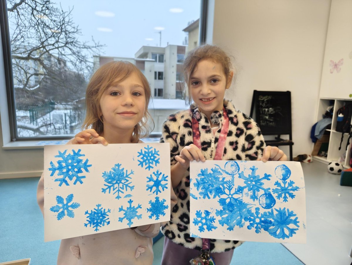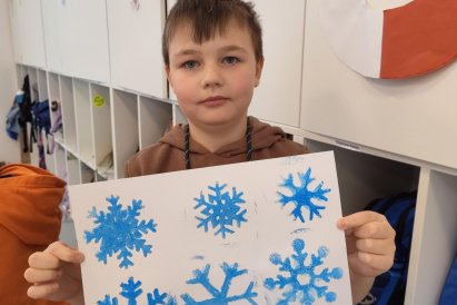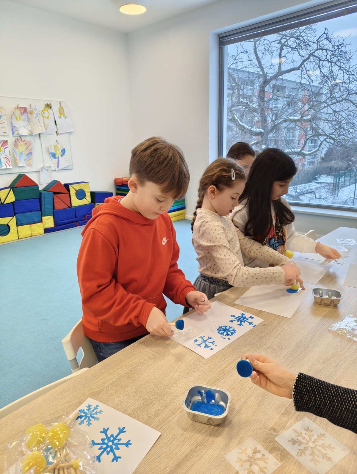 Dnes jsme si vyráběli vločky – na karton jsme obtiskovali šablonky vloček a moc nás to bavilo. Potom jsme se teple oblékli a šli jsme ven užívat si zimní radovánky.
