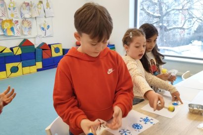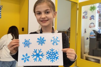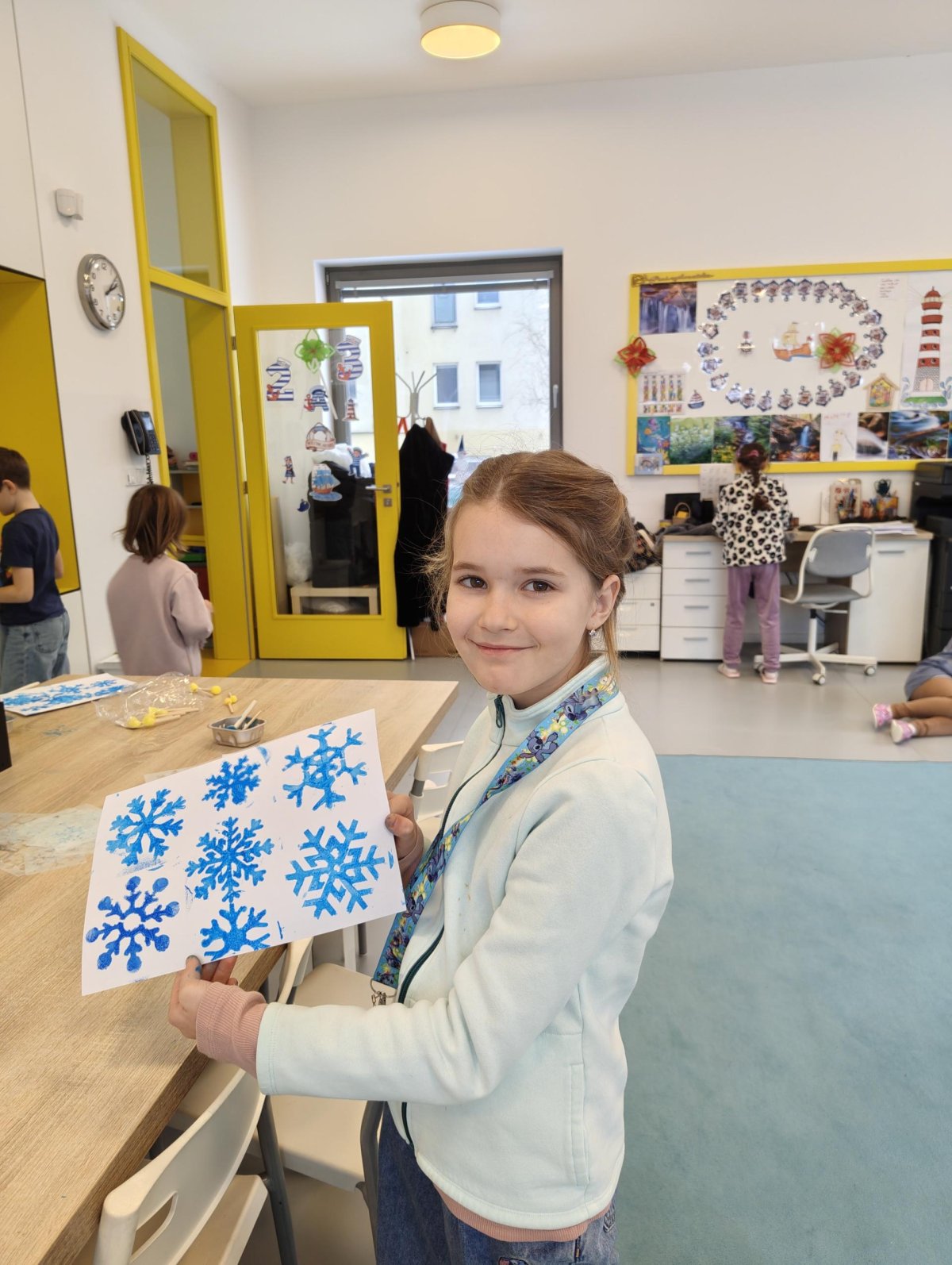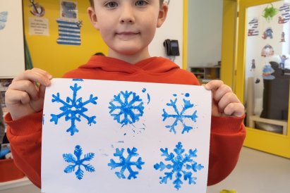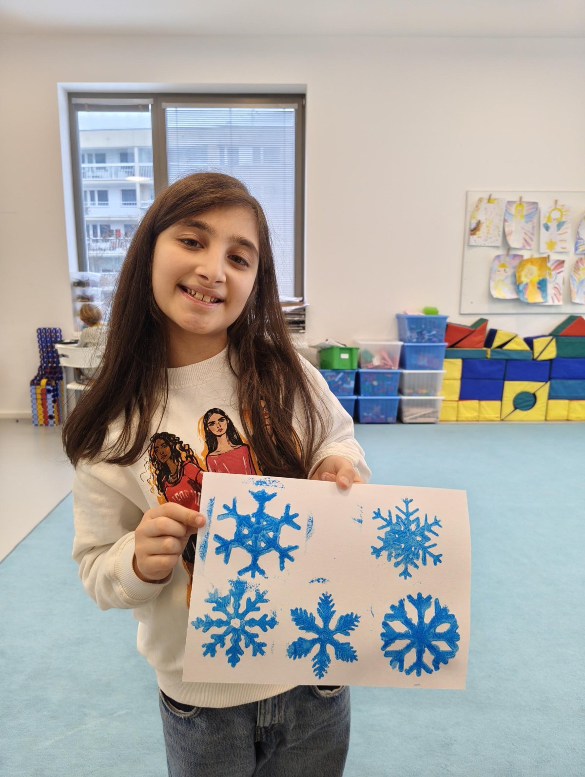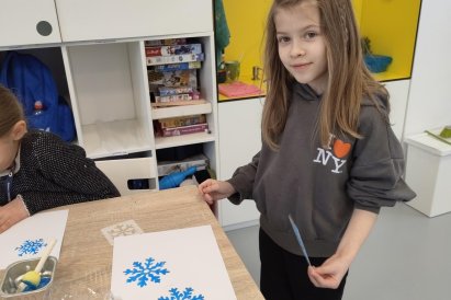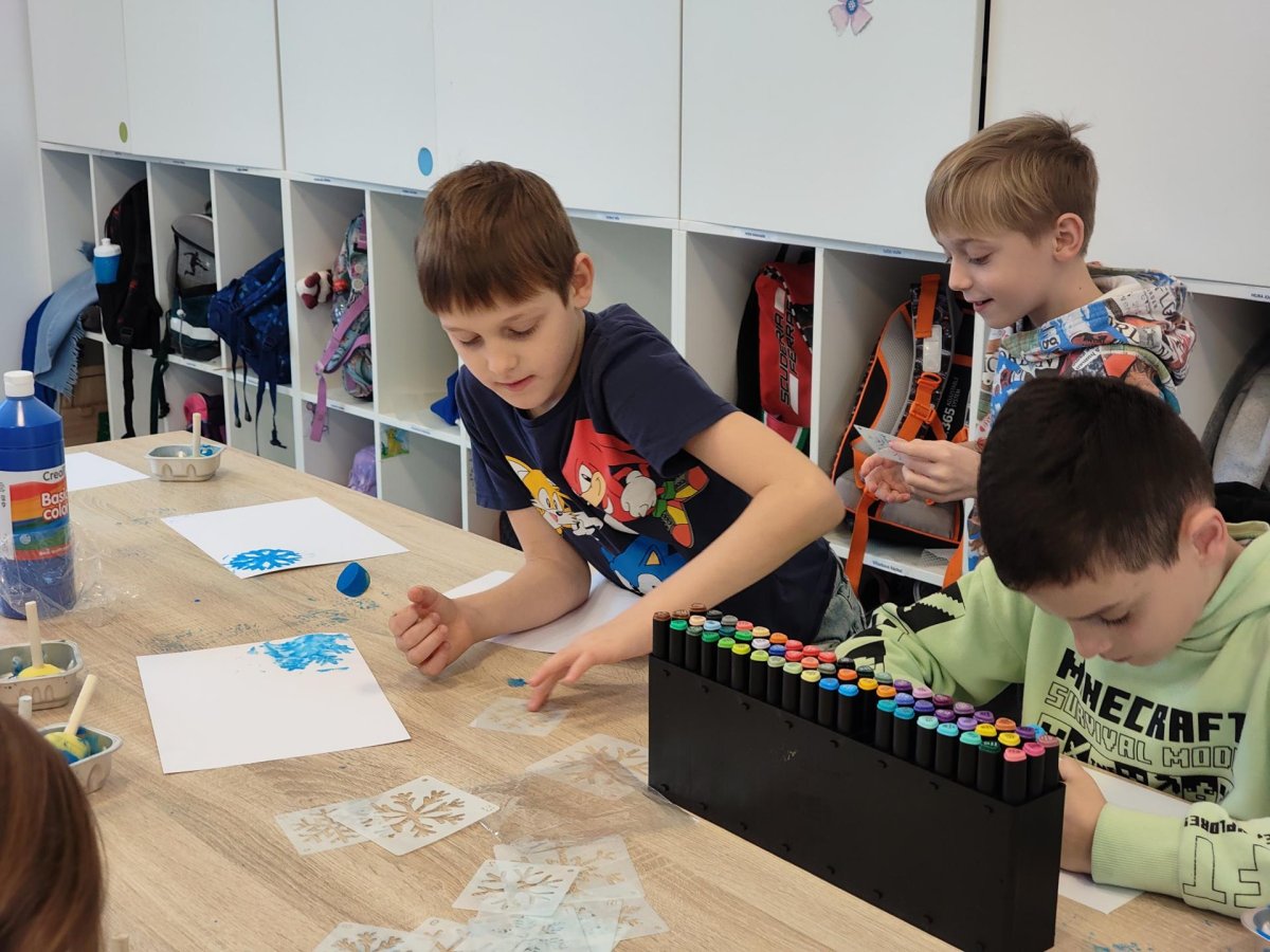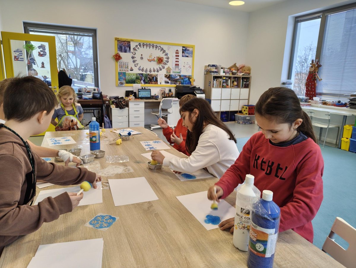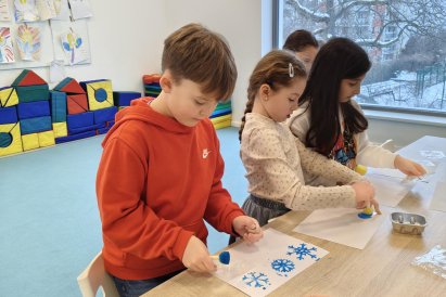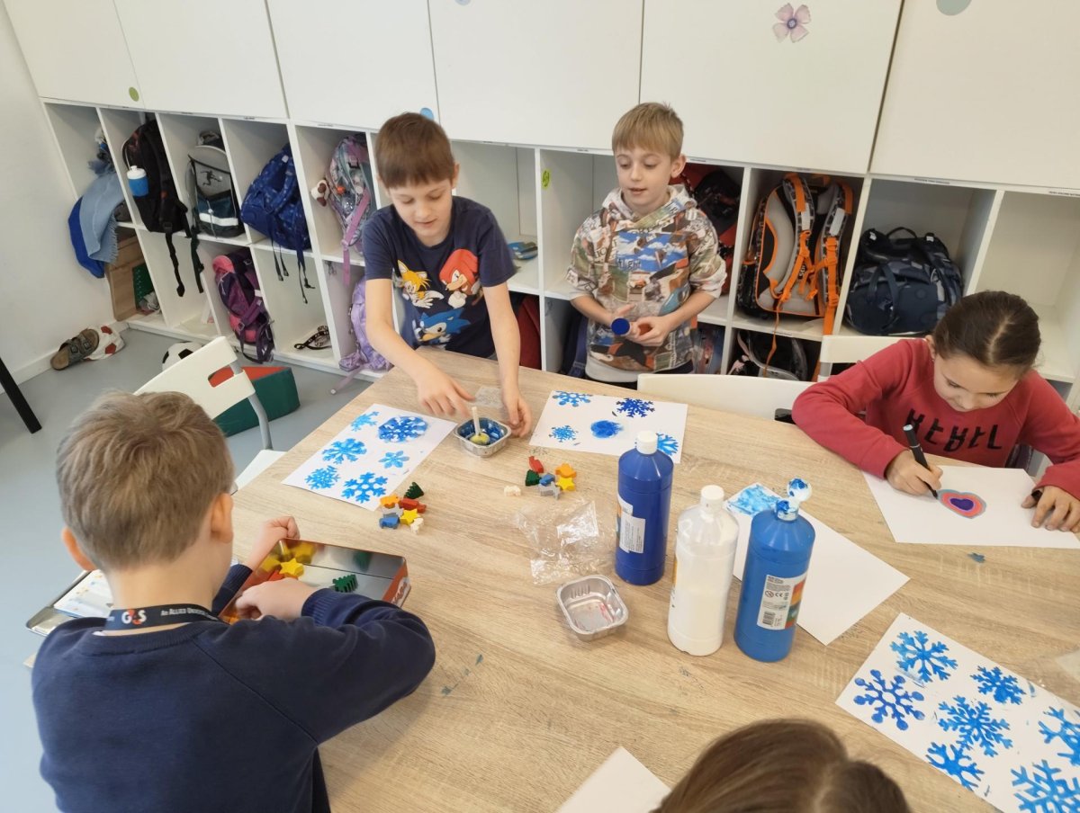 Dnes jsme si vyráběli vločky – na karton jsme obtiskovali šablonky vloček a moc nás to bavilo. Potom jsme se teple oblékli a šli jsme ven užívat si zimní radovánky.