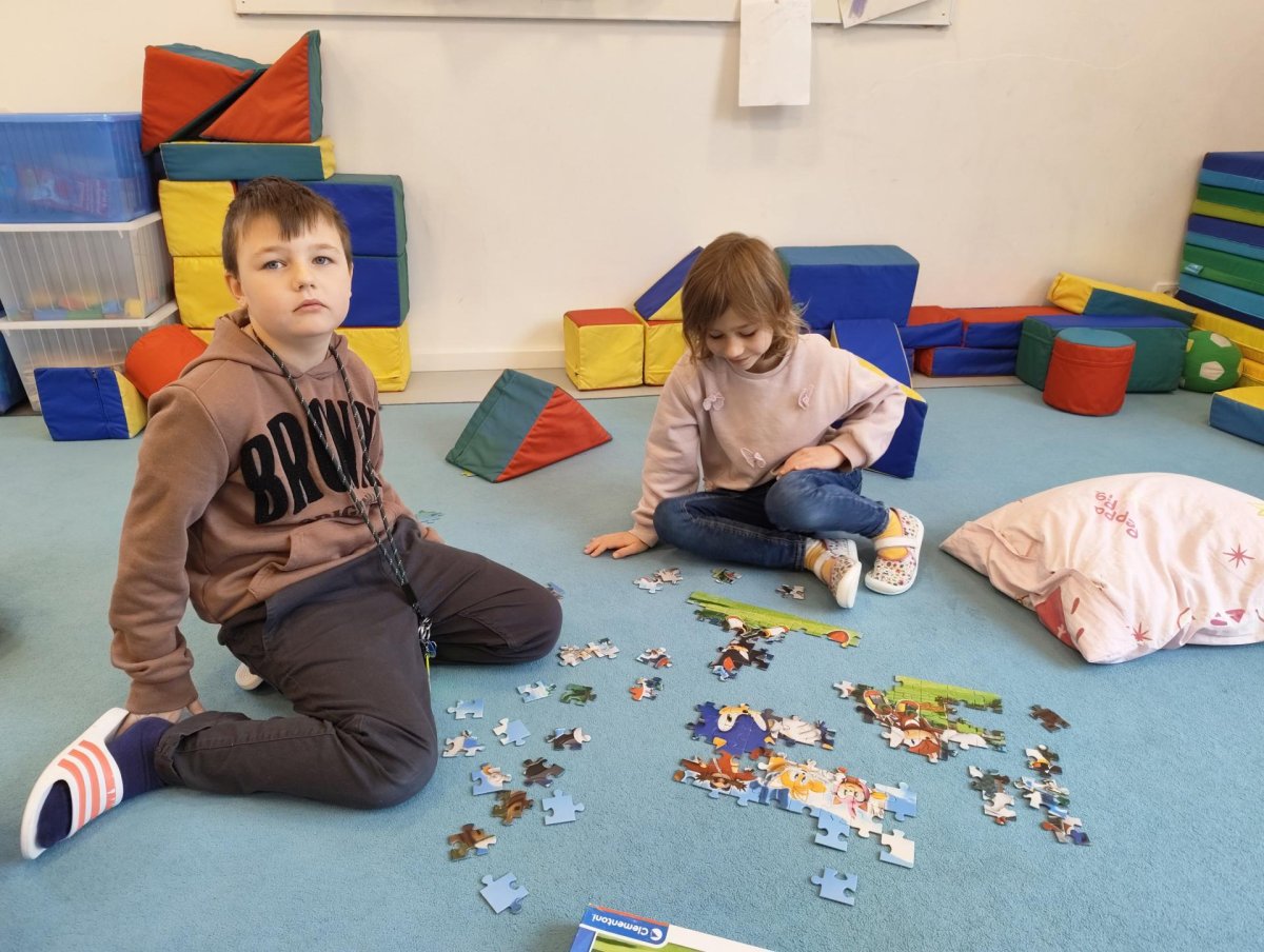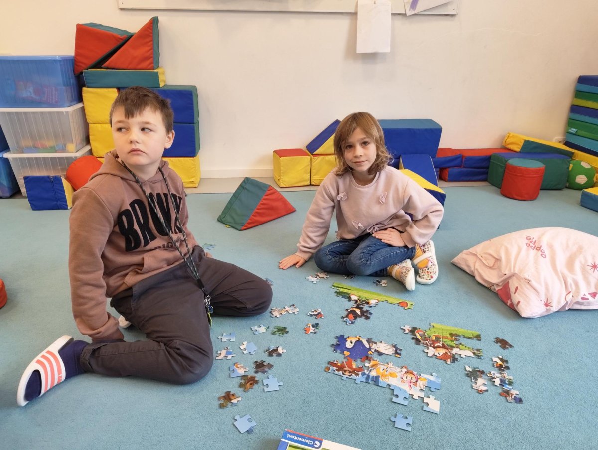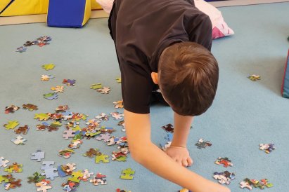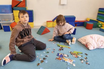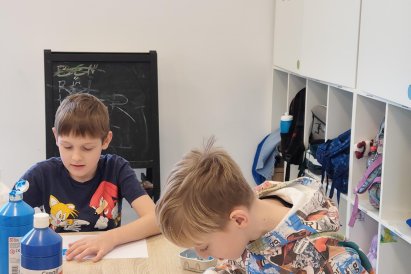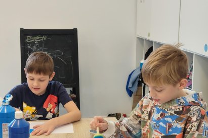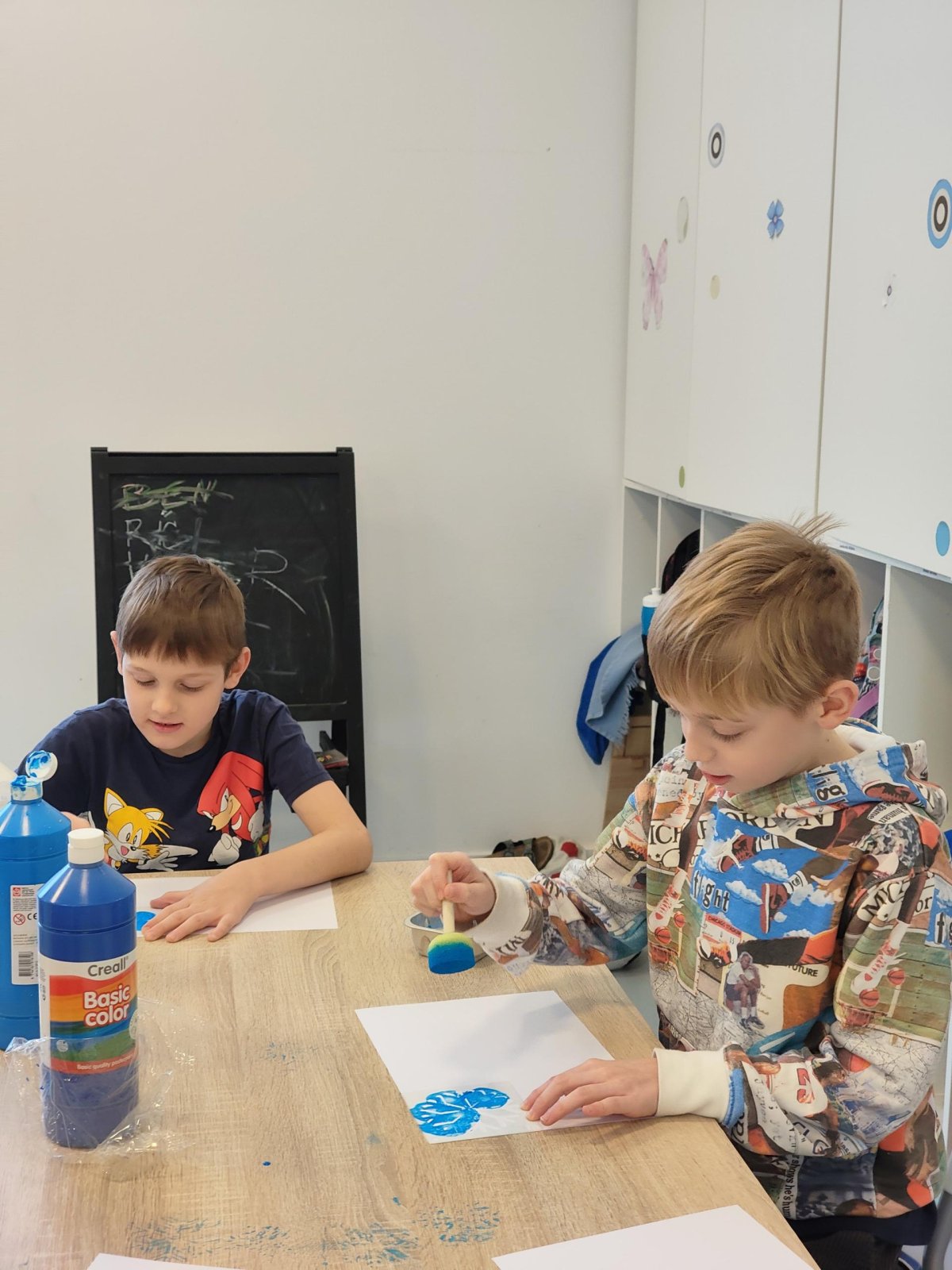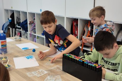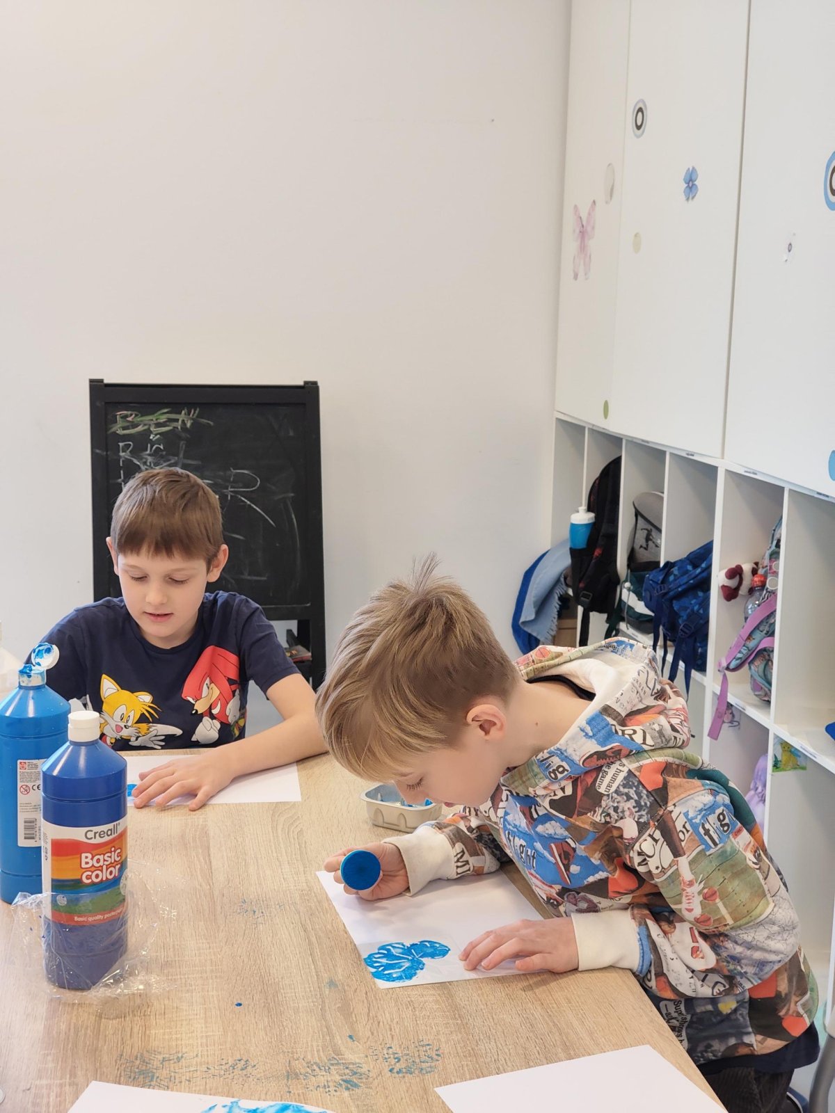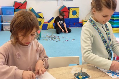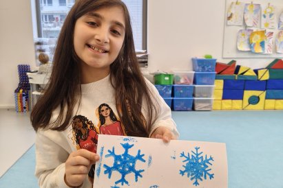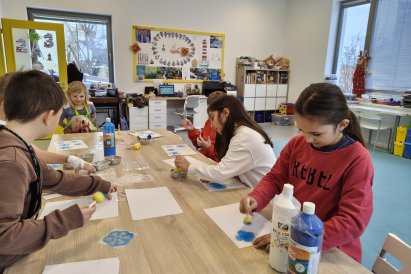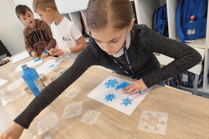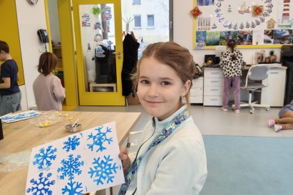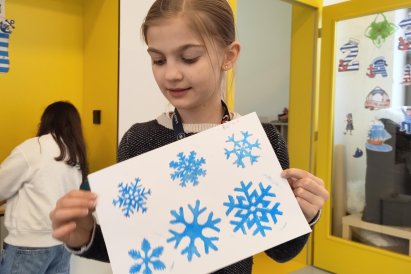 Dnes jsme si vyráběli vločky – na karton jsme obtiskovali šablonky vloček a moc nás to bavilo. Potom jsme se teple oblékli a šli jsme ven užívat si zimní radovánky.