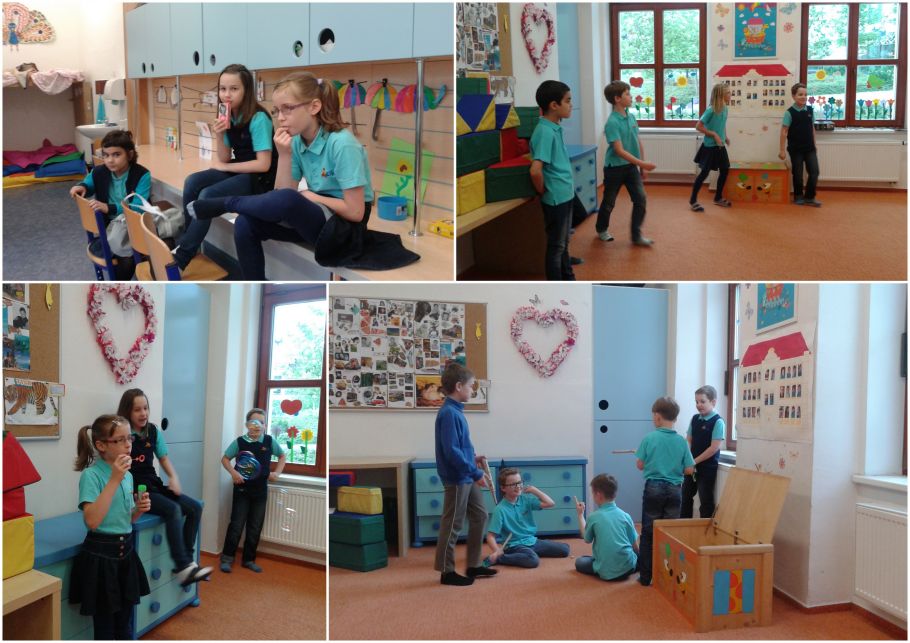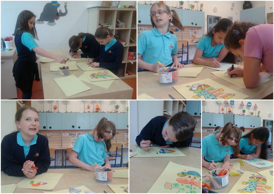 Dnes jsme malovali klauna. S pomocí šablony jsme namalovali klauna a pak jsme ho vymalovali. Kromě toho jsme měli angličtinu, plavání a fotbal. V družině jsme hráli vybíjenou, foukali přes bublifuk, psali úkoly nebo si jen tak povídali.