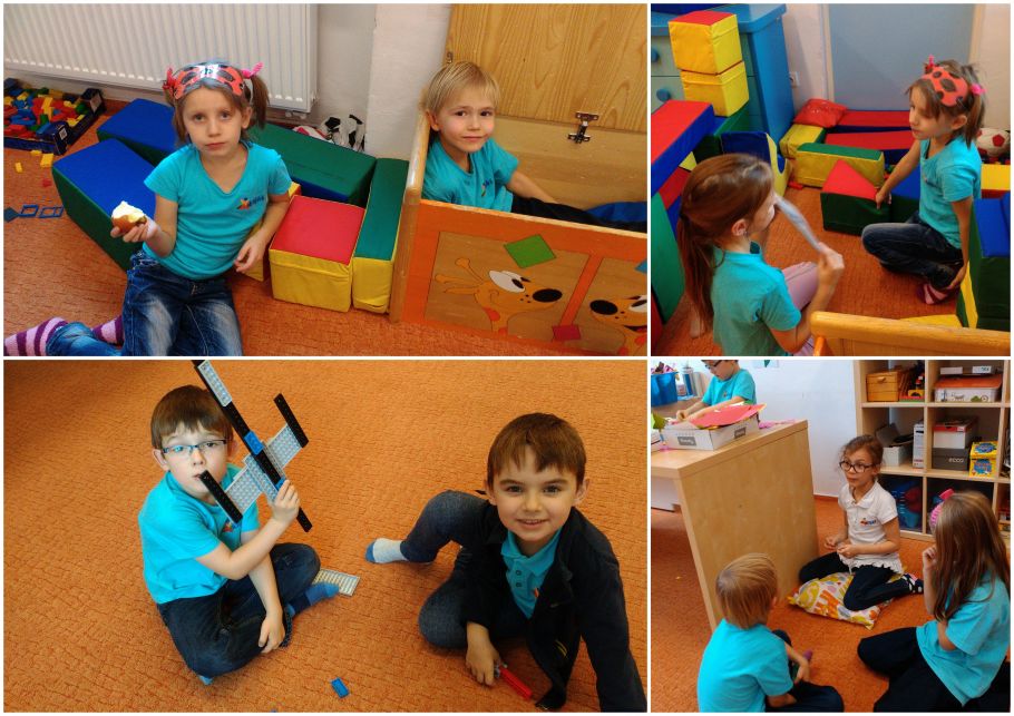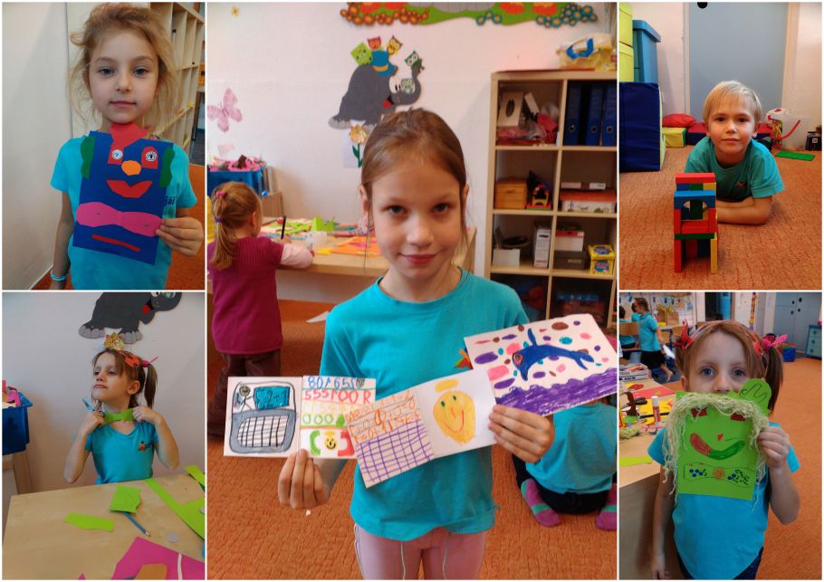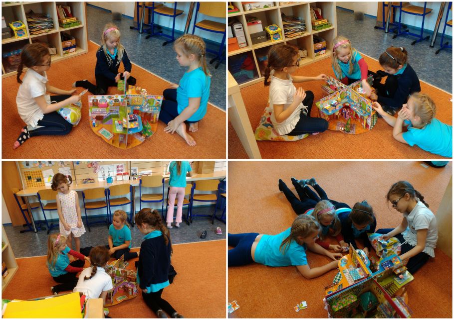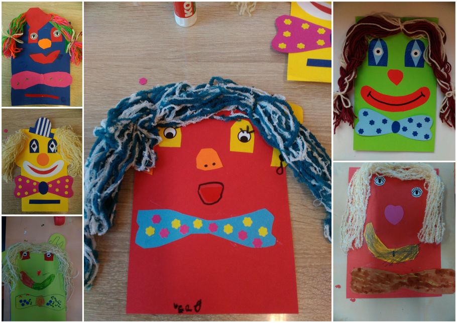 Dnes odpoledne Áďa přinesla krásny domeček pro panenky a tak ho děvčata společně okukovala a hrála se s ním. Kluci si postavili domečky z dřevěných kostek a z lega. Ostatní, co neměli výtvarku se mnou vyráběli klauníka. Co říkáte? Hezký jsou, že?