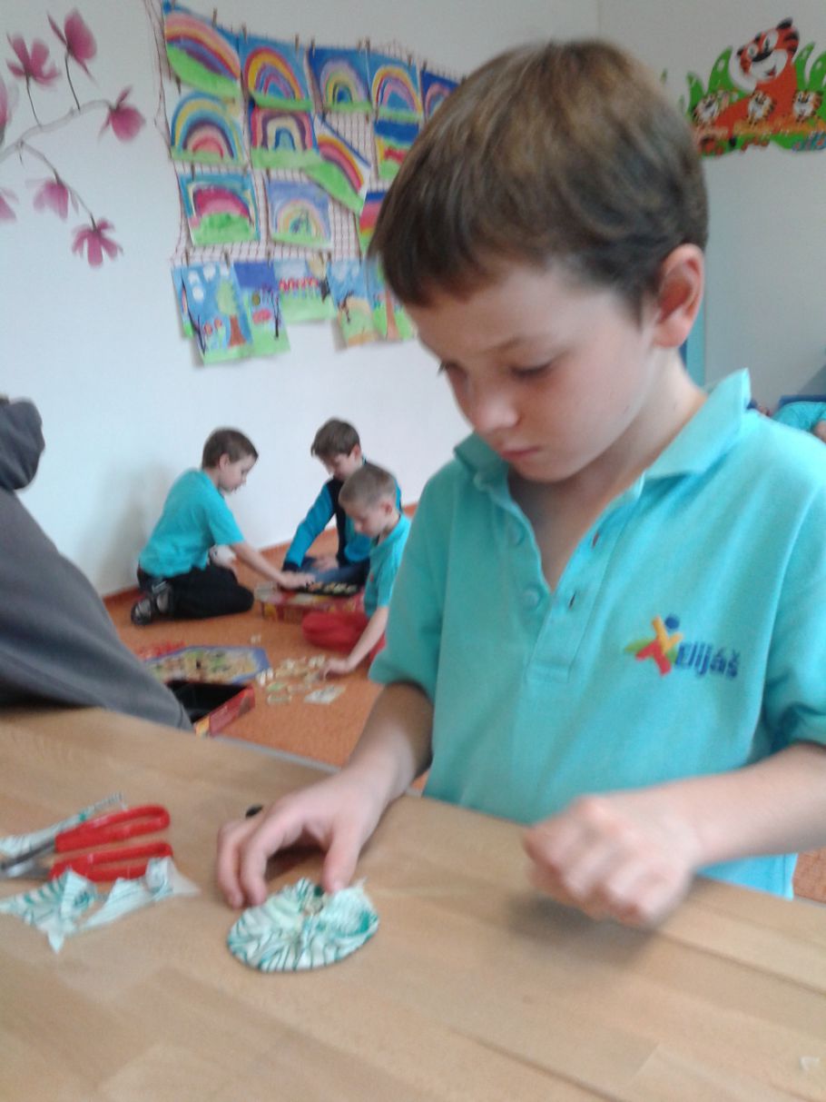Dnes jsme se všichni proměnili v pilné švadlenky. Vyráběli jsme veselé jehelníčky. Zapojili se všichni, malí i velcí, vždycky máme radost, když se dílo podaří. Samozřejmě zbyl čas i na hraní, kluci hráli osadníky z Katanu, stavěli si z lega a ostatní řádili v domečkách z pytlů a kartonu. Plavci si zaplavali, muzikanti měli klavír a kytaru, byla i kravmaga. Den to byl stoprocentně využitý.