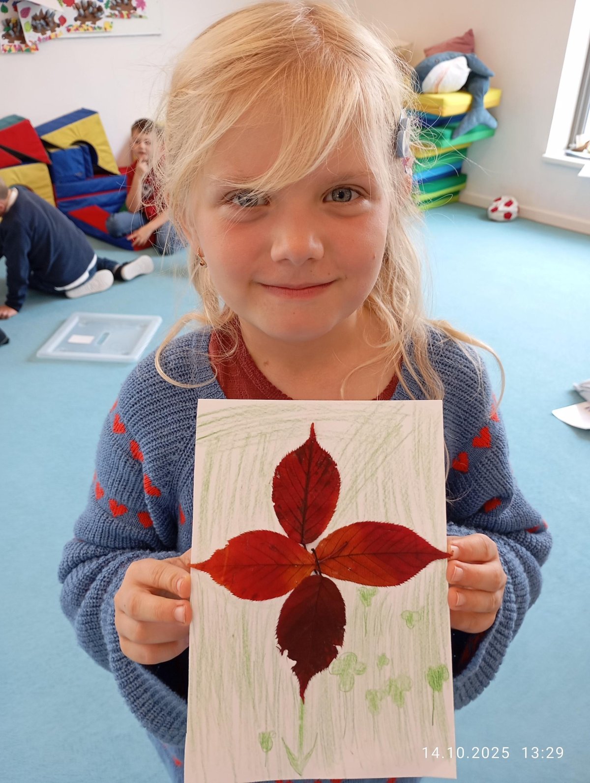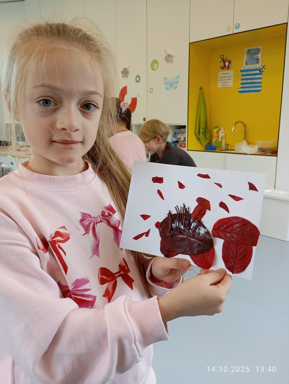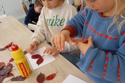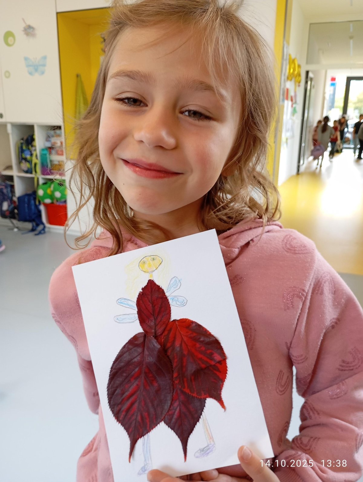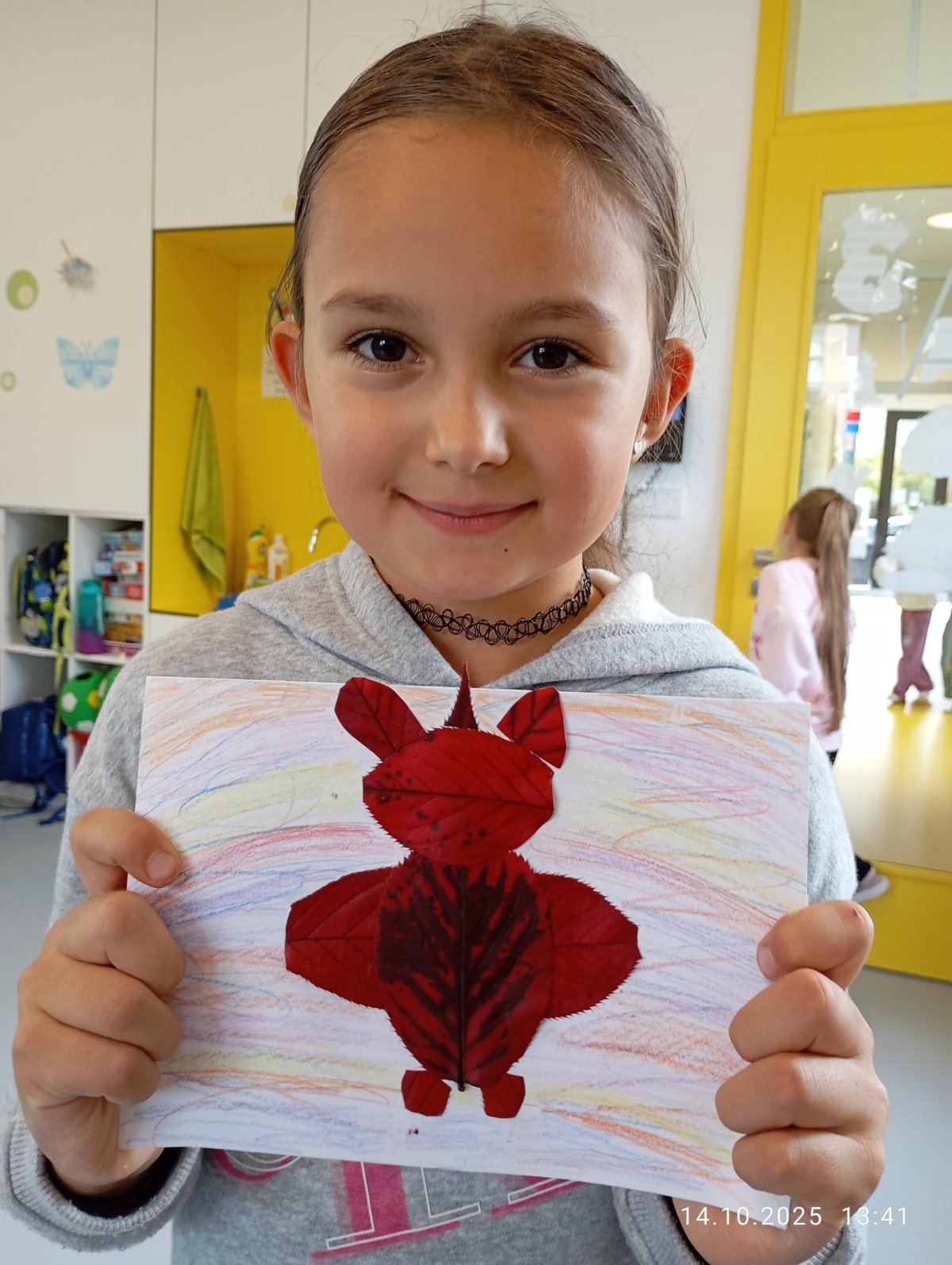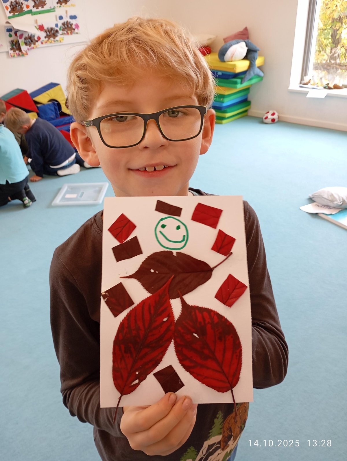 Tento týden jsme se naučili novou pohybovou hru Evoluce, která zapojuje zvaly i obratnost. Děi se promění v plazy, po úspěšném duelu v kámen, nůžky papír se vyvinou v čtvernožce ve vzporu nikoliv na kolenou a nakonec z nich mohou být dvojnožci, děti si u toho užily spoustu legrace, pak jsme se pustili do koláží, použili jsme krásné červené listy, které opadávají u naší družiny. Děti vytvořily různé postavičky, kytičky a zvířátka, která pak domalovaly fixami.