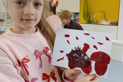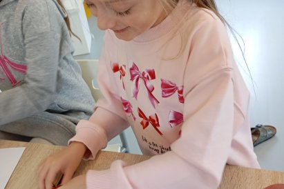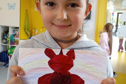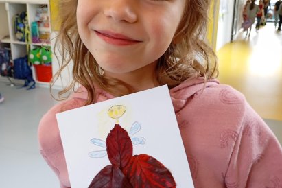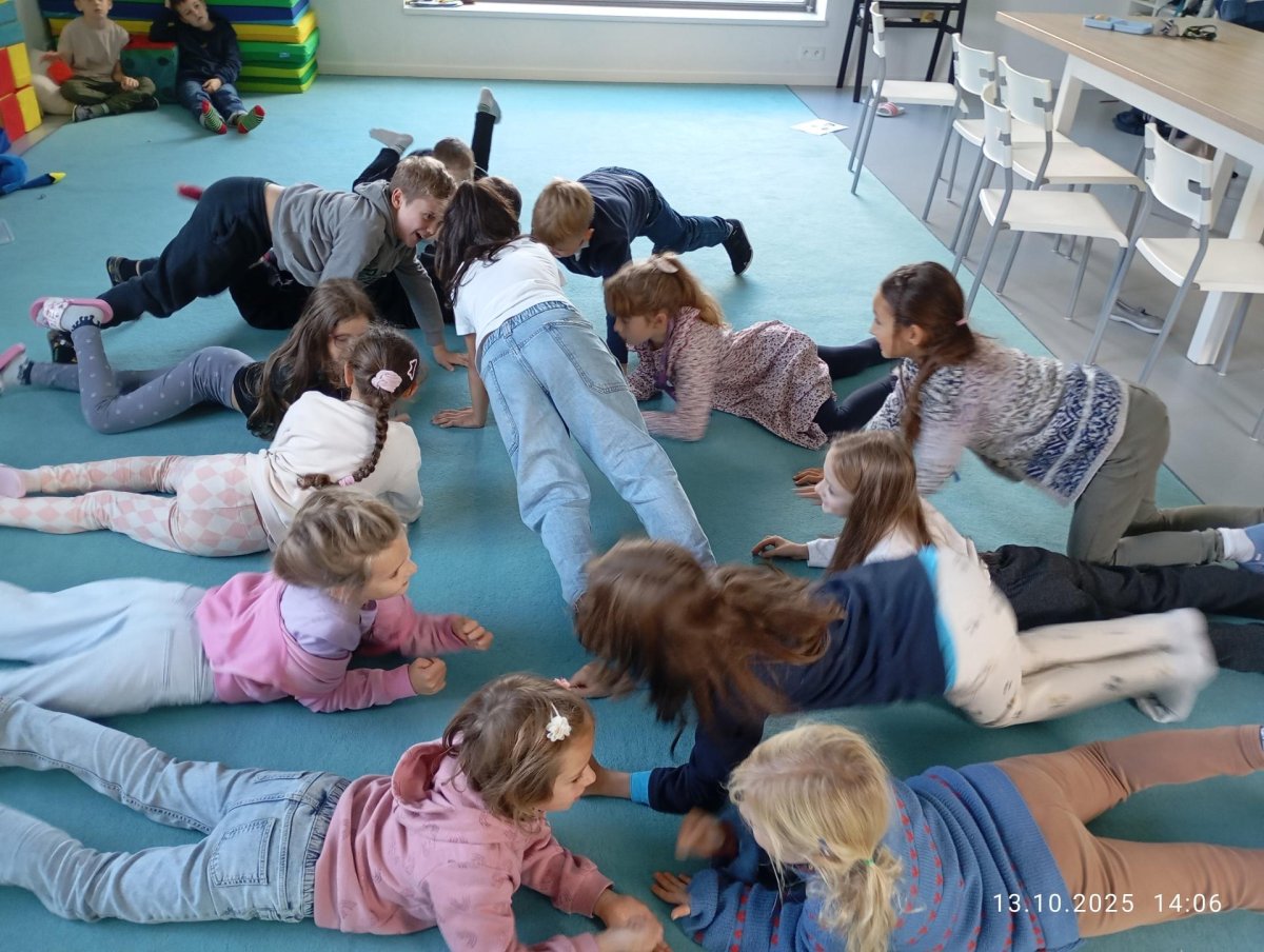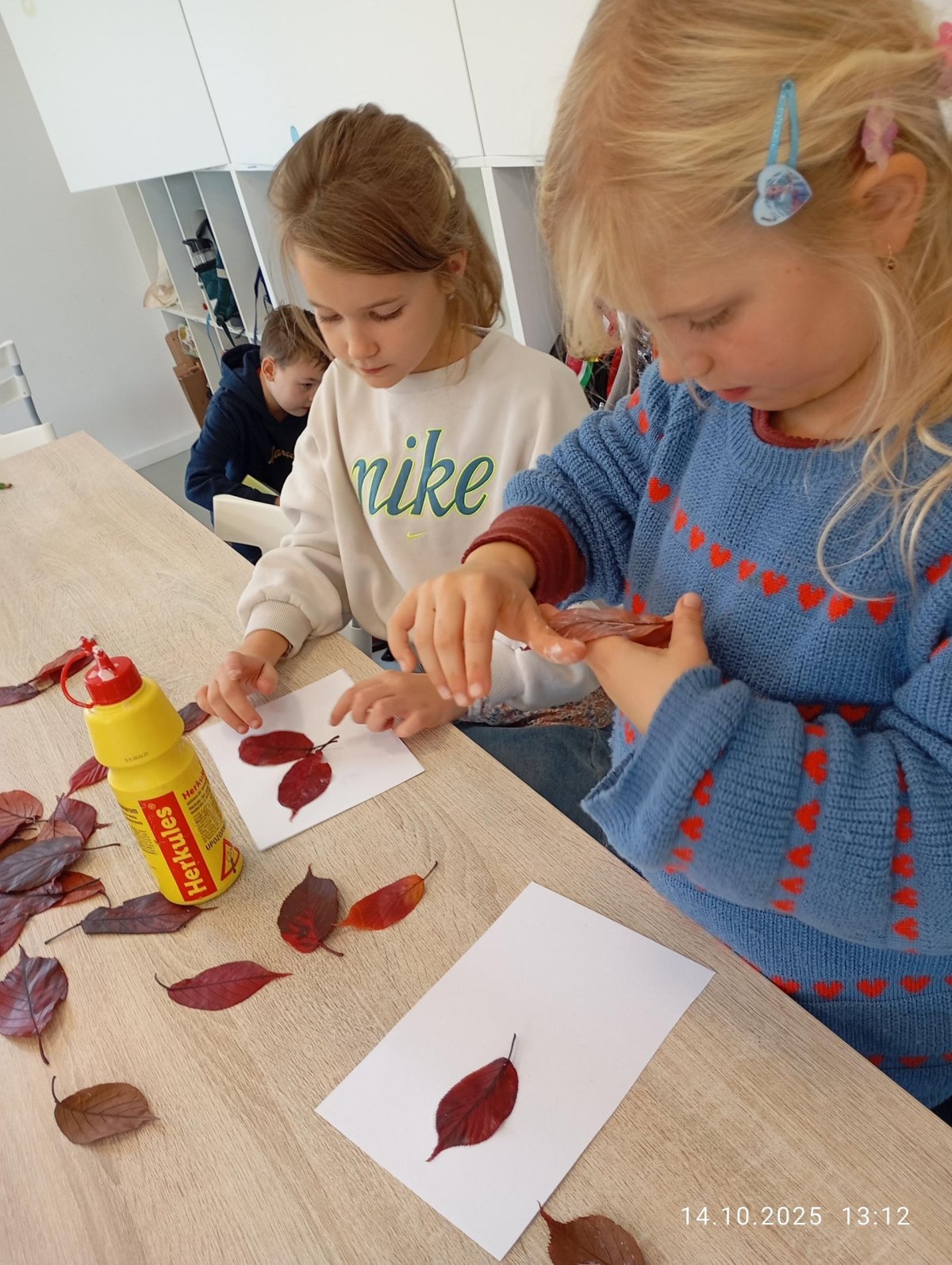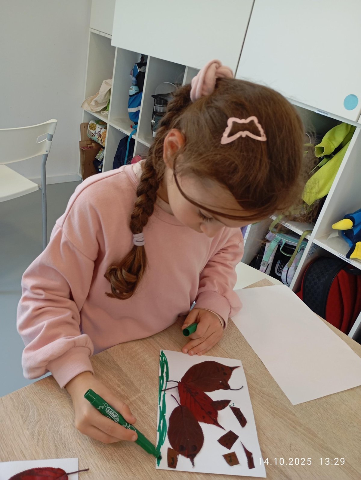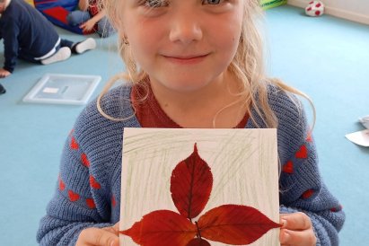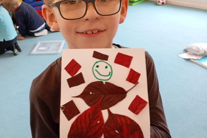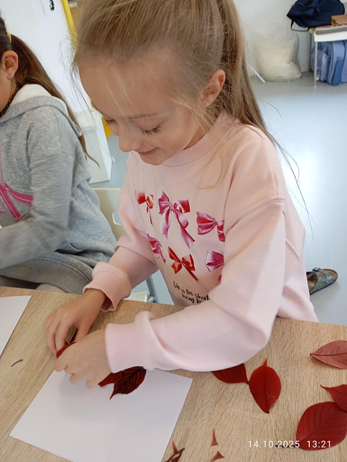 Tento týden jsme se naučili novou pohybovou hru Evoluce, která zapojuje zvaly i obratnost. Děi se promění v plazy, po úspěšném duelu v kámen, nůžky papír se vyvinou v čtvernožce ve vzporu nikoliv na kolenou a nakonec z nich mohou být dvojnožci, děti si u toho užily spoustu legrace, pak jsme se pustili do koláží, použili jsme krásné červené listy, které opadávají u naší družiny. Děti vytvořily různé postavičky, kytičky a zvířátka, která pak domalovaly fixami.