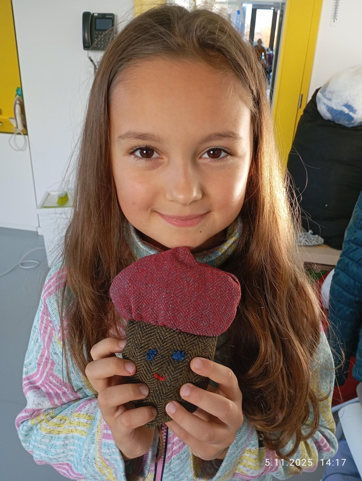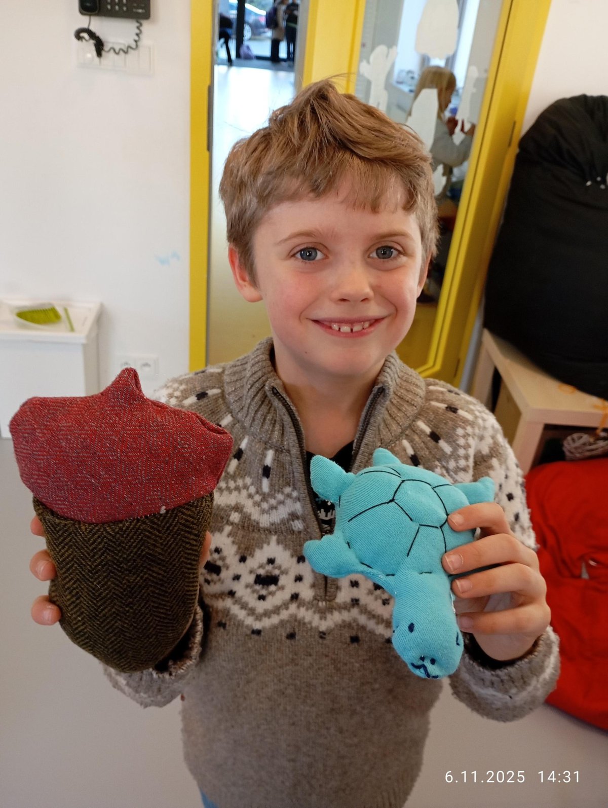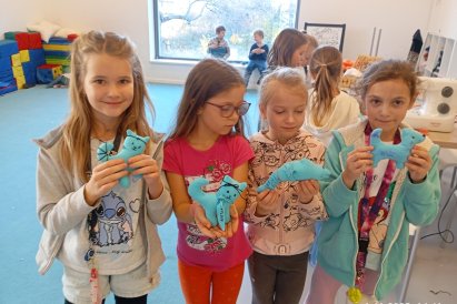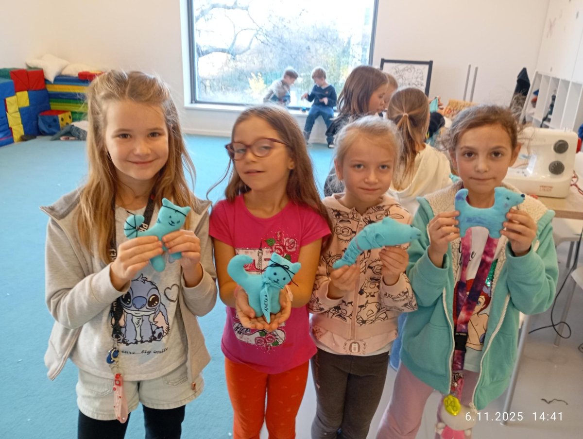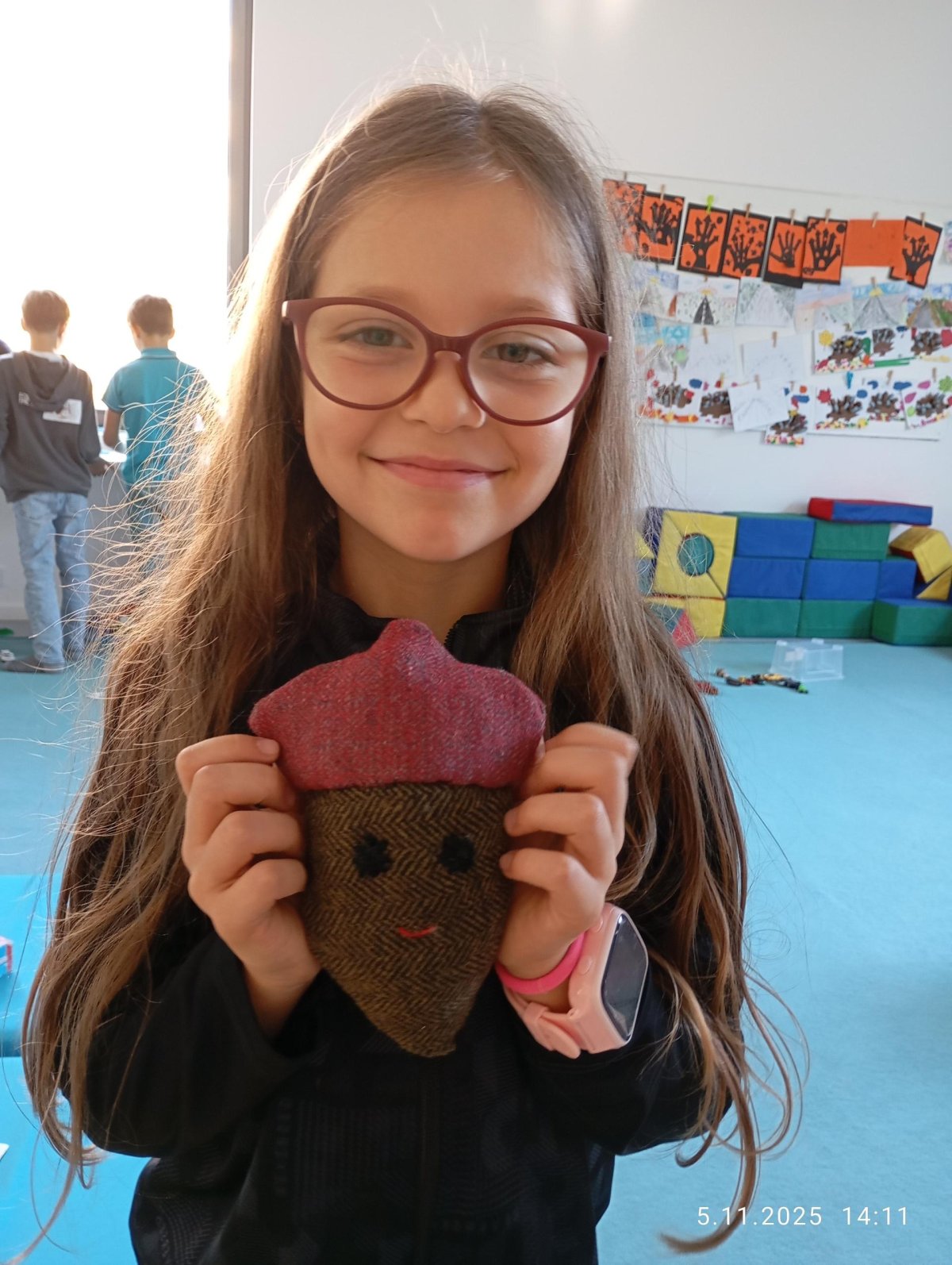 V minulém týdnu jsme zápasili s jehlami. A to doslova, pro někoho to byla naprosto první zkušenost s jehlou, navléknout ji a přimět nitky, aby se necuchaly. Ušili jsme tak pěkně ručně z vlněné látky velké žaludy. Další den se děti odměnily tím, že jsem jim plyšáky předšila na stroji a oni si je jen obrátily, vykrmily dutým vláknem, zašily a vyšily očička.