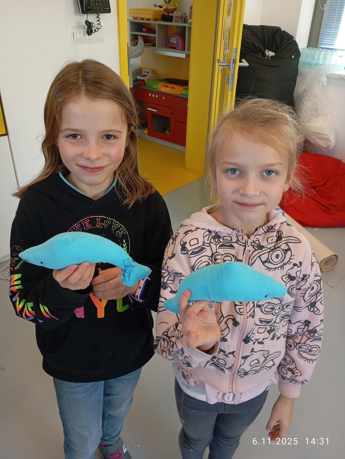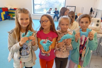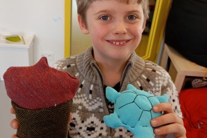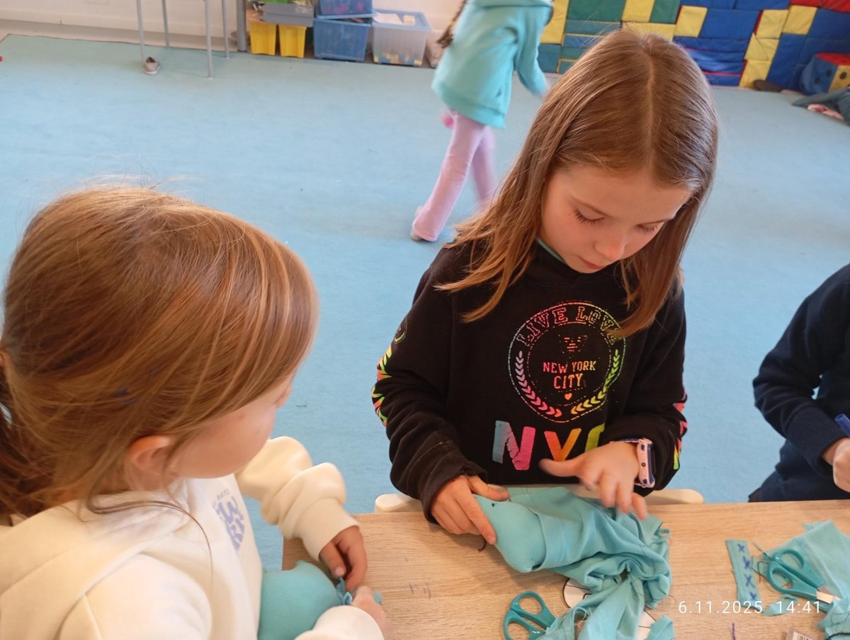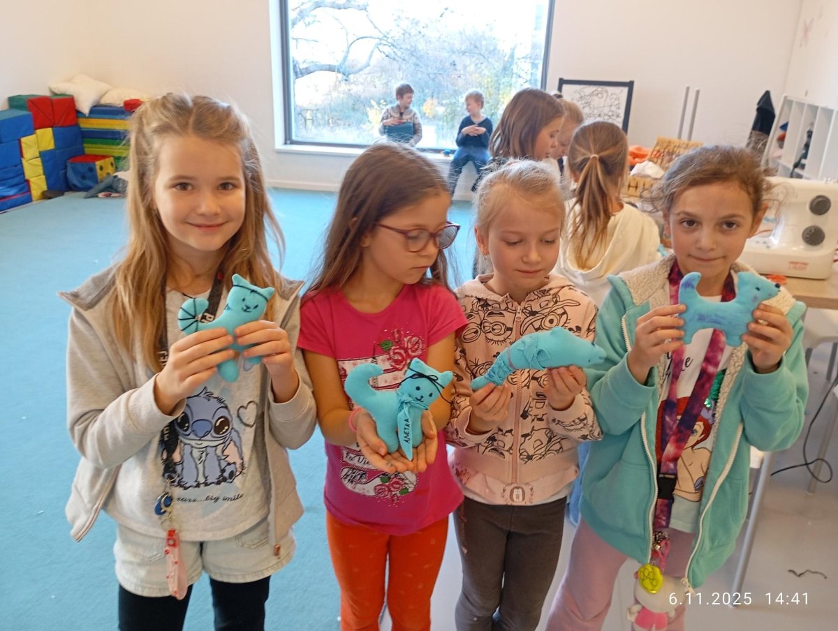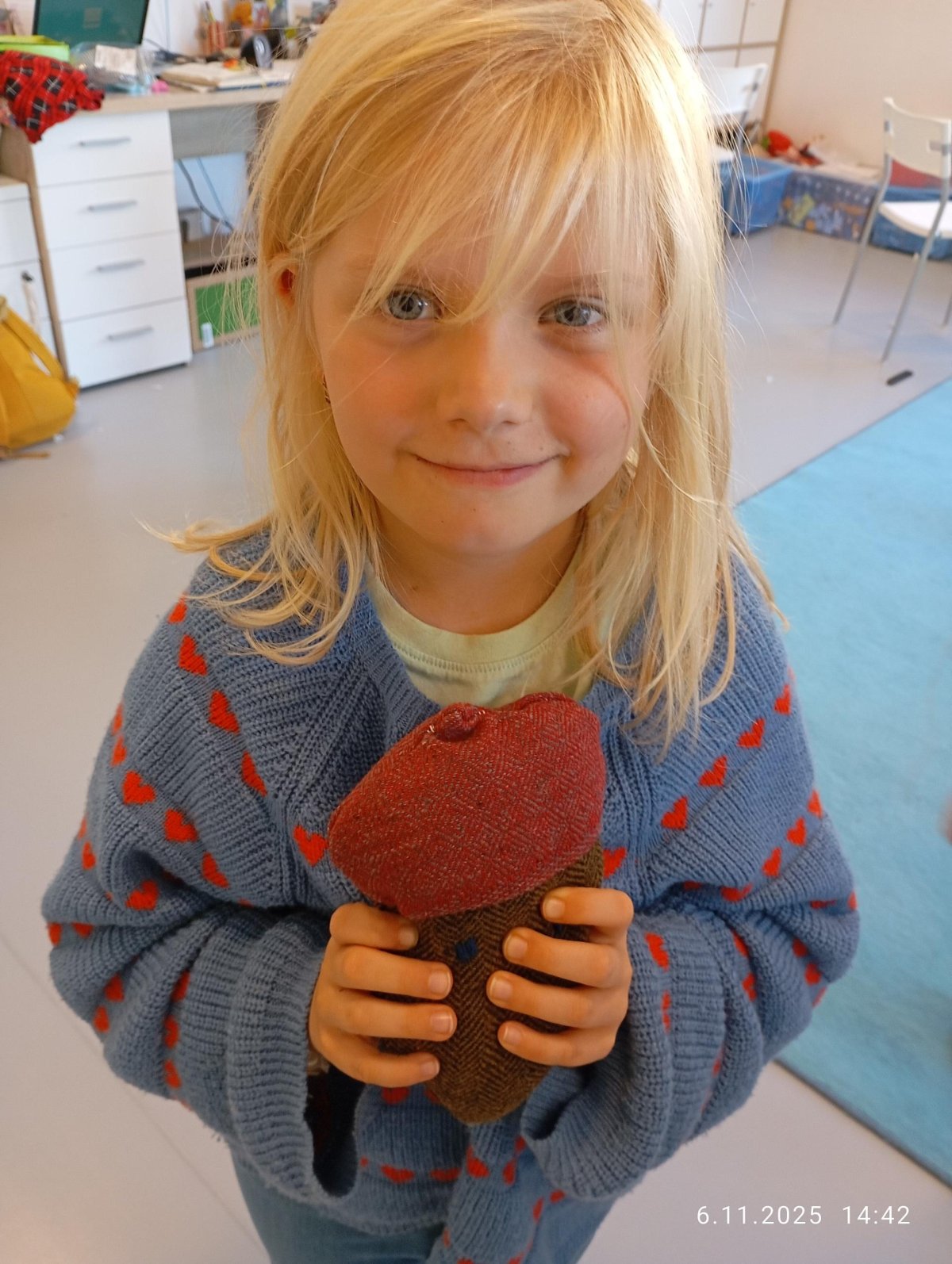 V minulém týdnu jsme zápasili s jehlami. A to doslova, pro někoho to byla naprosto první zkušenost s jehlou, navléknout ji a přimět nitky, aby se necuchaly. Ušili jsme tak pěkně ručně z vlněné látky velké žaludy. Další den se děti odměnily tím, že jsem jim plyšáky předšila na stroji a oni si je jen obrátily, vykrmily dutým vláknem, zašily a vyšily očička.