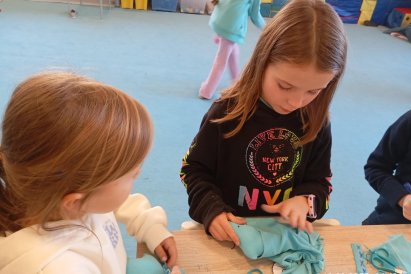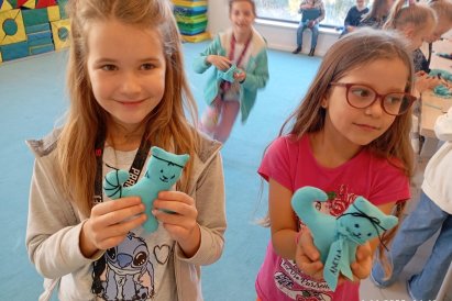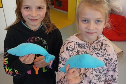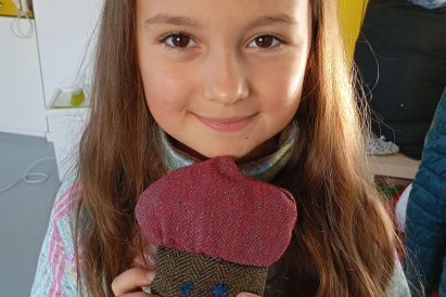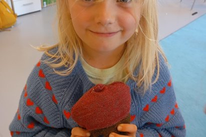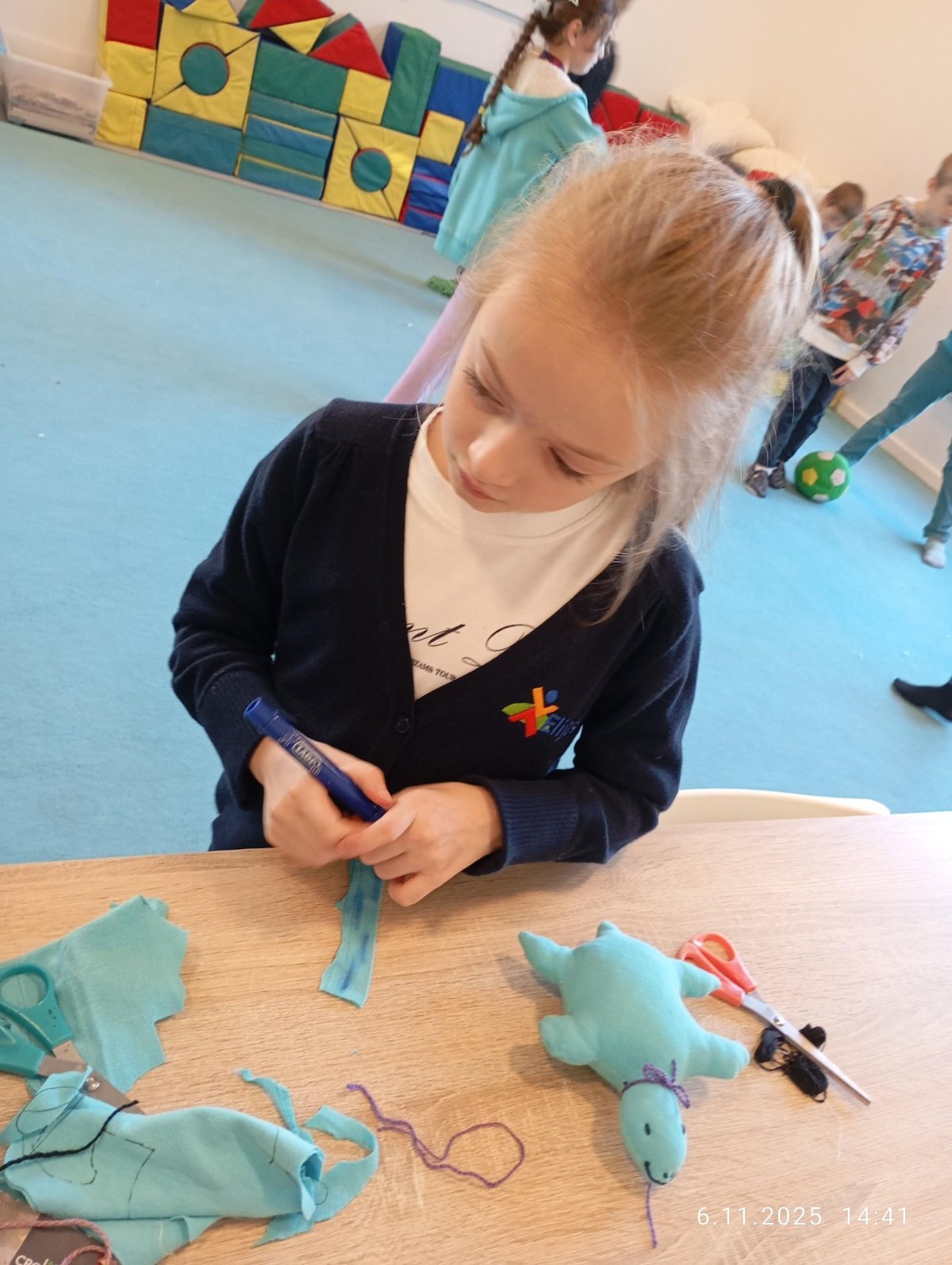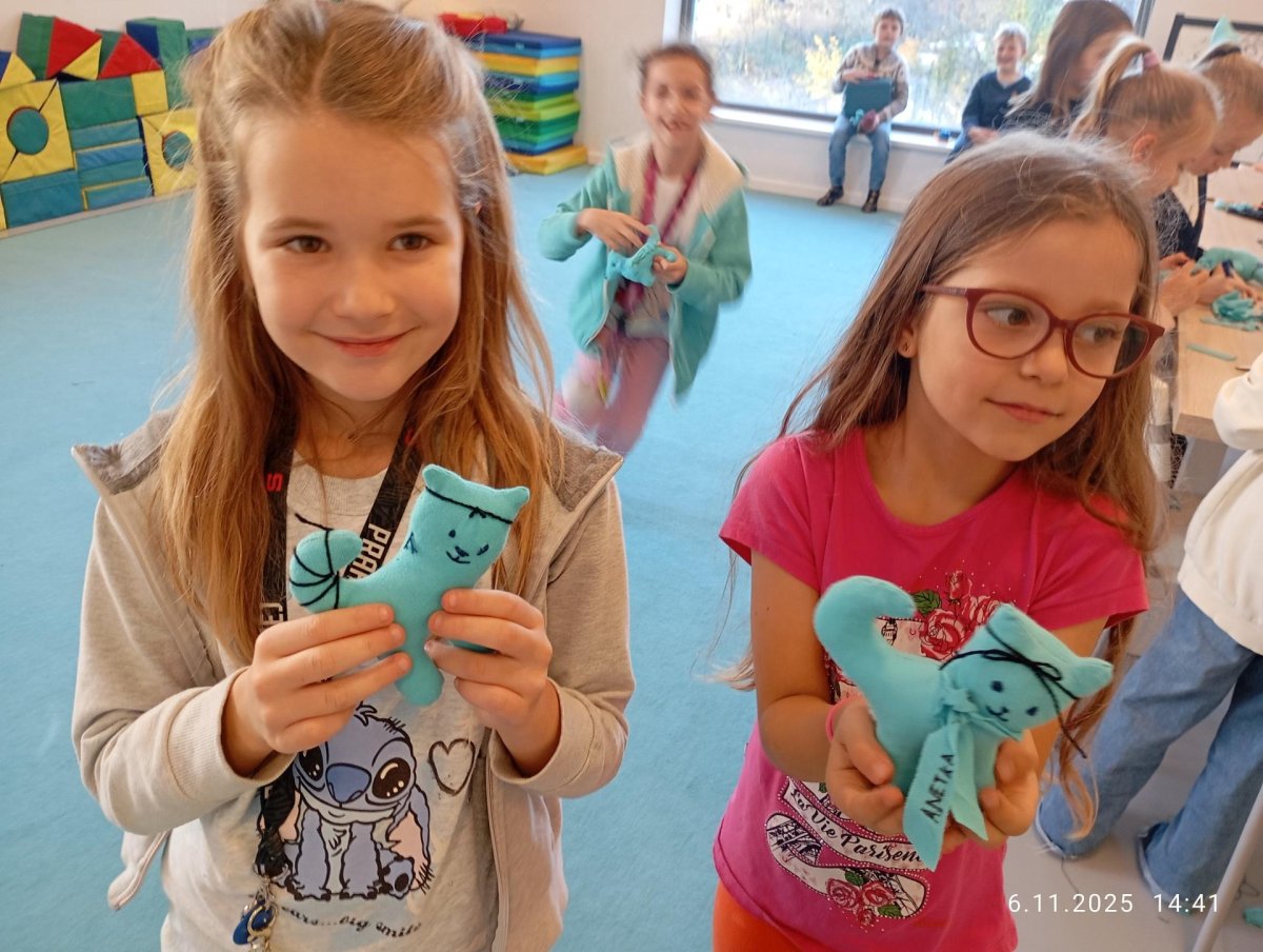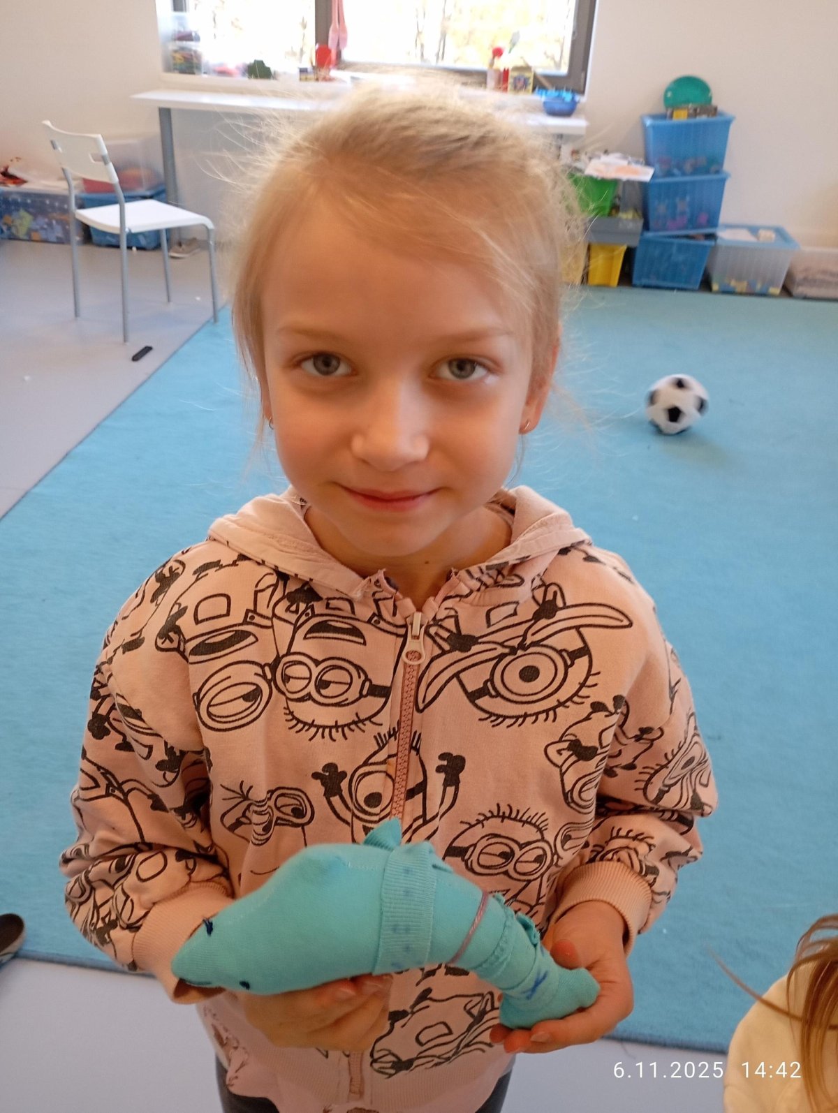 V minulém týdnu jsme zápasili s jehlami. A to doslova, pro někoho to byla naprosto první zkušenost s jehlou, navléknout ji a přimět nitky, aby se necuchaly. Ušili jsme tak pěkně ručně z vlněné látky velké žaludy. Další den se děti odměnily tím, že jsem jim plyšáky předšila na stroji a oni si je jen obrátily, vykrmily dutým vláknem, zašily a vyšily očička.