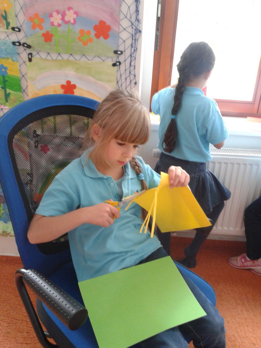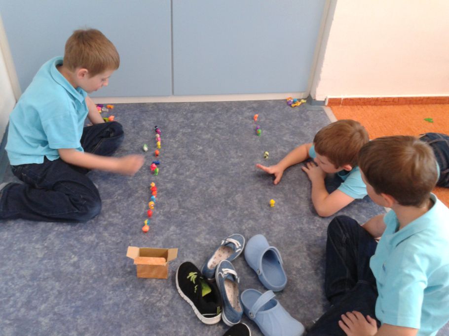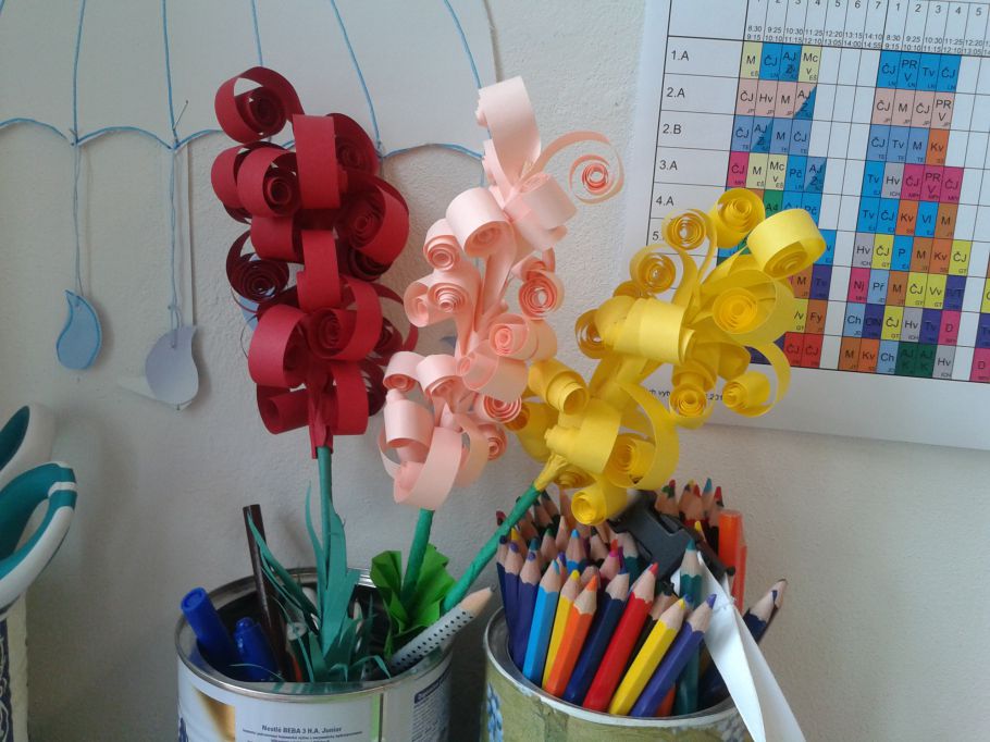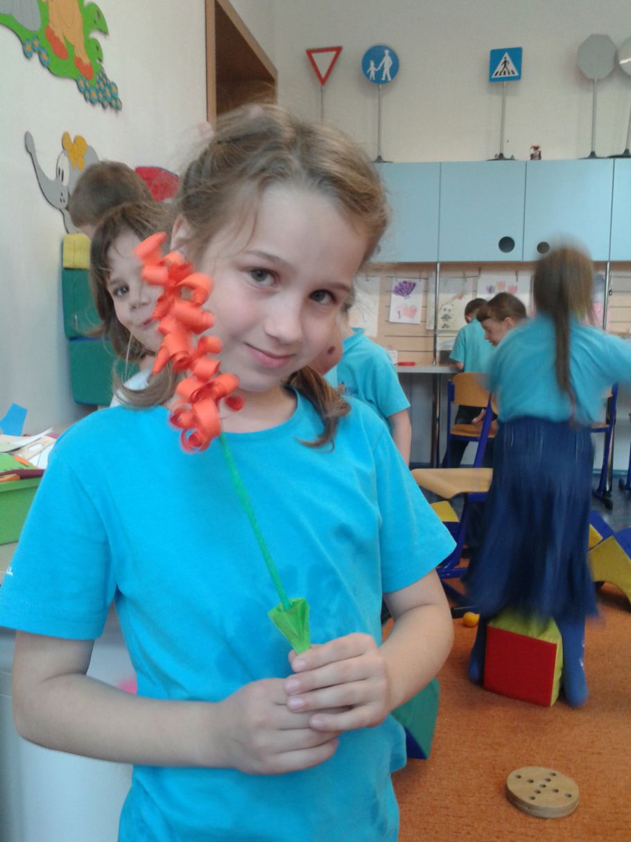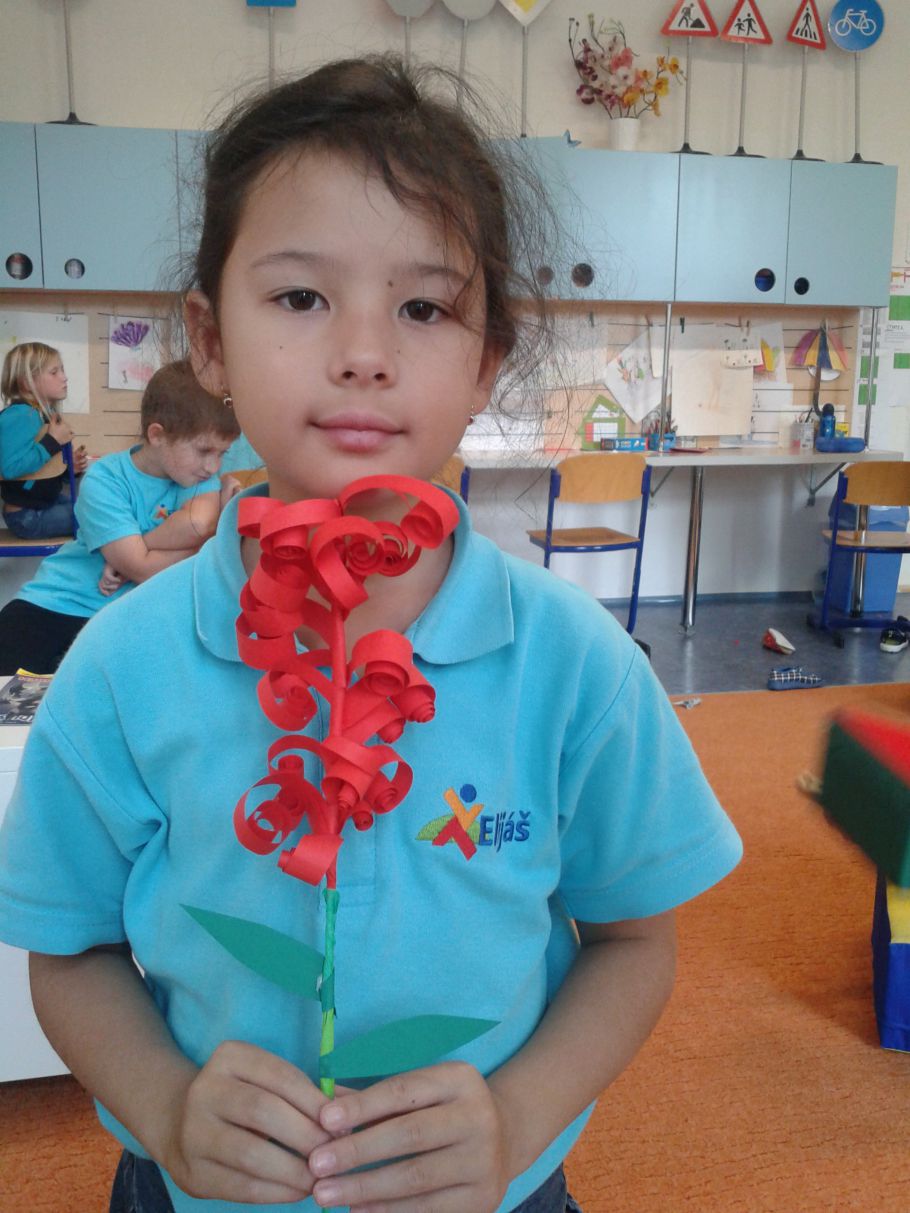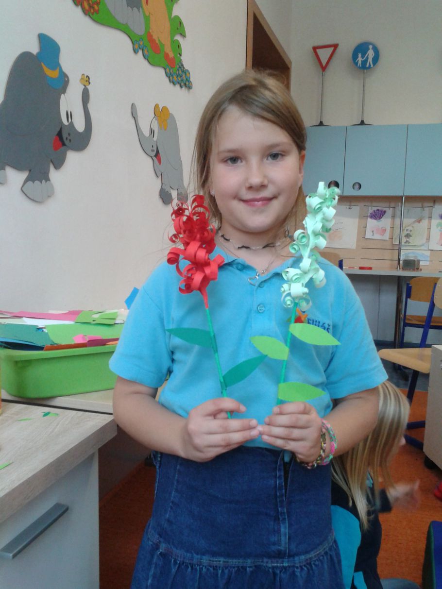 Dnes jsme si vyrobili krásné kytičky z papíru na špejli. Gumičkování nahradilo korálkování a tak děti tvořily z plastových korálků vlajky, srdíčka, kostky, zvířátka aj. Kluci si dnes udělali obchod, stavěli domečky a hráli si s autíčky. Pokračovali jsme ve čtení příběhu o dětech a jejich zvířátkách a po úklidu v družině jsme šli ven na hřiště.