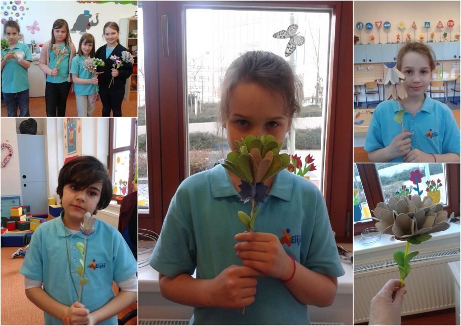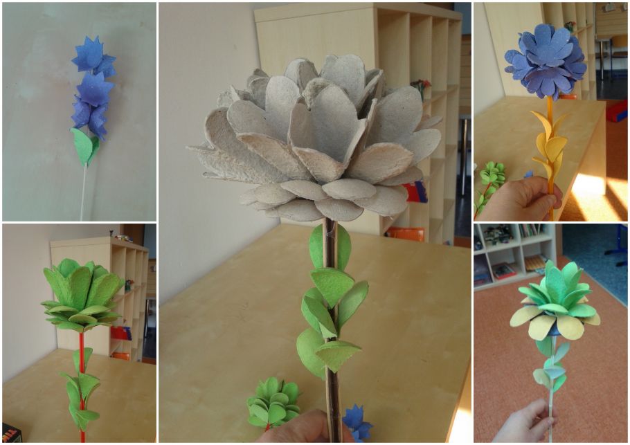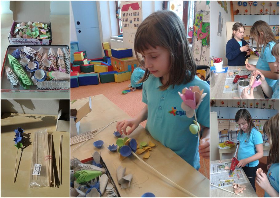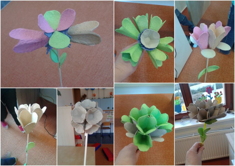 Dnešní den jsme vyráběli kytičky z obalu od vajíček. Dva měsíce jsme střihali obaly a dalo nám to hodně práce vystřihovat z toho různé tvary. Dnes jsme hodně lepili tavící pistolí a skládali do sebe jednotlivé díly, abychom vytvořili krásné kytky. Sami jsme netušili co všechno se dá vytvořit. Venku bylo krásně a tak jsme šli na hřiště běhat a hrát si. Do družiny se nám vůbec nechtělo.