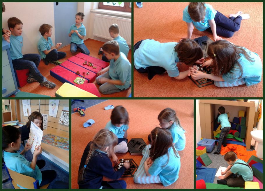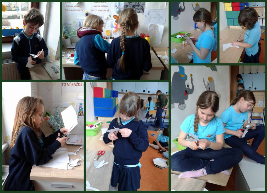 Dnes jsme měli volnější den. V družině si kluci hráli s kartičkami od farmy, stavěli domečky a byli na florbalu. Děvčata si se mnou vyrobili labutě na jezeře. Venku bylo krásně, tak jsme vyběhli na hřiště a hráli si s míčem, kamínky a lezly na prolézačky.