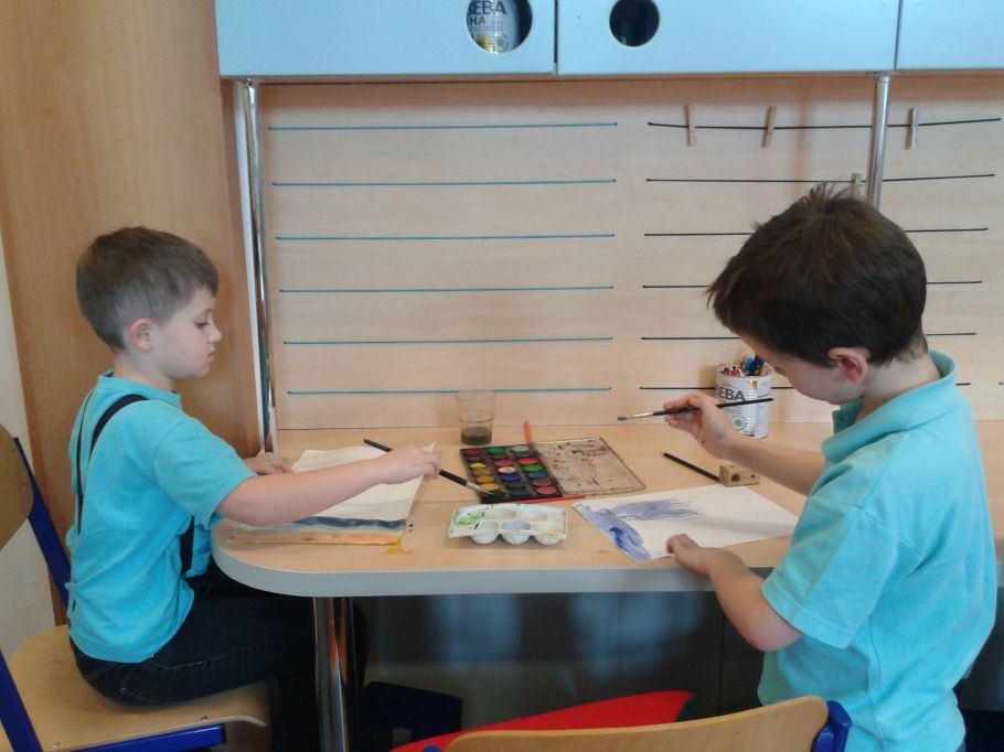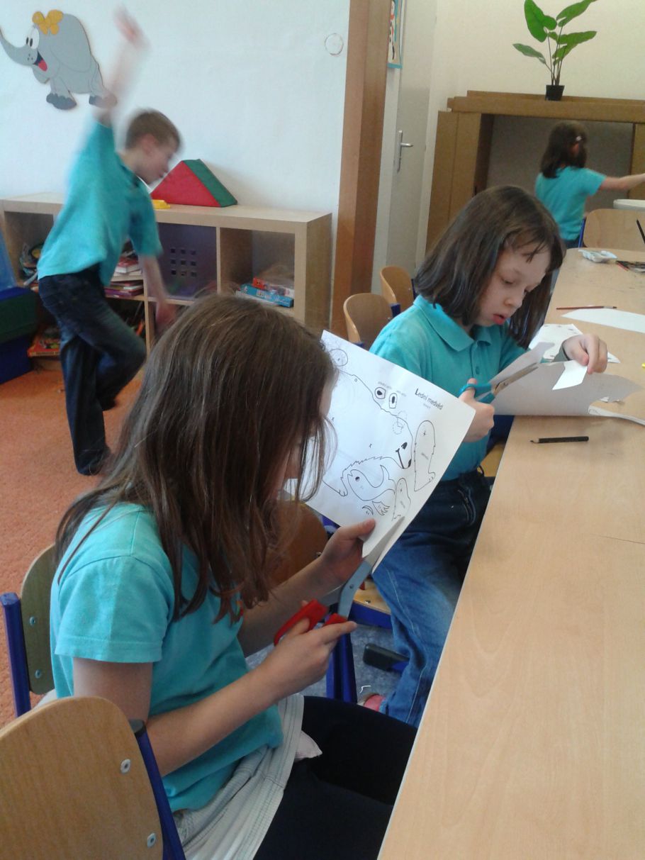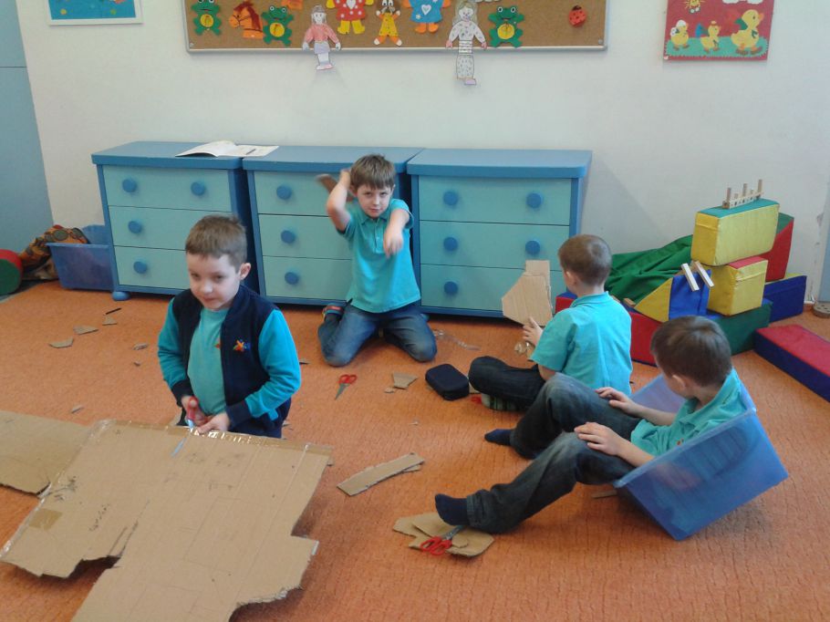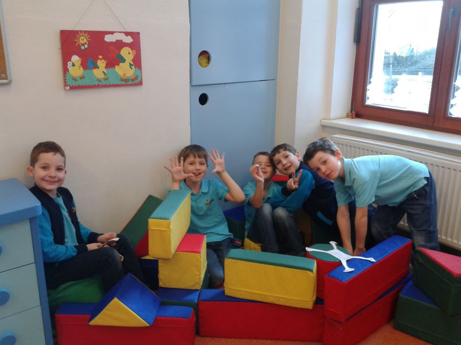 Kluci si jako obvykle postavili domečky, vystřihovali z kartonu a vzalo jim to hodně času. Nakonec si někteří byli zahrát fotbal v hale.