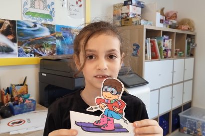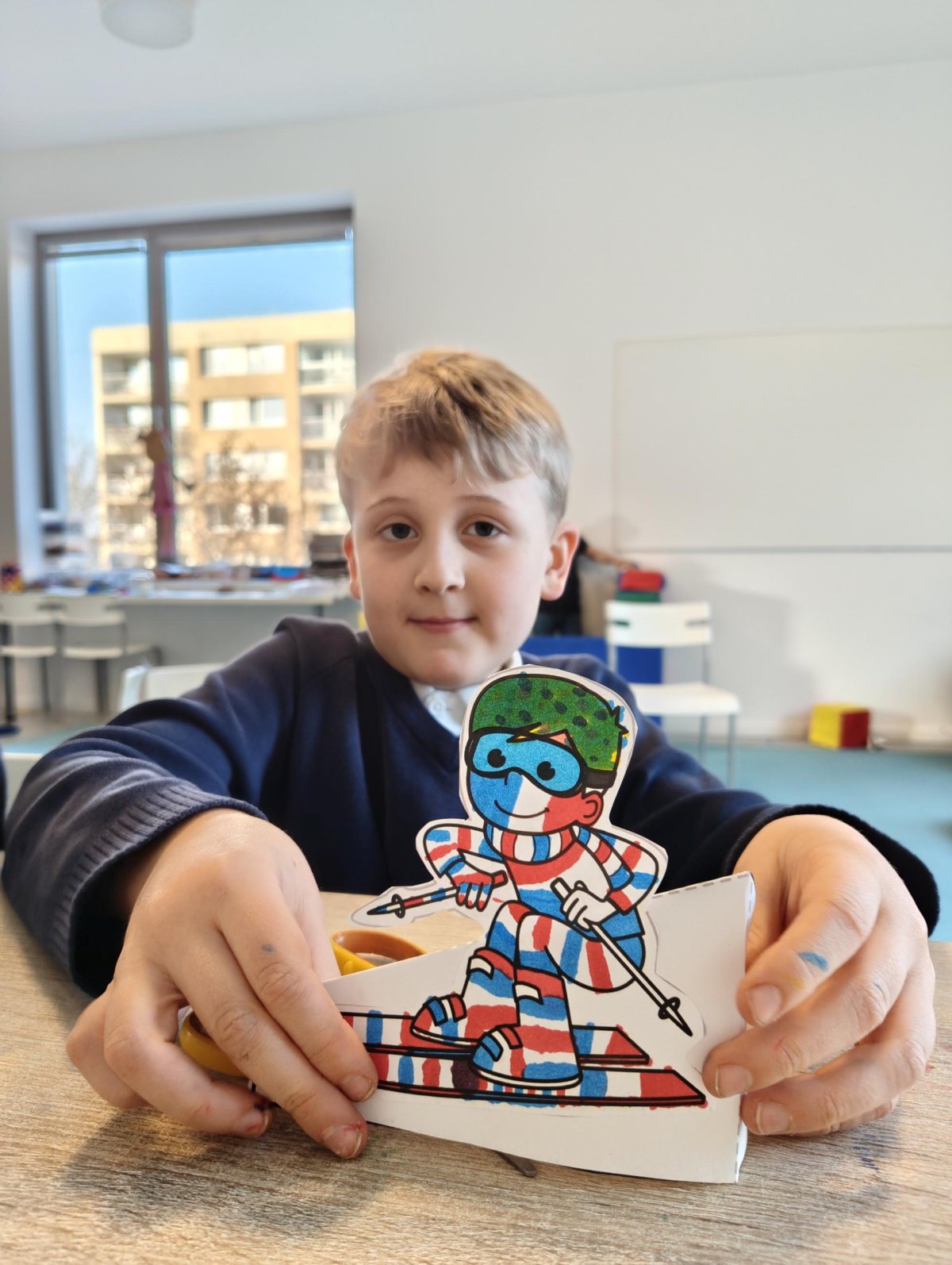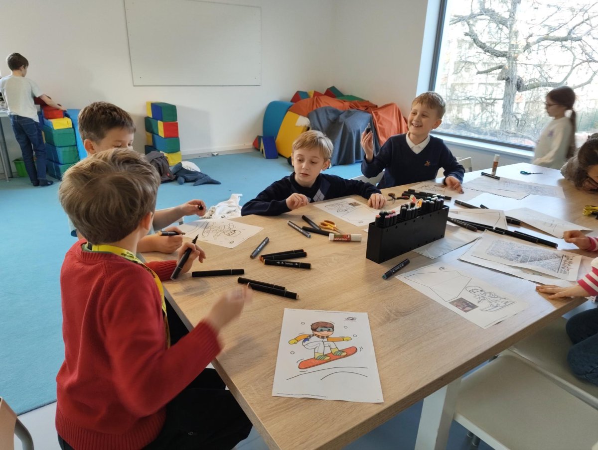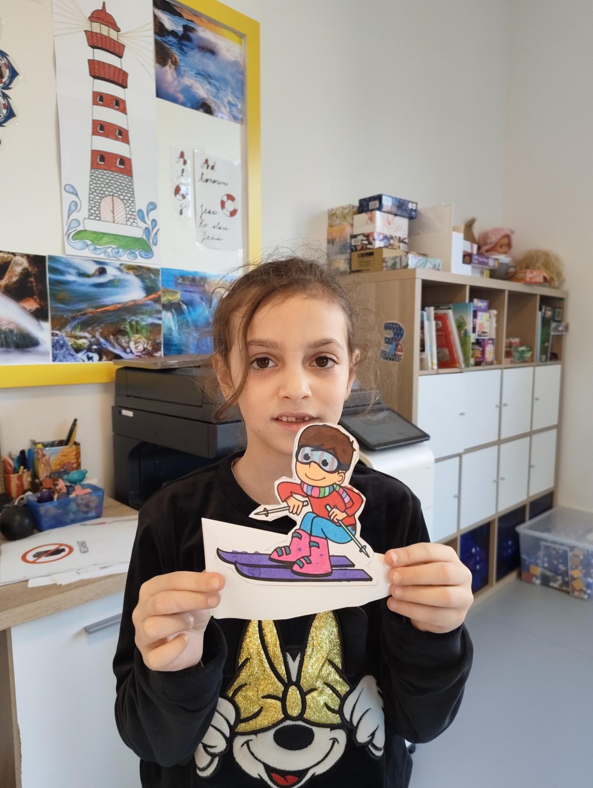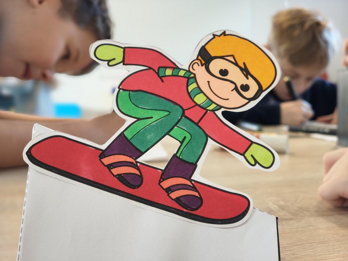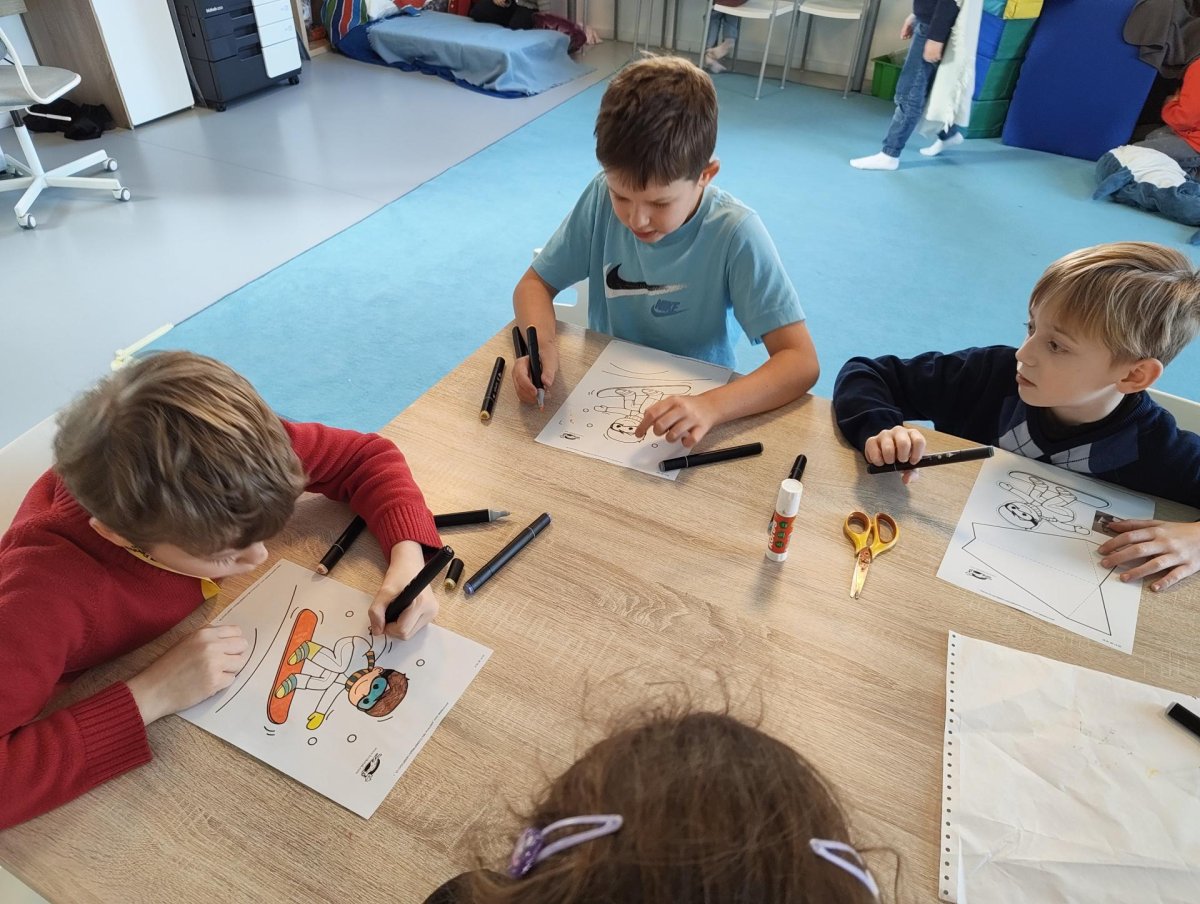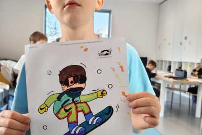 Dnes jsme si ve družině povídali o zimních sportech. Každý vyprávěl, kdo a kde lyžoval, jaké měl zážitky z hor a kdo už lyžovat umí nebo se teprve učí. Mezitím jsme vybarvovali obrázky lyžařů a lepili postavičky na sněhové kopce. Každý měl oblečení lyžaře vybarvené buď podle vlastní fantazie, nebo podle toho, co měl na sobě na horách.