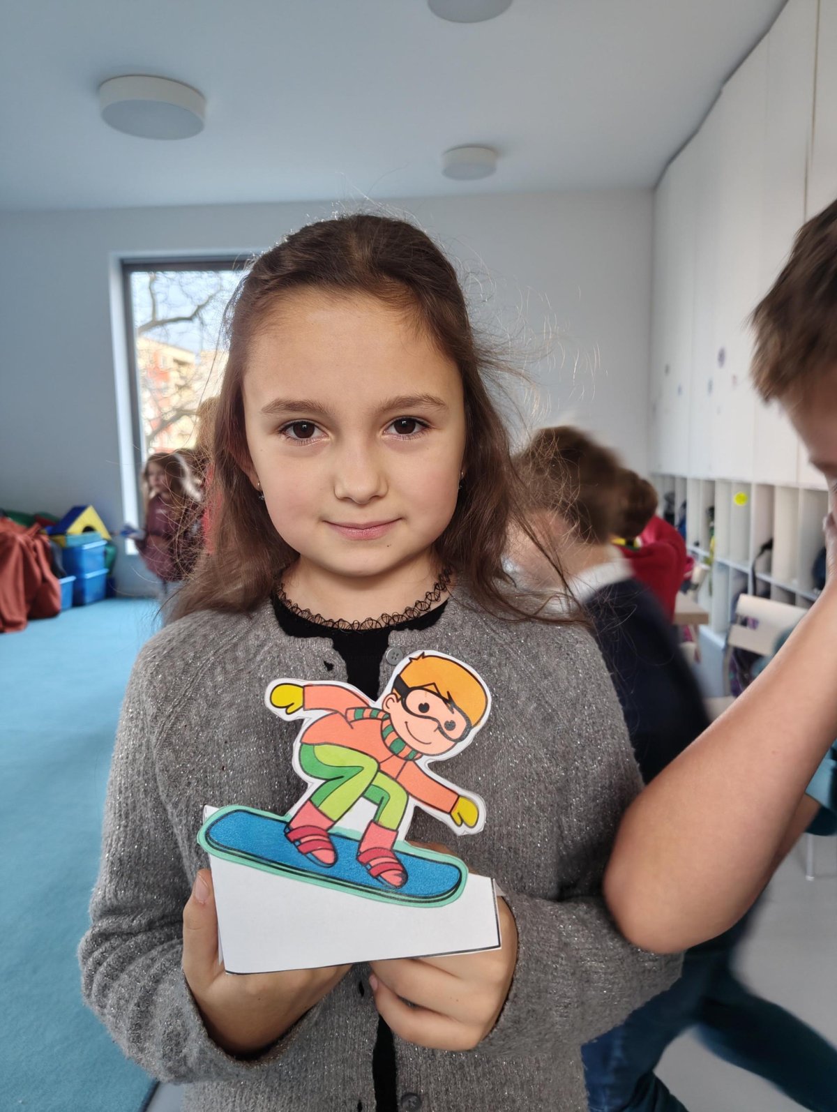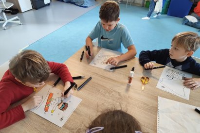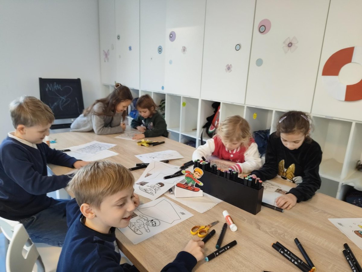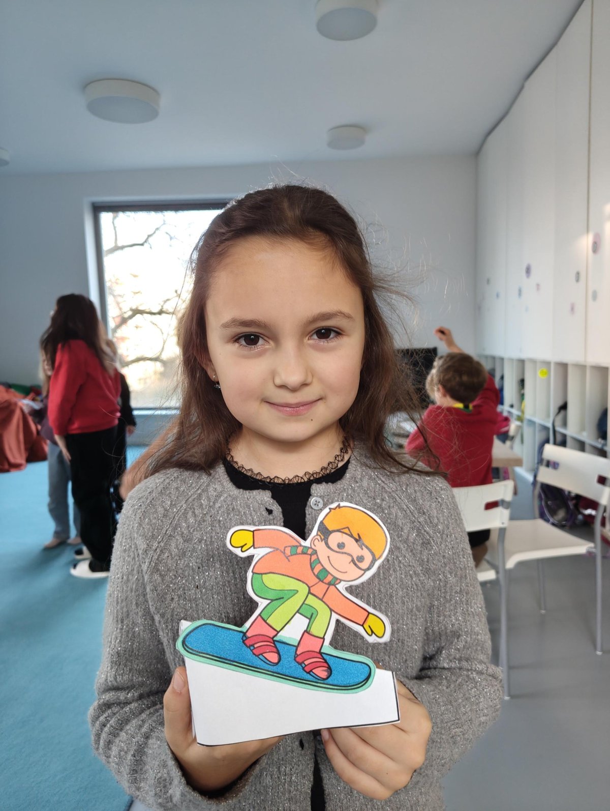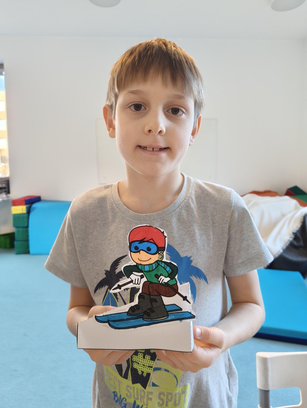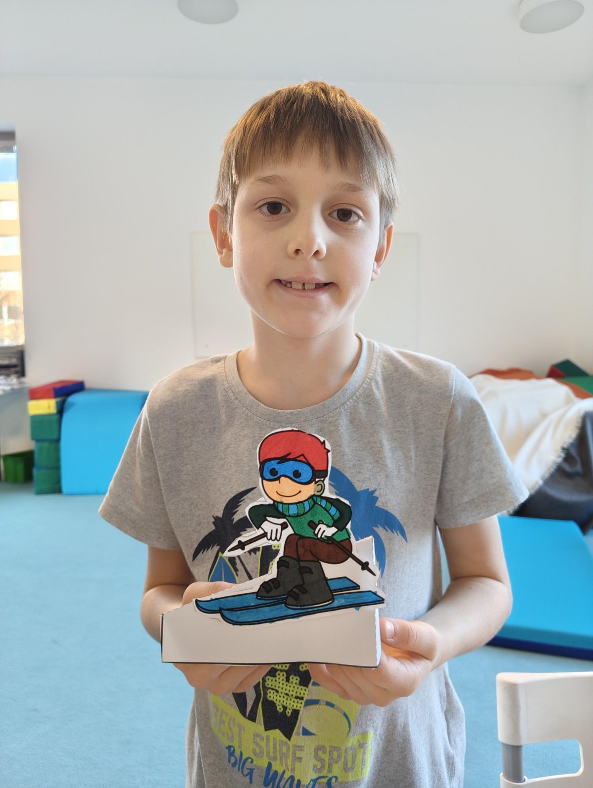 Dnes jsme si ve družině povídali o zimních sportech. Každý vyprávěl, kdo a kde lyžoval, jaké měl zážitky z hor a kdo už lyžovat umí nebo se teprve učí. Mezitím jsme vybarvovali obrázky lyžařů a lepili postavičky na sněhové kopce. Každý měl oblečení lyžaře vybarvené buď podle vlastní fantazie, nebo podle toho, co měl na sobě na horách.
