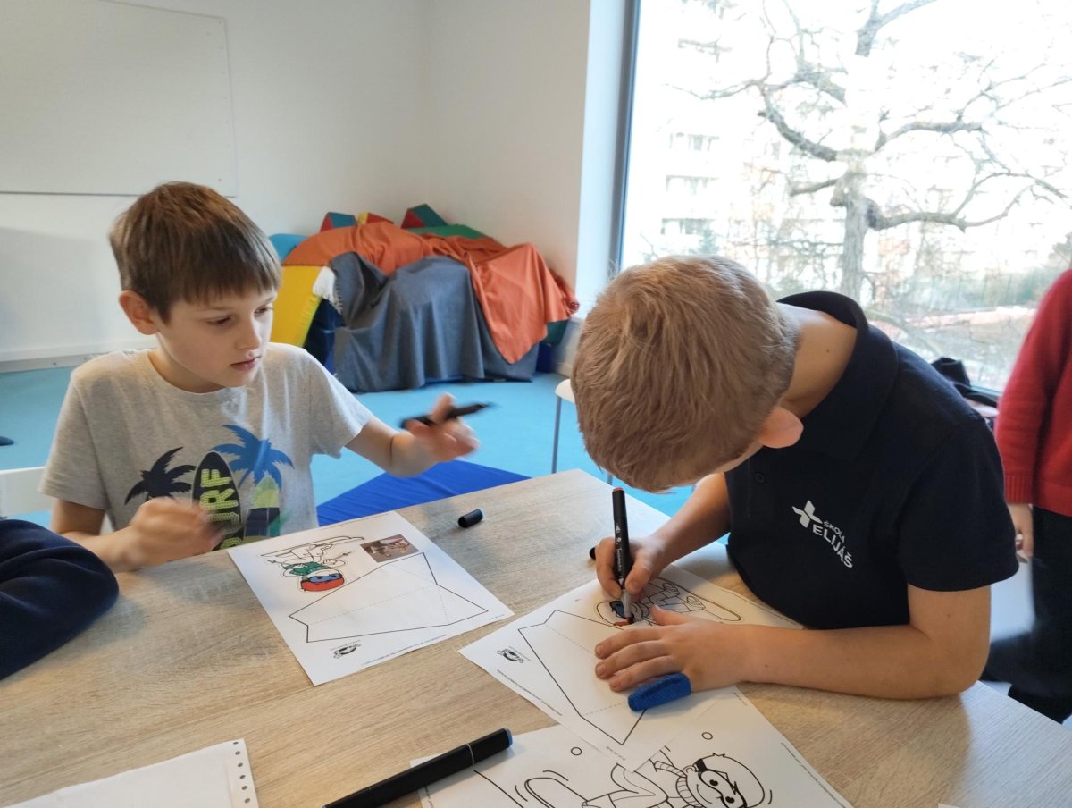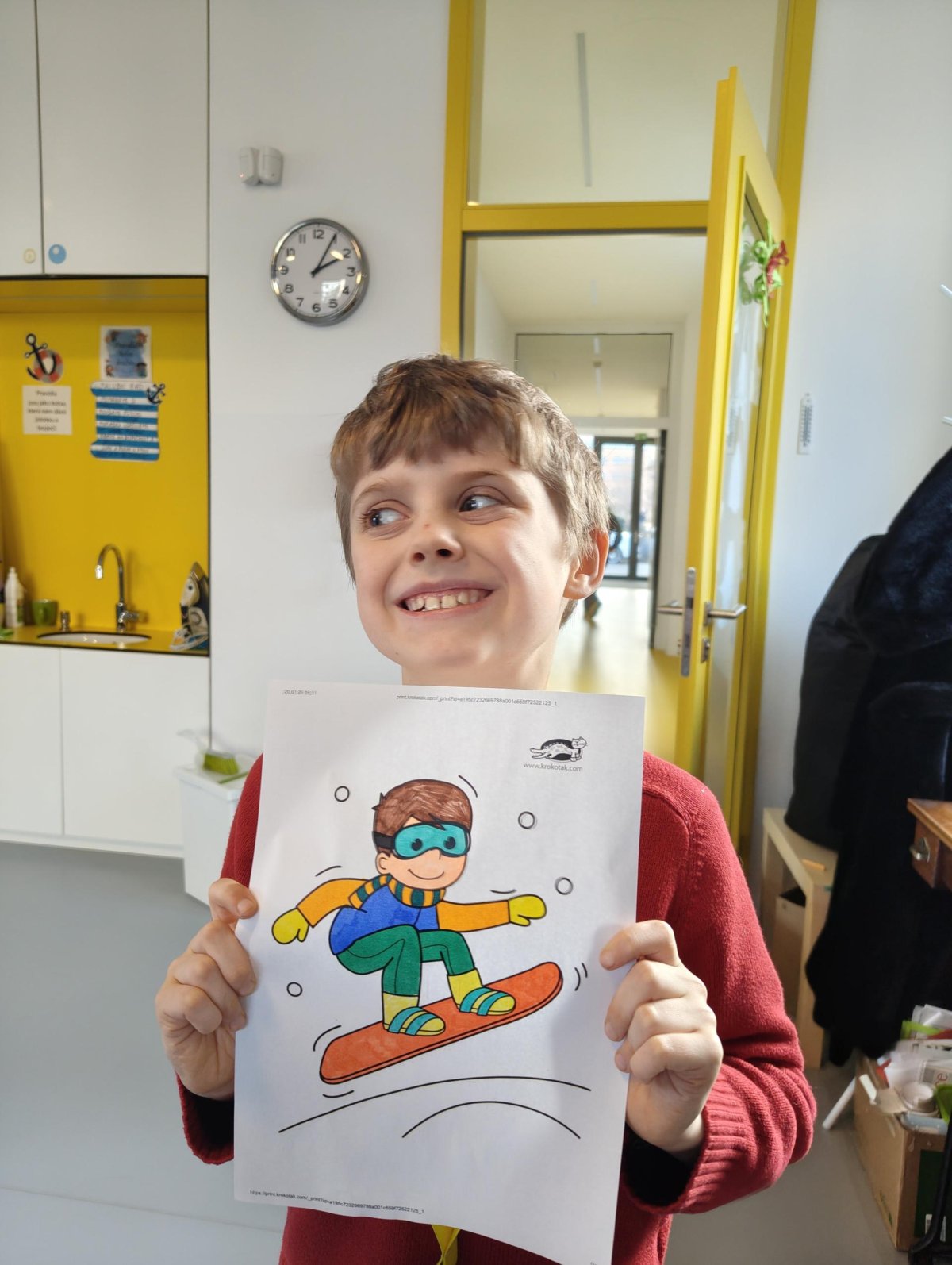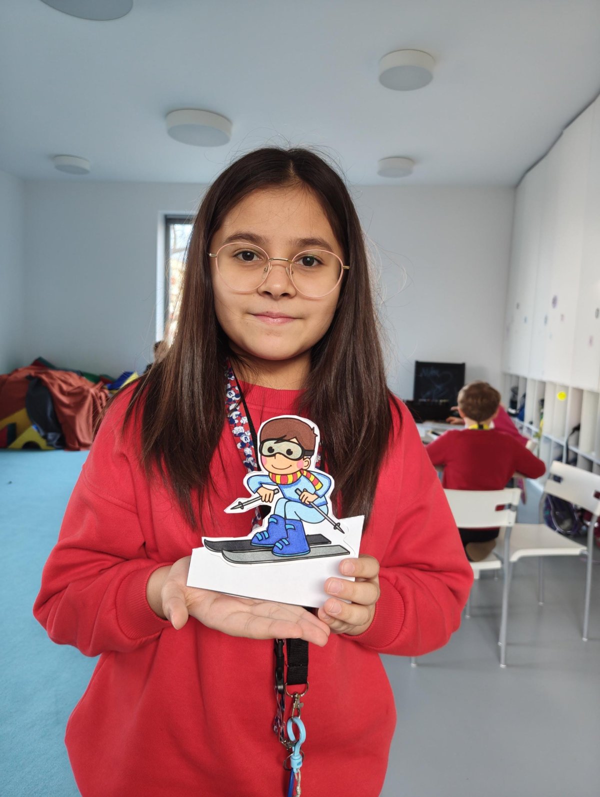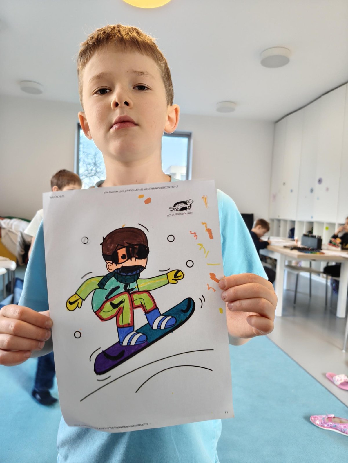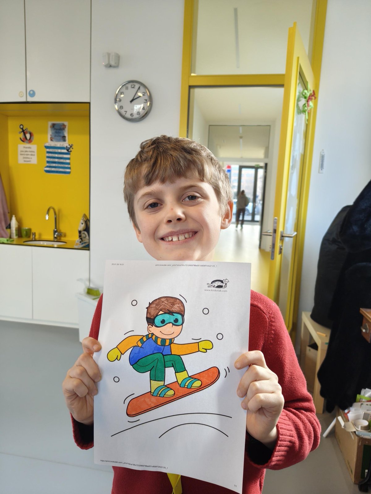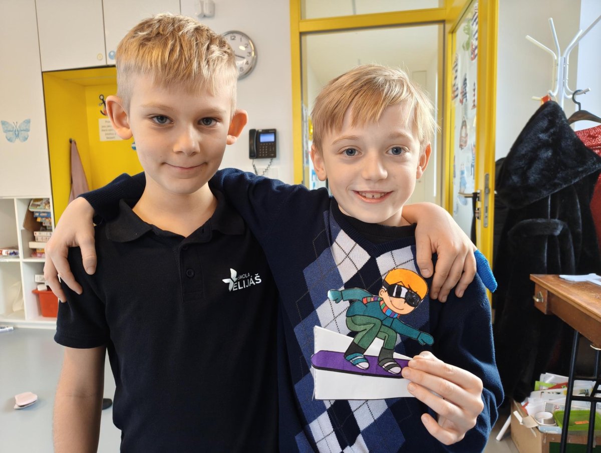 Dnes jsme si ve družině povídali o zimních sportech. Každý vyprávěl, kdo a kde lyžoval, jaké měl zážitky z hor a kdo už lyžovat umí nebo se teprve učí. Mezitím jsme vybarvovali obrázky lyžařů a lepili postavičky na sněhové kopce. Každý měl oblečení lyžaře vybarvené buď podle vlastní fantazie, nebo podle toho, co měl na sobě na horách.