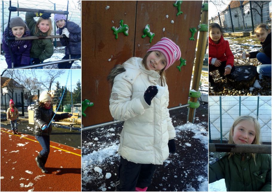 Po včerejší sněhové nadílce nás dnes potěšilo sluníčko. Na hřišti zůstaly zbytky sněhu a děti se s ním ješte mohli koulovat. Zmrzlý sníh se prodával, stavěli se věže nebo mini sněhuláky.