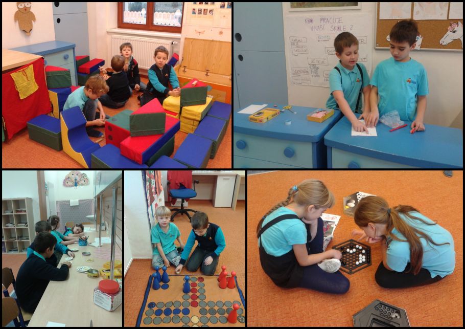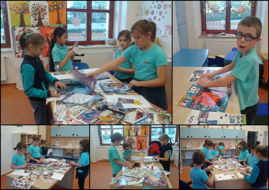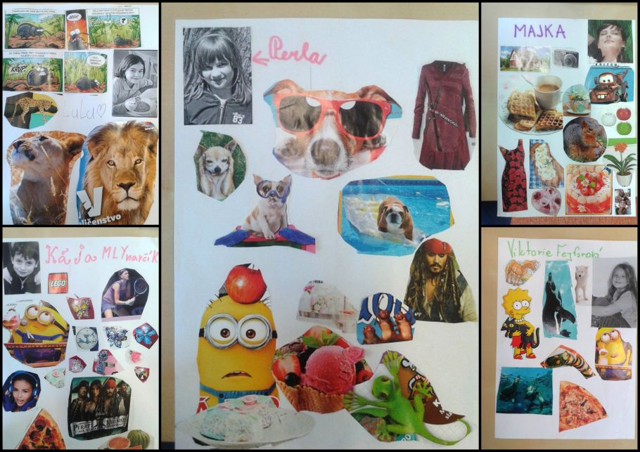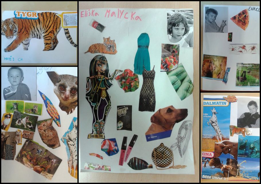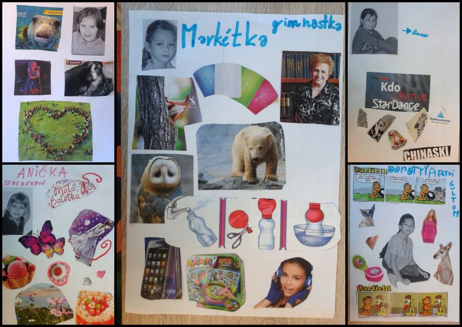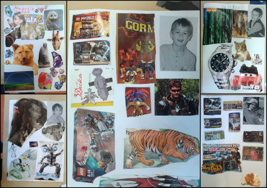 Dnes jsme vyráběli svůj profil. Každý dostal A4 se svojí fotkou a jeho úkolem bylo vyhledat, vystřihnout, nalepit z časopisů, letáků něco, co ho charakterizuje, co má rád - co ho baví. A tak děti střihaly, studovaly, lepily, mluvily a hledaly, co by na ten papír nalepily.