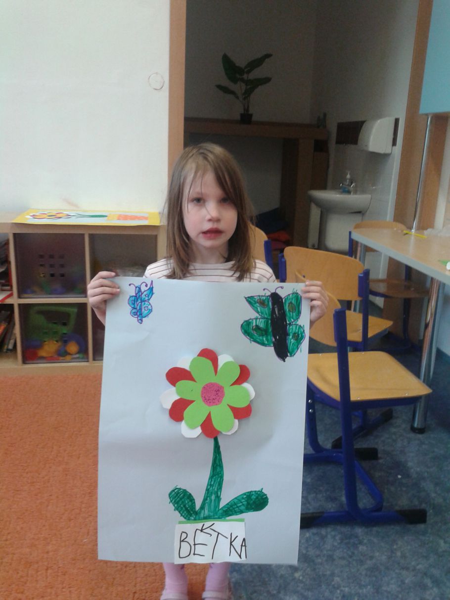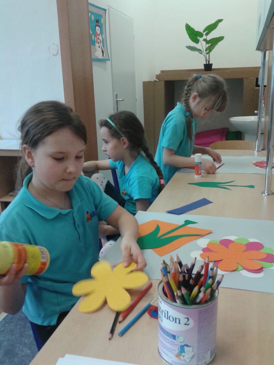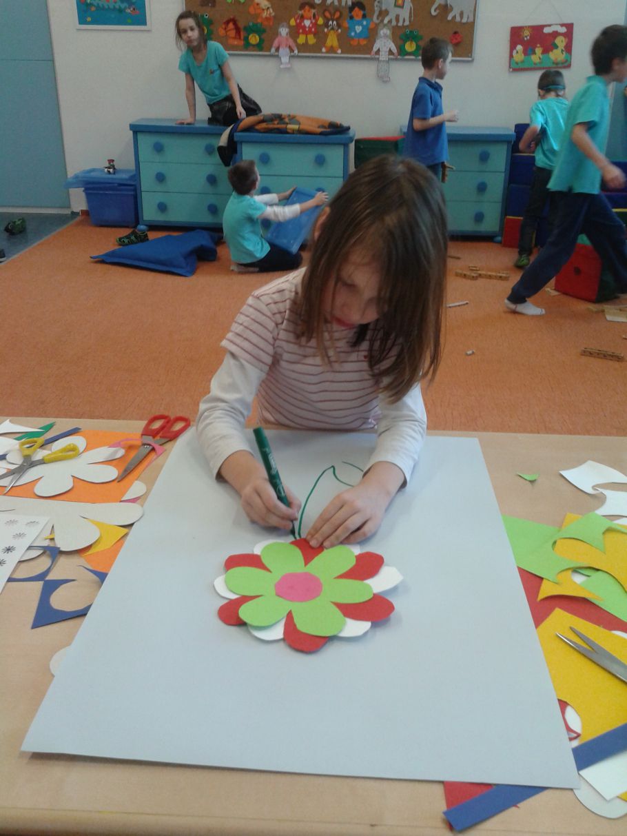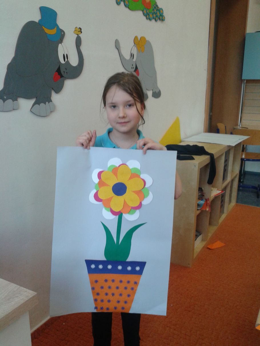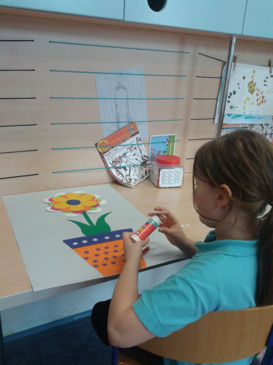 Dnes jsme v družině vyráběli obraz - kytička v květináči. Pracovali jsme s různými barvami, hodně jsme stříhali až nás boleli prsty. Naše obrazy jsou pestré a veselé.