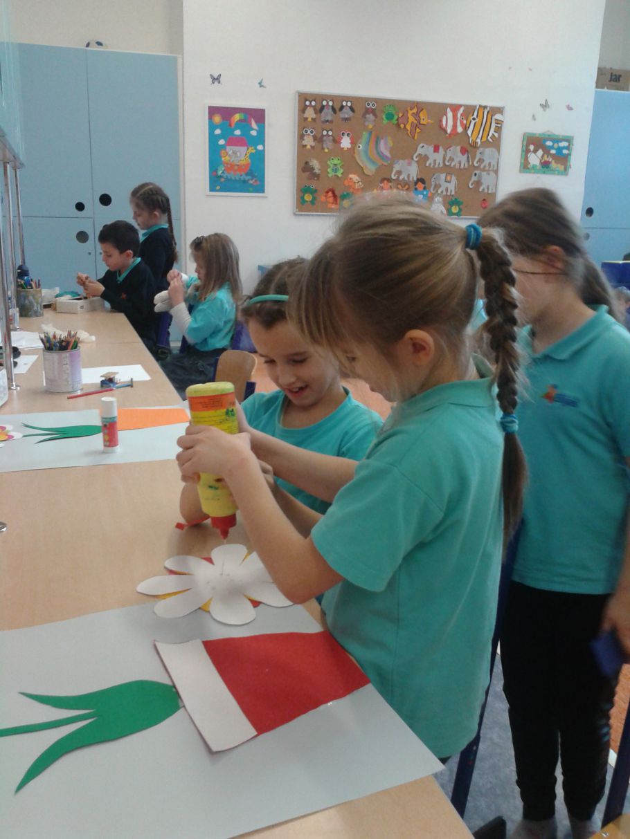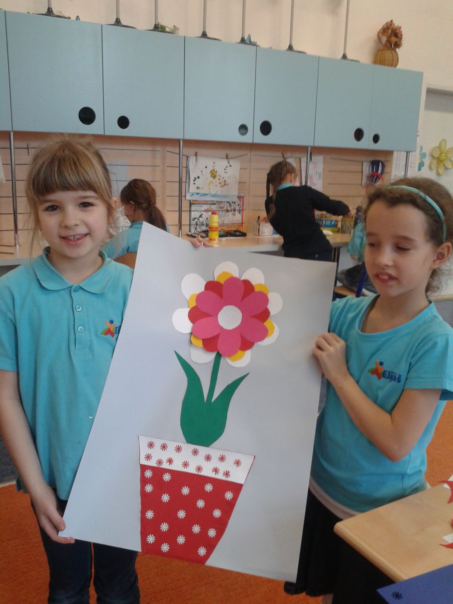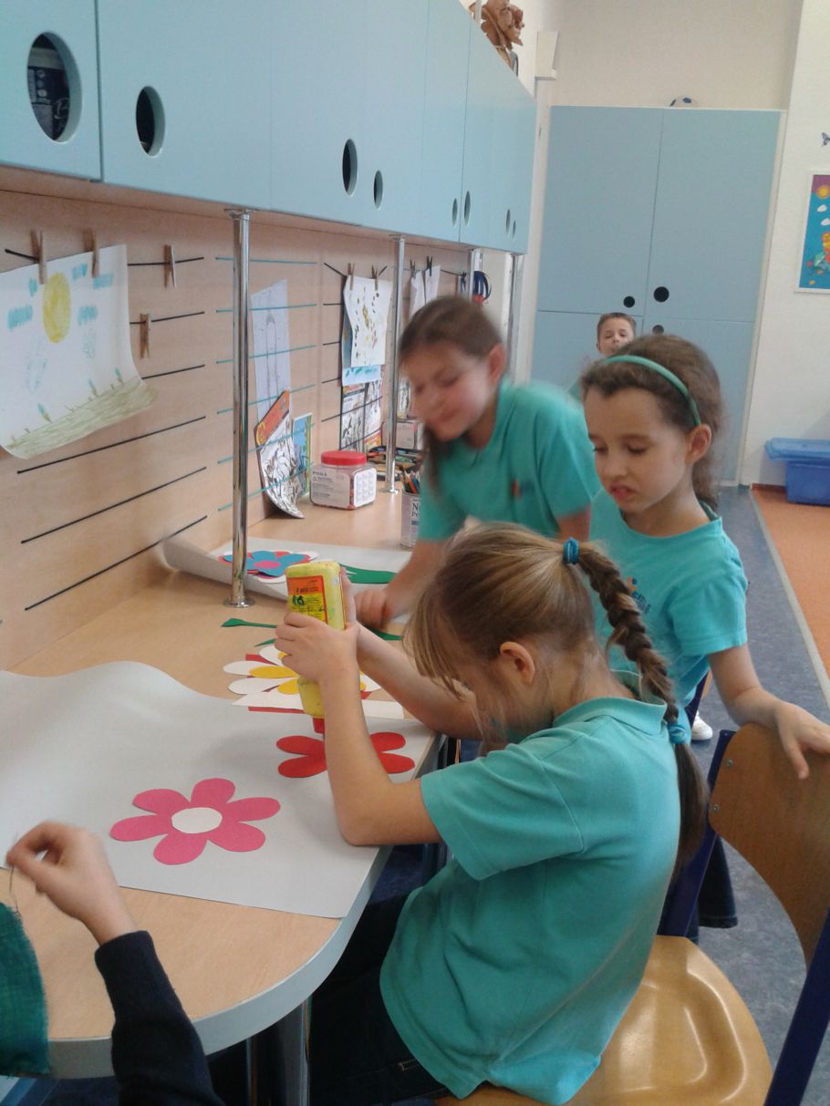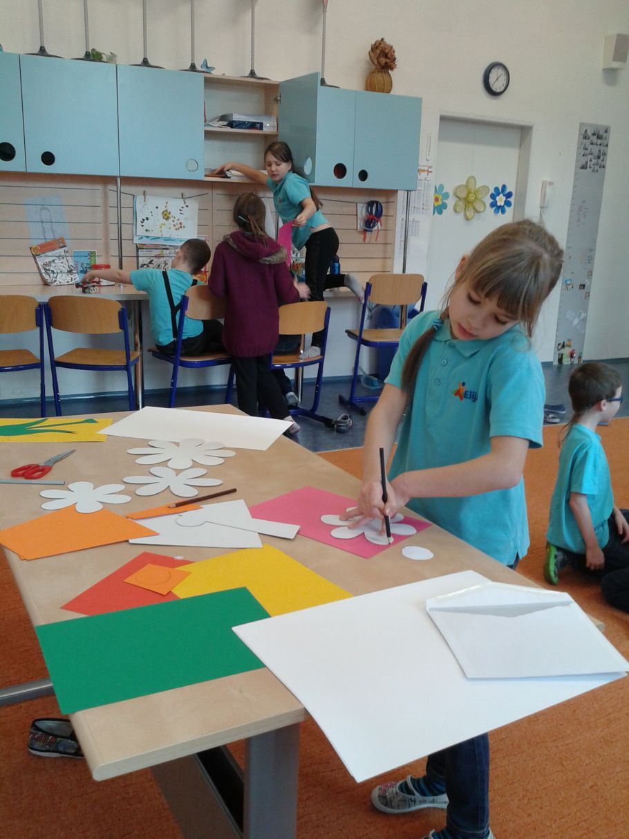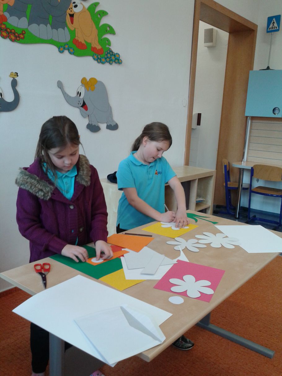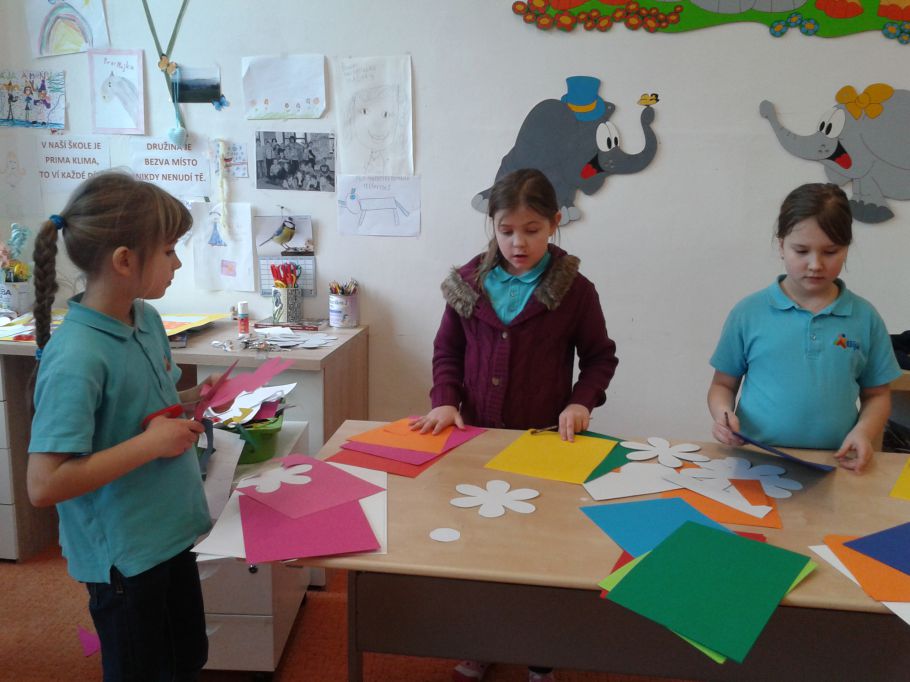 Dnes jsme v družině vyráběli obraz - kytička v květináči. Pracovali jsme s různými barvami, hodně jsme stříhali až nás boleli prsty. Naše obrazy jsou pestré a veselé.