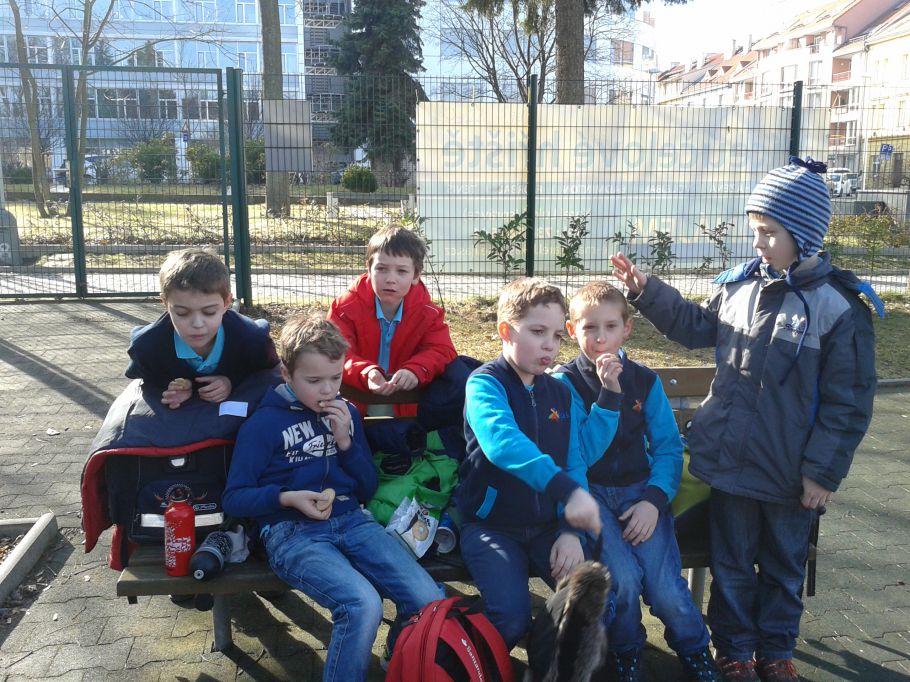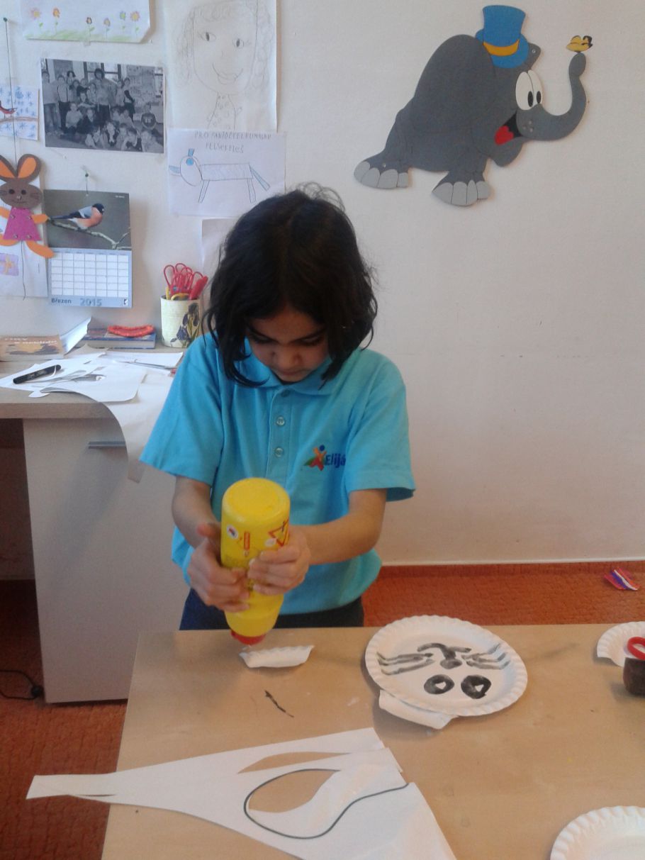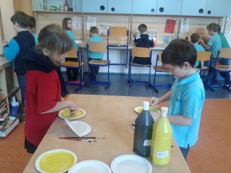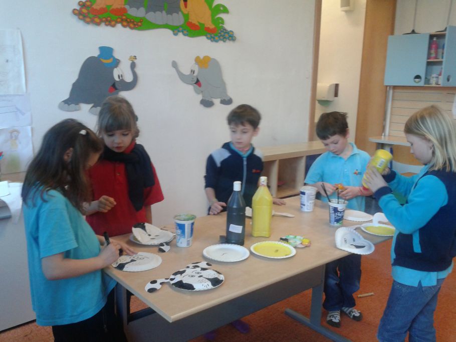 Dnes jsme si v družině vyrobili pejska a kočičku. Měli jsme také angličtinu a  tanečky. Venku krásně svítilo sluníčko tak jsme byli na hřišti a bylo to fajn.