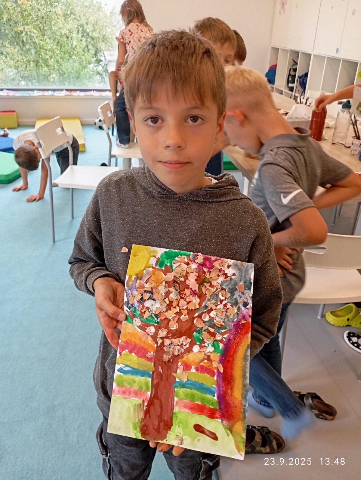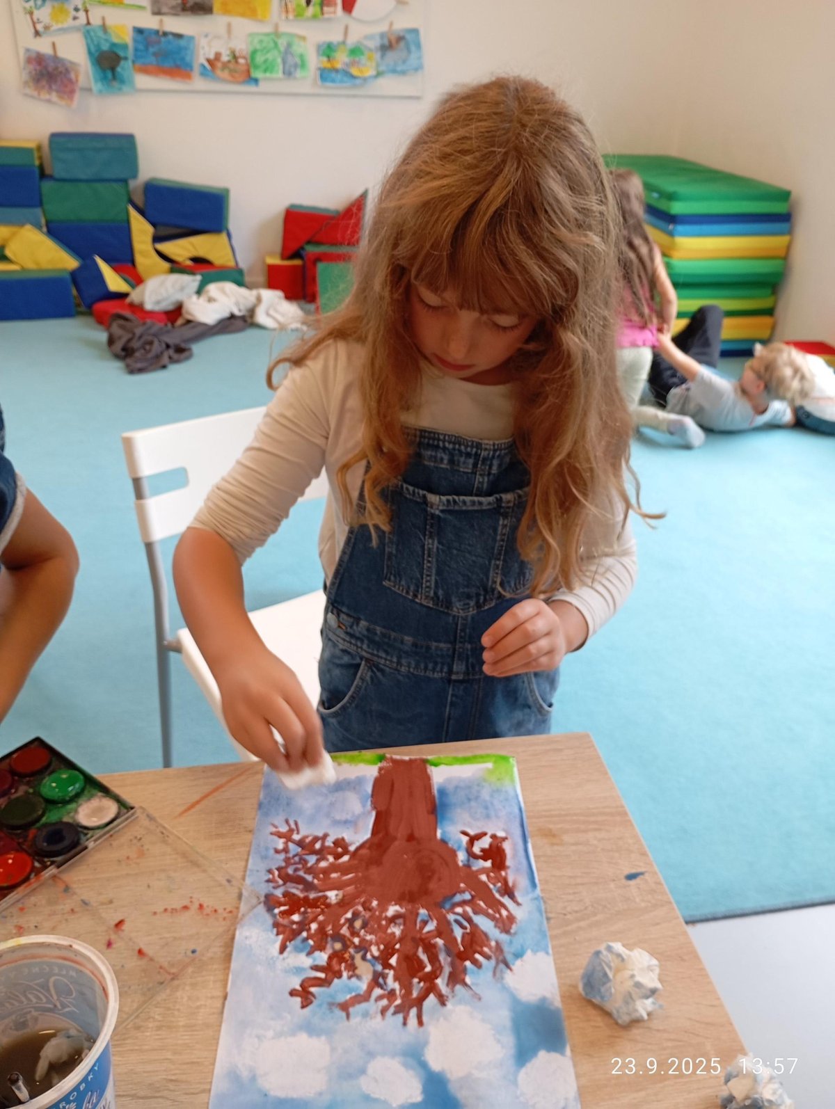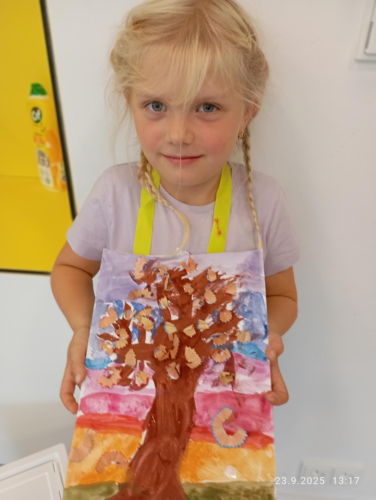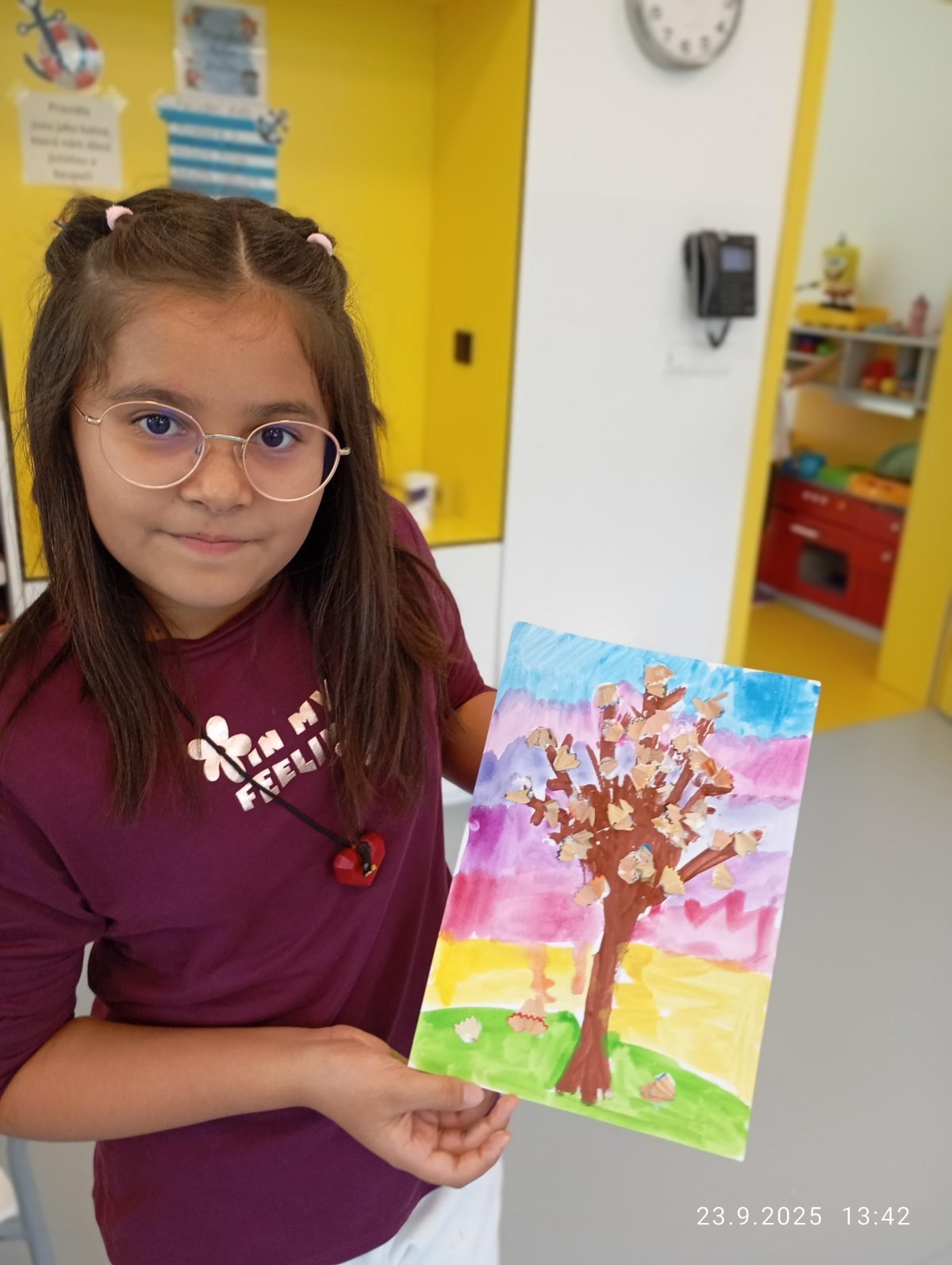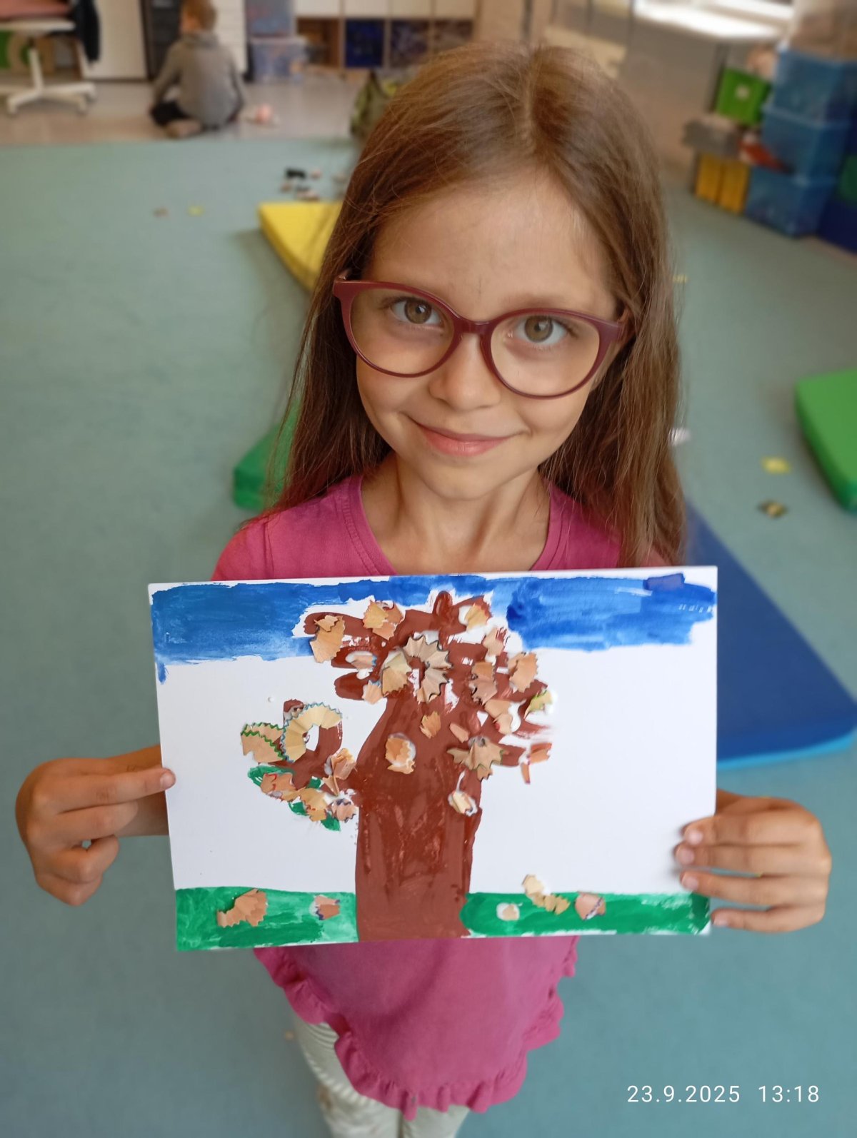 Podzim se nám hlísí hlavně detivým a chladným počasím. Takové dny jsou jako stvořené na vyrábění. Obtiskli jsme si dlaně a domalovali každý svůj strom, pak přišlo na řadu pozadí. místo listů jsme použili hoblinky z ořezaných pastelek. Zaschlé obrázky jsme projeli laminovačkou, aby nám neopadaly a dílo vylo na světě. Na koberci si děti hrají karty, nebo staví z různých stavebnic, děvčátka malují nebo vybarvují omalovánky.