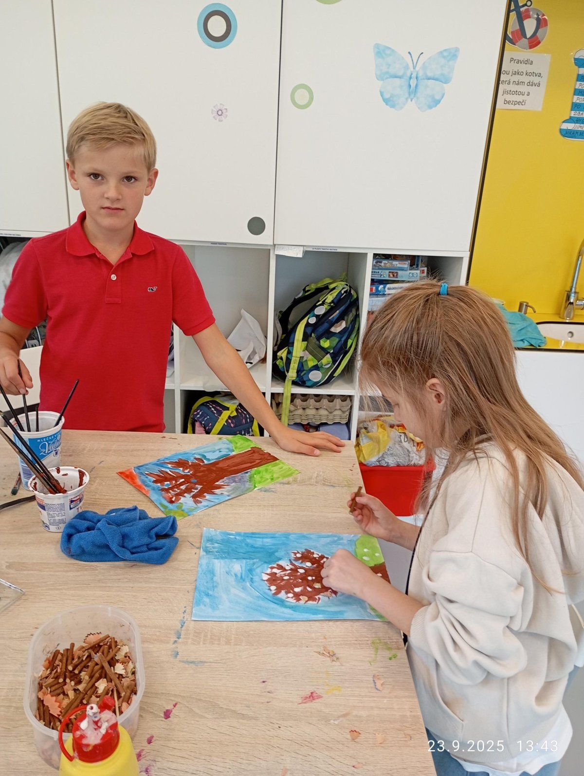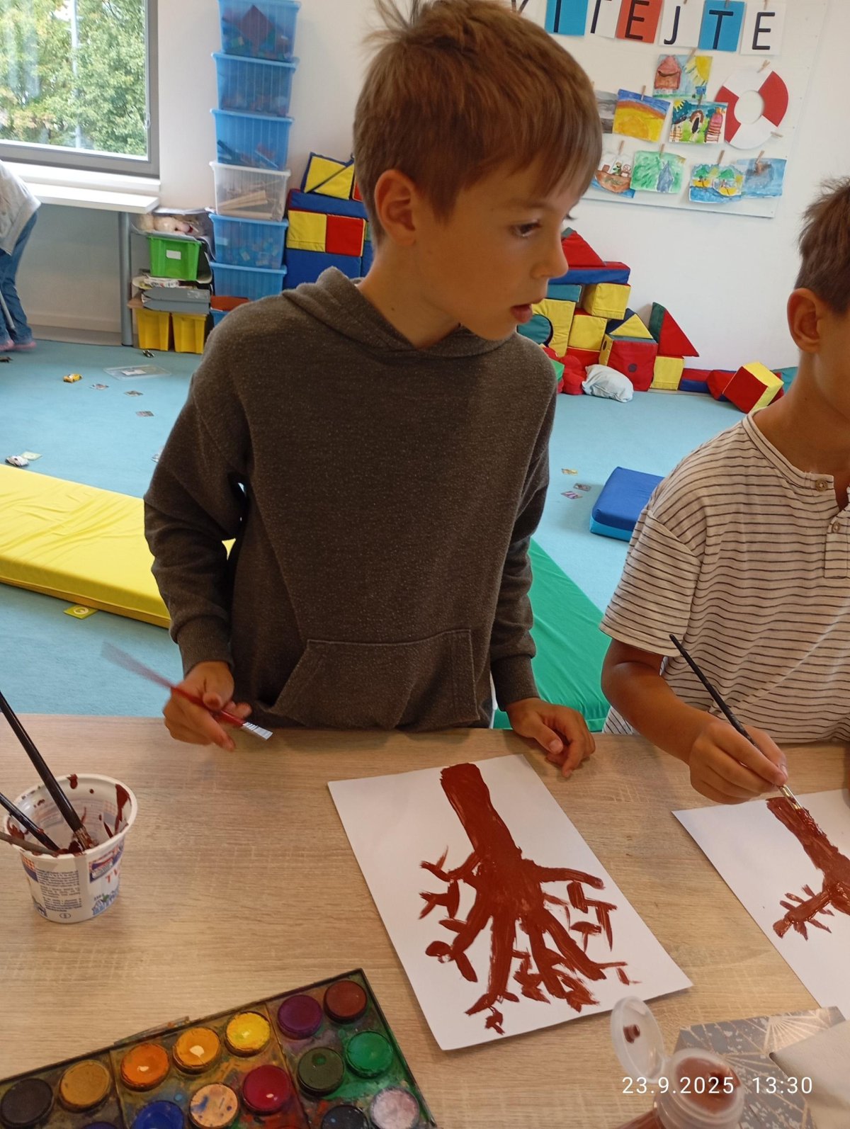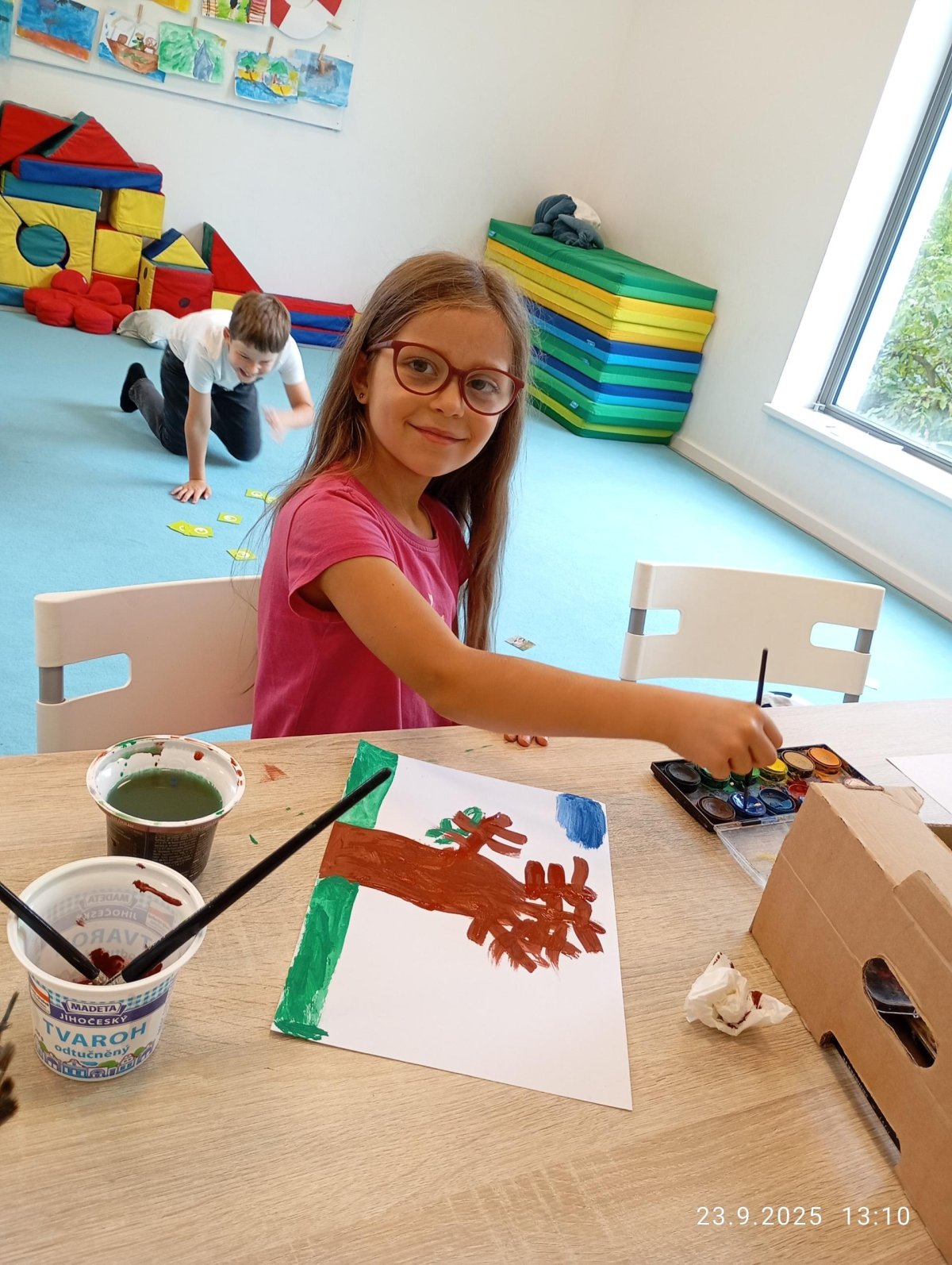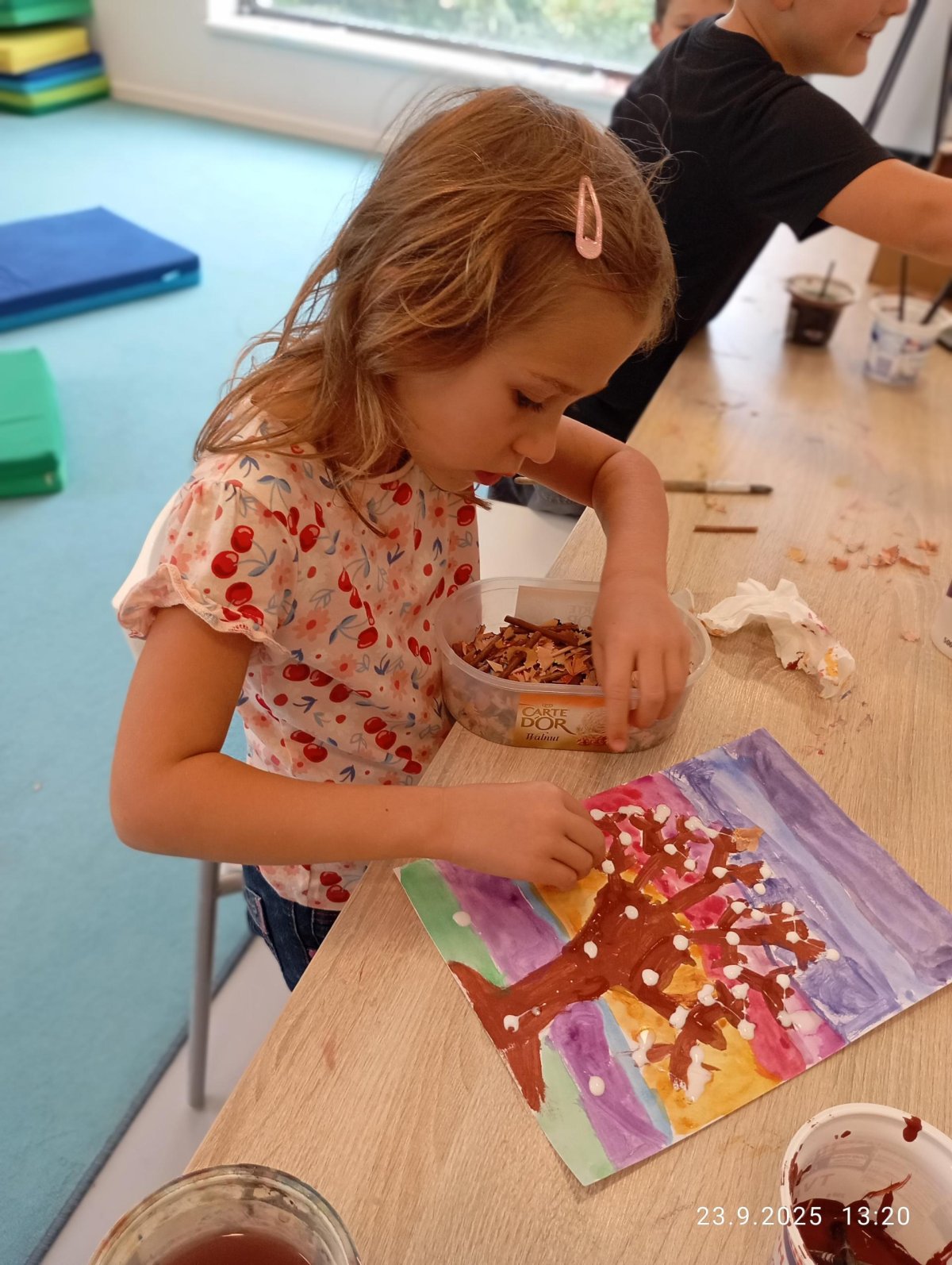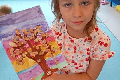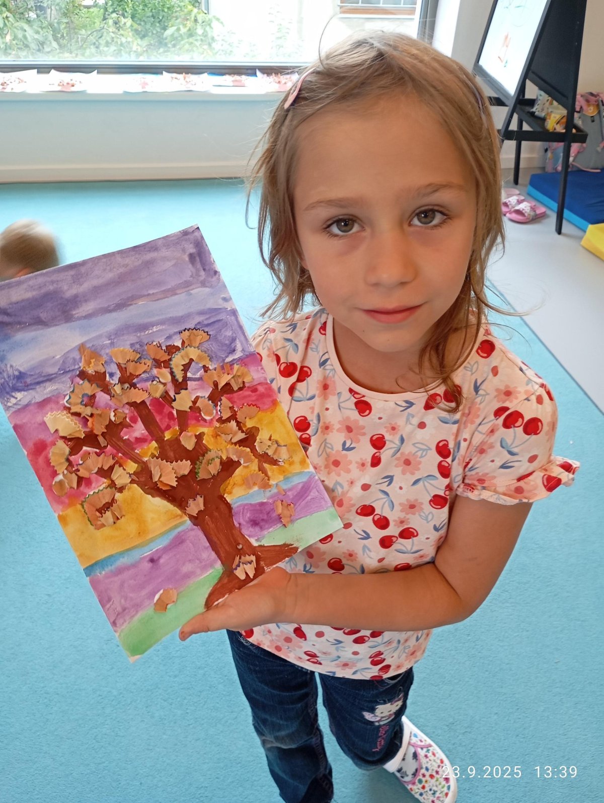 Podzim se nám hlísí hlavně detivým a chladným počasím. Takové dny jsou jako stvořené na vyrábění. Obtiskli jsme si dlaně a domalovali každý svůj strom, pak přišlo na řadu pozadí. místo listů jsme použili hoblinky z ořezaných pastelek. Zaschlé obrázky jsme projeli laminovačkou, aby nám neopadaly a dílo vylo na světě. Na koberci si děti hrají karty, nebo staví z různých stavebnic, děvčátka malují nebo vybarvují omalovánky.