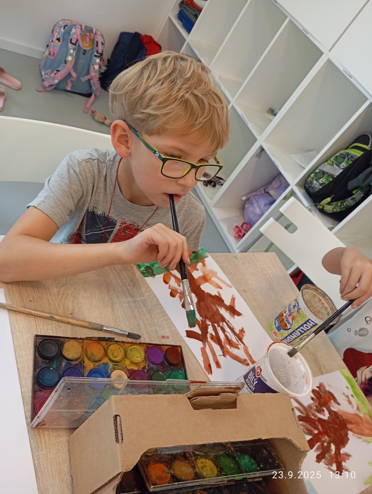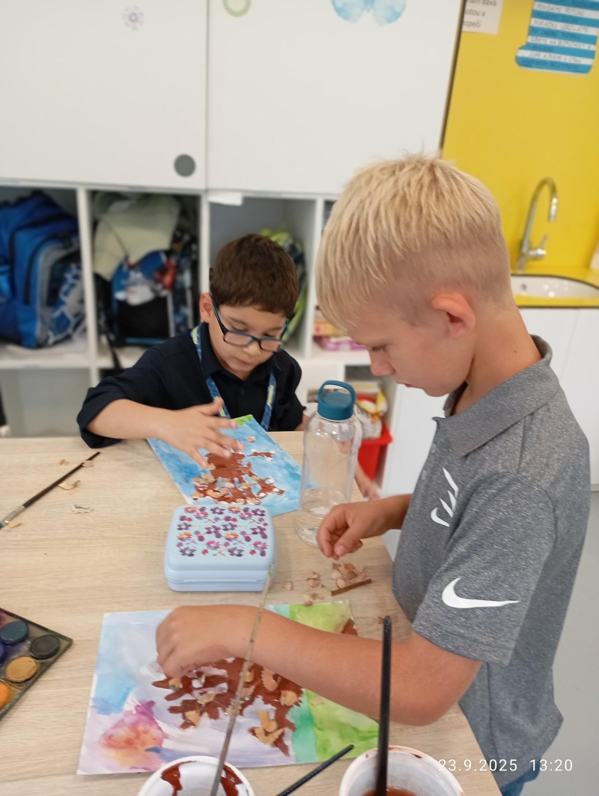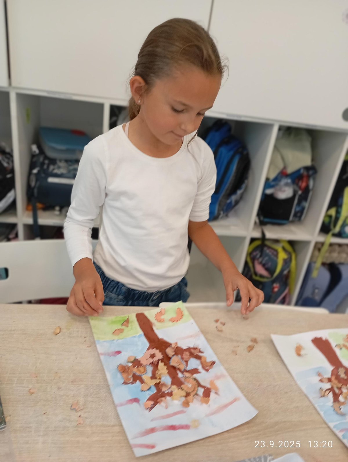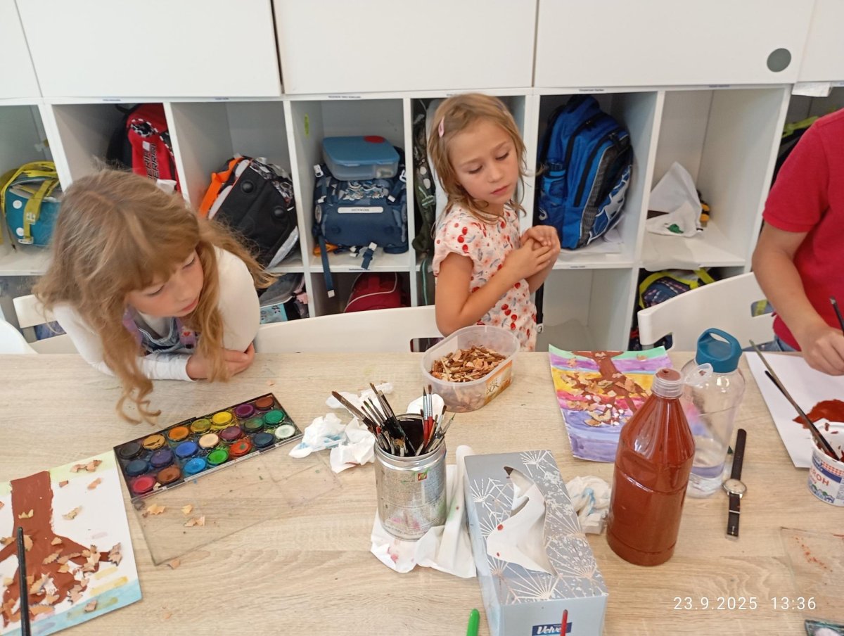 Podzim se nám hlísí hlavně detivým a chladným počasím. Takové dny jsou jako stvořené na vyrábění. Obtiskli jsme si dlaně a domalovali každý svůj strom, pak přišlo na řadu pozadí. místo listů jsme použili hoblinky z ořezaných pastelek. Zaschlé obrázky jsme projeli laminovačkou, aby nám neopadaly a dílo vylo na světě. Na koberci si děti hrají karty, nebo staví z různých stavebnic, děvčátka malují nebo vybarvují omalovánky.