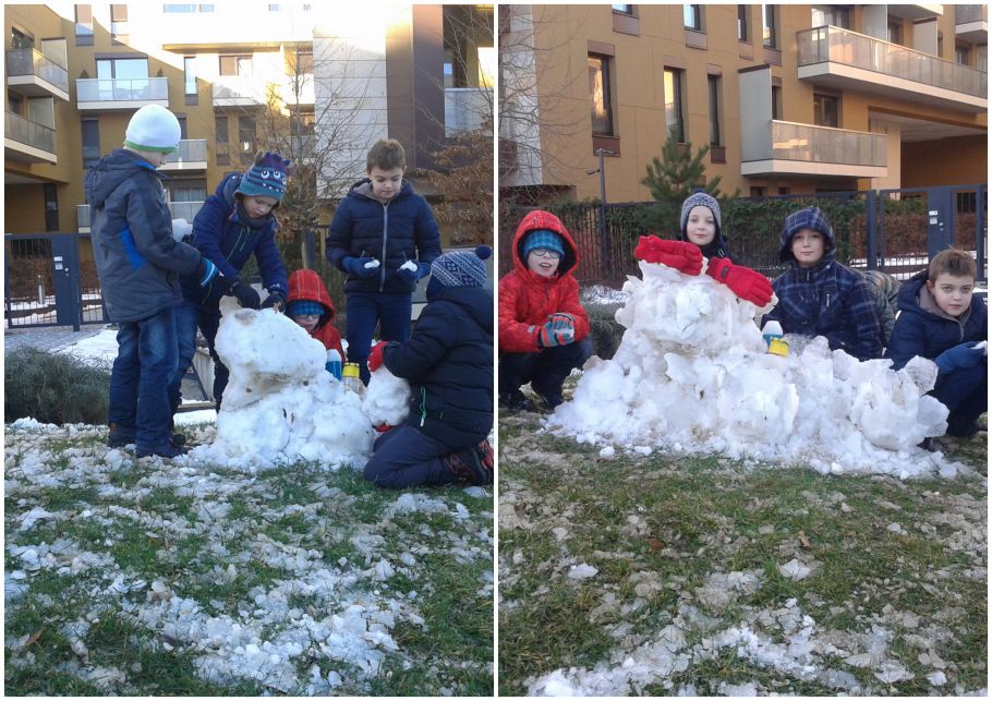 Celý týden jsme se těšili ven, kde jsme si užívali sněhu. Vzhledem k oteplení a pomalému roztávání nám na dvoře zůstala jenom voda. V Baarově parku jsme ale nalezli poslední zbytky, tak jsme si je v plné parádě znova užili. Dětem se povedlo postavit velkého sněhuláka, ale i malé výtvory. Čas tak rychle utekl a rodiče přicházeli, že jsme se museli vrátit do družiny, i když se nám nechtělo. Věříme, že sníh ještě napadne a že si ho také užijeme i na lyžáku.