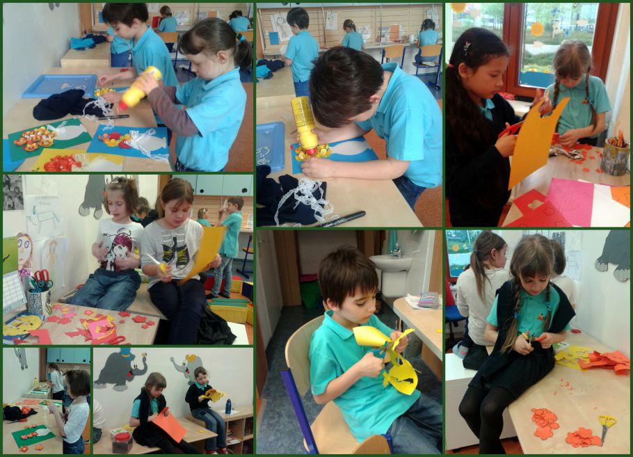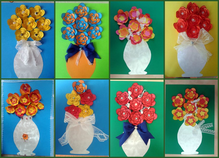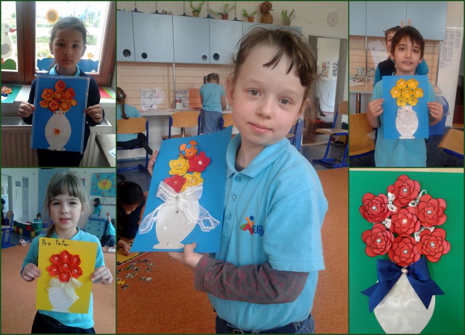 Ve čtvrtek jsme pokračovali v načaté práci pro naše maminky. Vzhledem k tomu, že jsem zvolila trošku náročnější dárek, bylo nutné na něm pracovat dva dni. Děti statečne vystřihovaly kytičky a lepili jednu na druhou. Následně na to vystřihovali vázu, střihali stuhu, lepili korálky až byl dárek úplně hotov. Musím říct, že se všem jejich trpělivost oplatila. Obrázky jsou opravdu krásne.