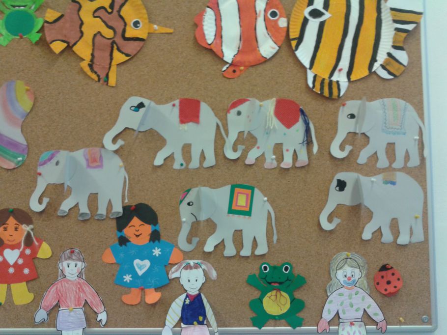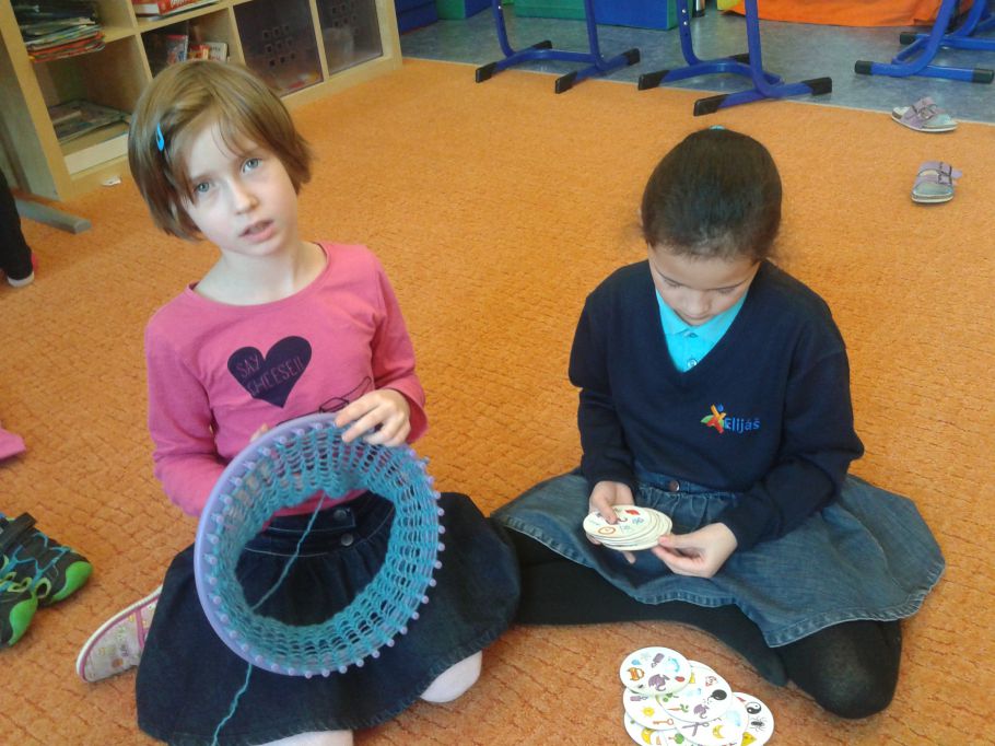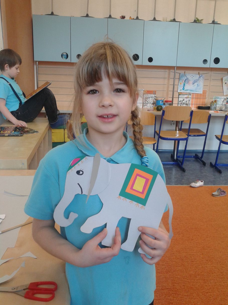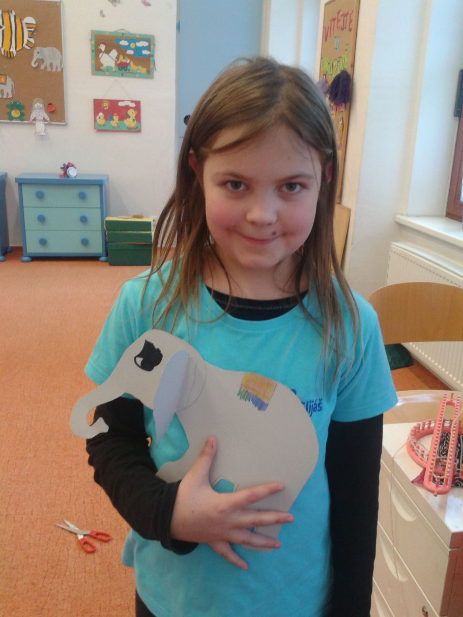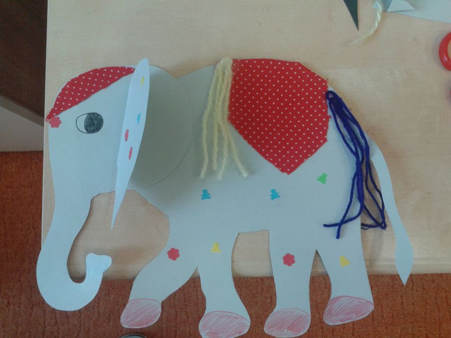 V poslední době vyrábíme z papíru různá zvířátka. Naše nástěnka se jimi postupně zaplňuje. Už tam máme sovy, žabky, koně, ryby a dnes tam přibyli i slony. Jsou to slony ochočené a dá se na nich jezdit. Už je z toho malé ZOO. Průběžně se děti hrály v domečcích, nebo pletly na pletacích kruzích.