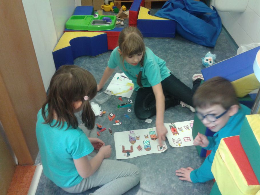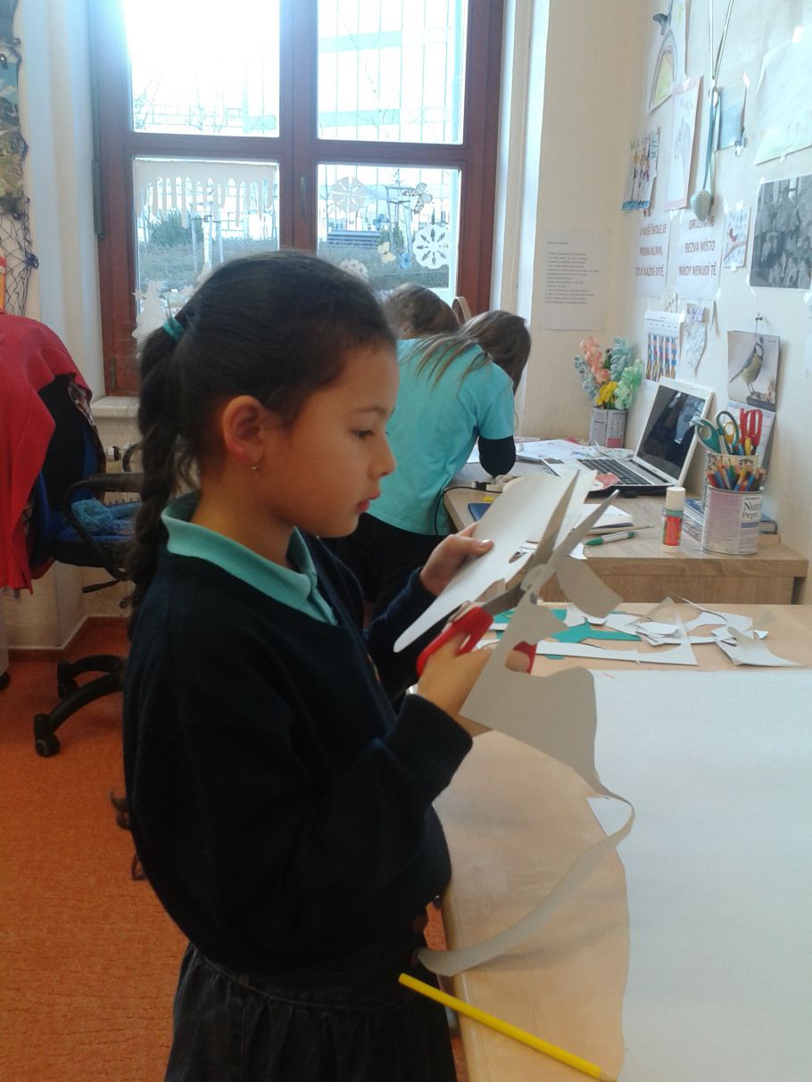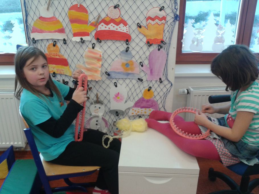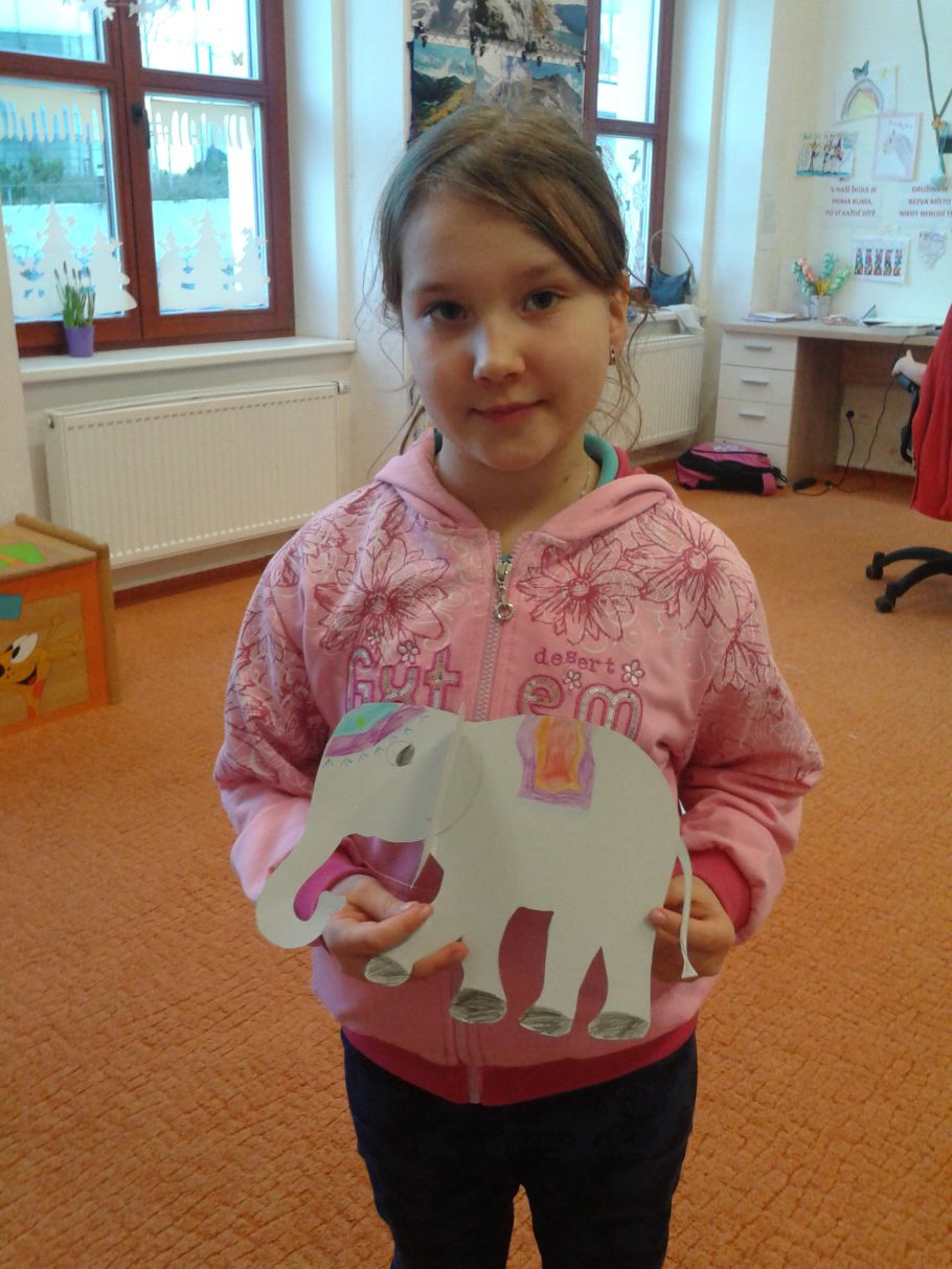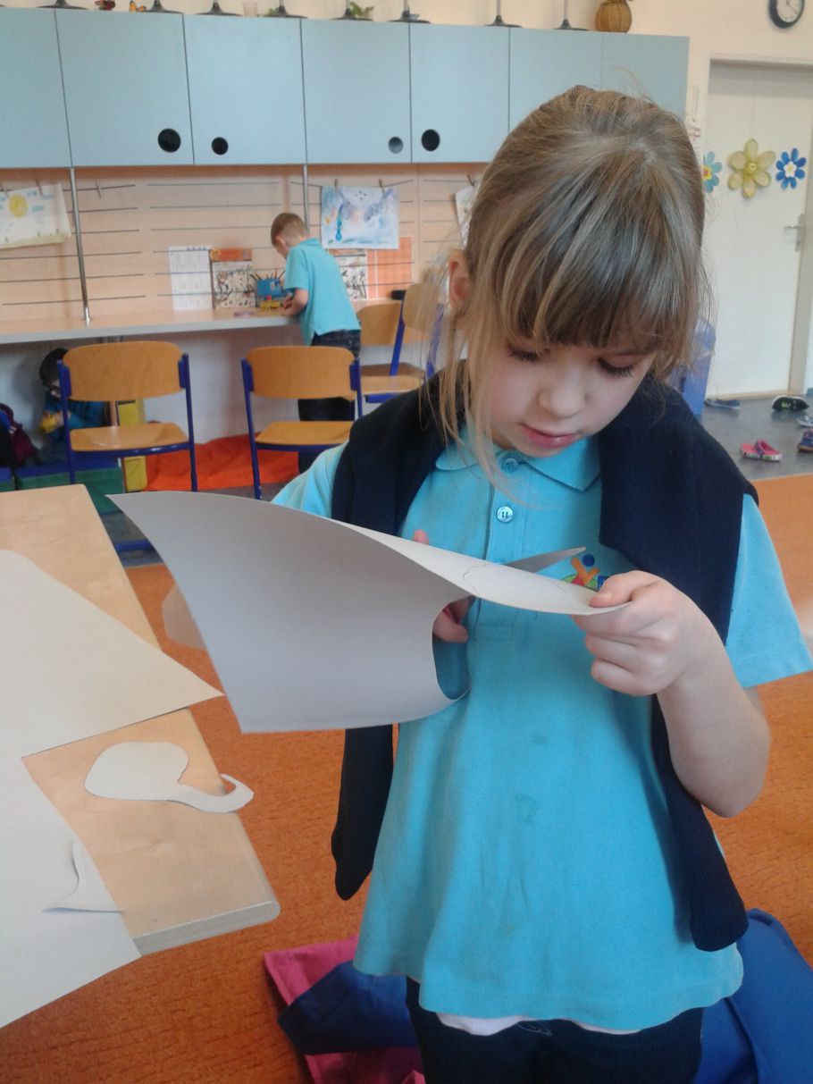 V poslední době vyrábíme z papíru různá zvířátka. Naše nástěnka se jimi postupně zaplňuje. Už tam máme sovy, žabky, koně, ryby a dnes tam přibyli i slony. Jsou to slony ochočené a dá se na nich jezdit. Už je z toho malé ZOO. Průběžně se děti hrály v domečcích, nebo pletly na pletacích kruzích.