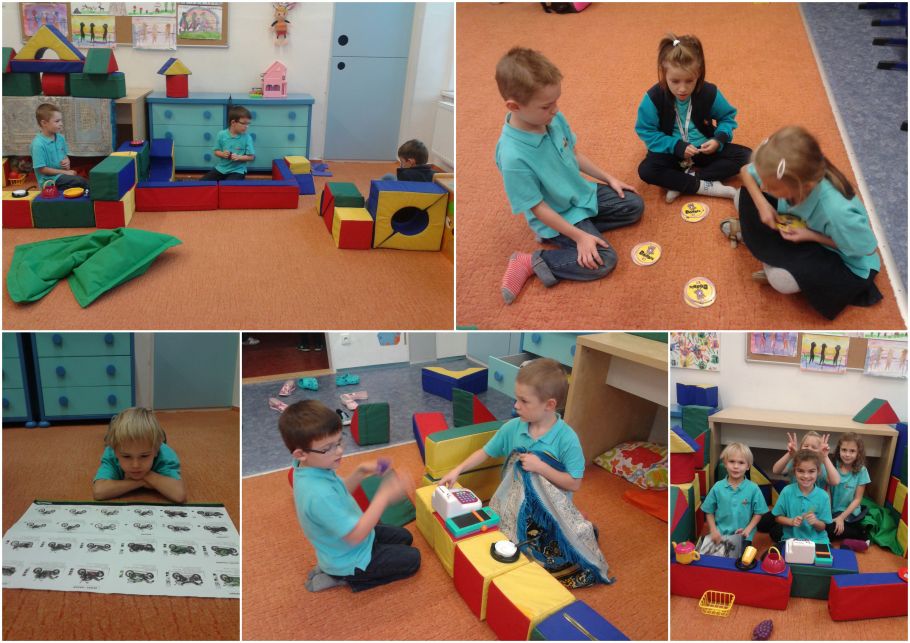 Je středa a to je den, kdy máme plavání a děti se na něj moc těší. My ostatní jsme si jako každý den postavili domeček z molitánků a prodávali zboží, které bylo v nabídce.