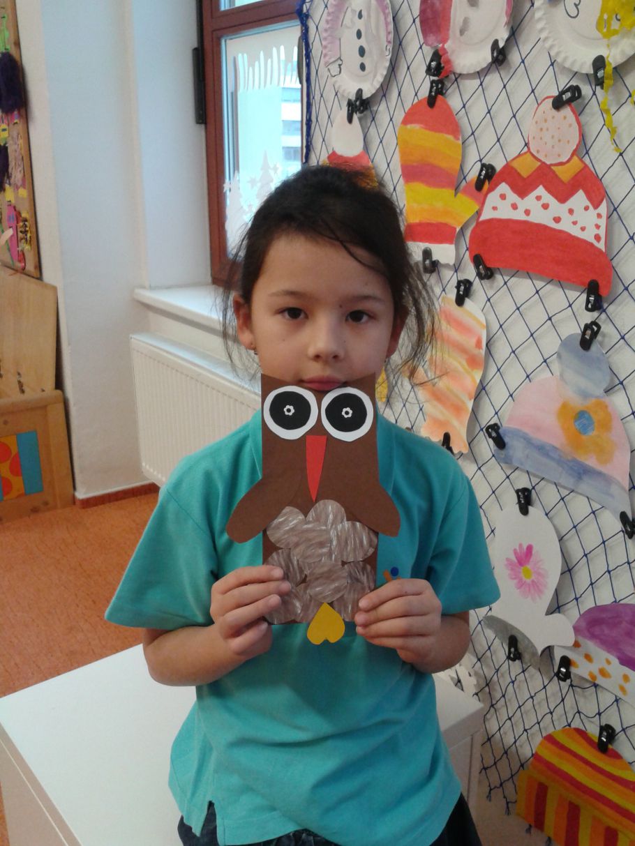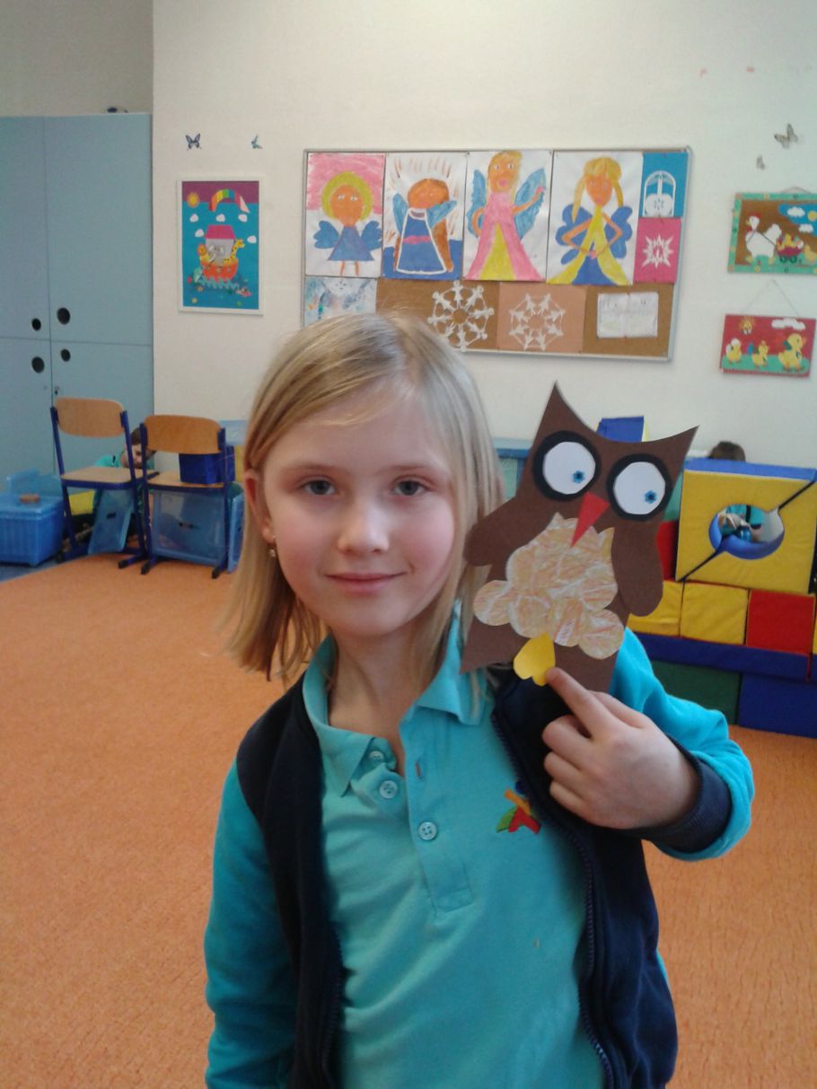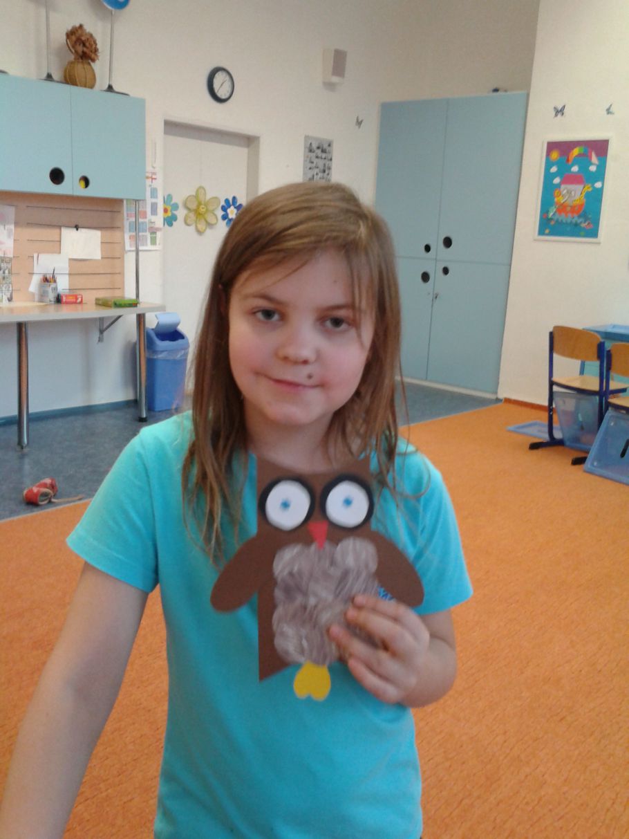 Dnes jsme si přečetli příběh o tvrdohlavém koníkovi Hnědovláskovi. Chlapci si postavili domečky z molitanových kostek a děvčata vyráběla sovičky z tvrdého papíru. Moc se nám povedly. Venku jsme si zaběhali v hale s ostatními družinami, zahráli si fotbal a nohejbal.