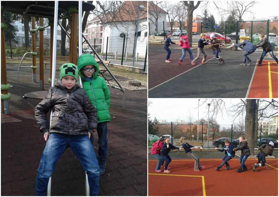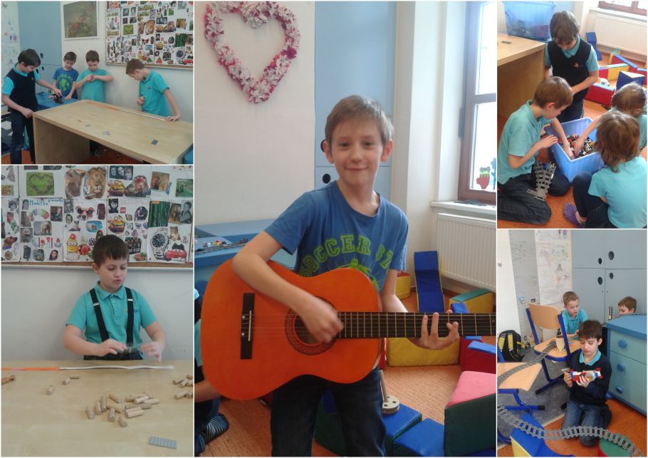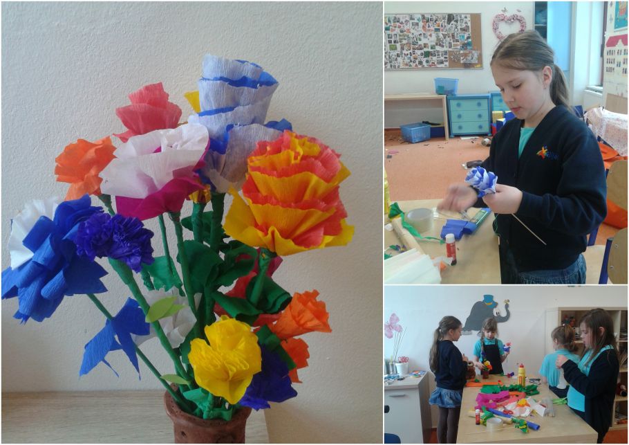 Čtvrtkové odpoledne se neslo v duchu vyrábění krepových kytiček do vázy. Děvčata byla tvořivá a dařilo se jim. V poslední době si kluci často hrají s legem, tvoří různé stavby, stroje, železnici a dlouho si u toho povídají a píší domácí úkoly. Venku bylo nádherně a tak jsme vyběhli na hřiště. Zahráli jsme si přetahovanou, přeskakovali jsme lano, běhali jsme a moc jsme se nasmáli.