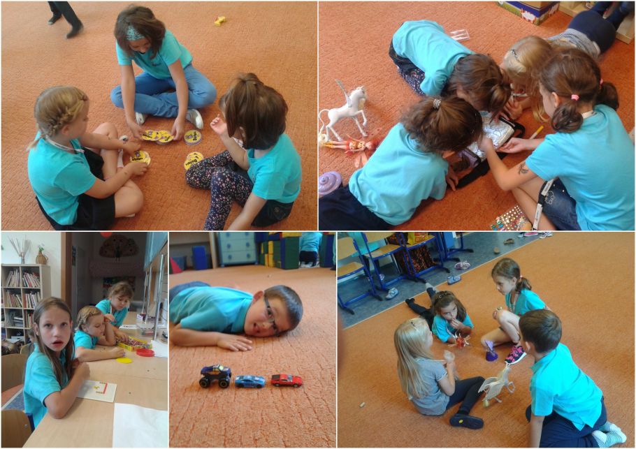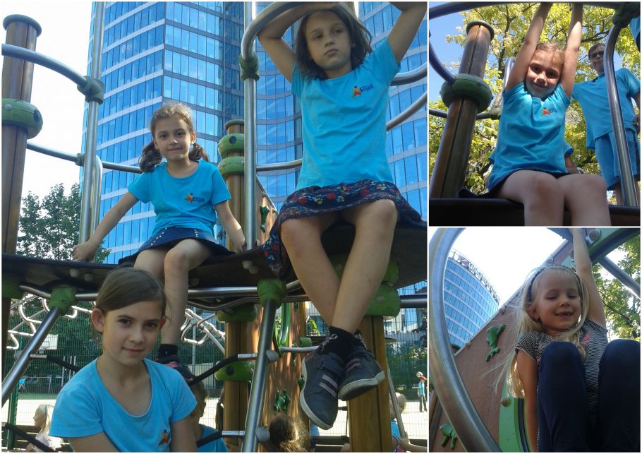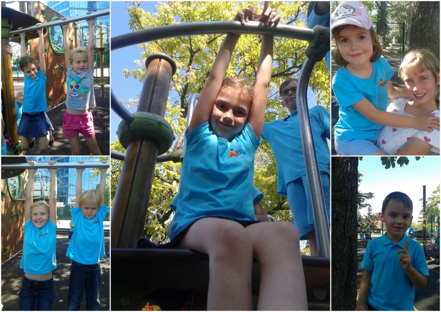 Venku jsme na hřišti soutěžili v tom, kdo se nejvíce udrží na hrazdě, skákali jsme na jedné noze a hráli fotbal. Užíváme si krásneho počasí.