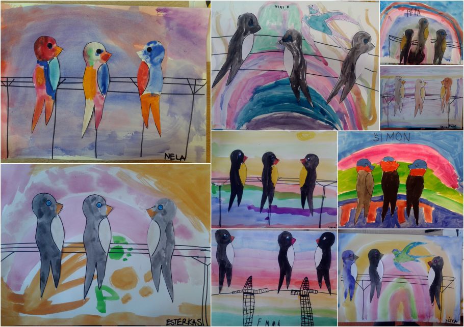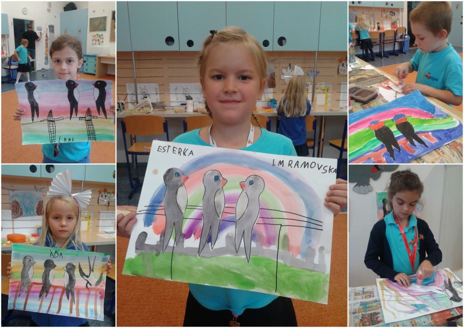 Dnes jsme se pokusili malovat vlaštovky. Měli jsme s tím hodně práce a také jsme to všichni nestihli dodělat. Naštěstí máme dobrou partu, která mi pomohla dokončit jednotlivé práce do této podoby, kterou vidíte. Stavěli jsme si domečky, korálkovali jsme a šli ven na hřiště vybít energii.