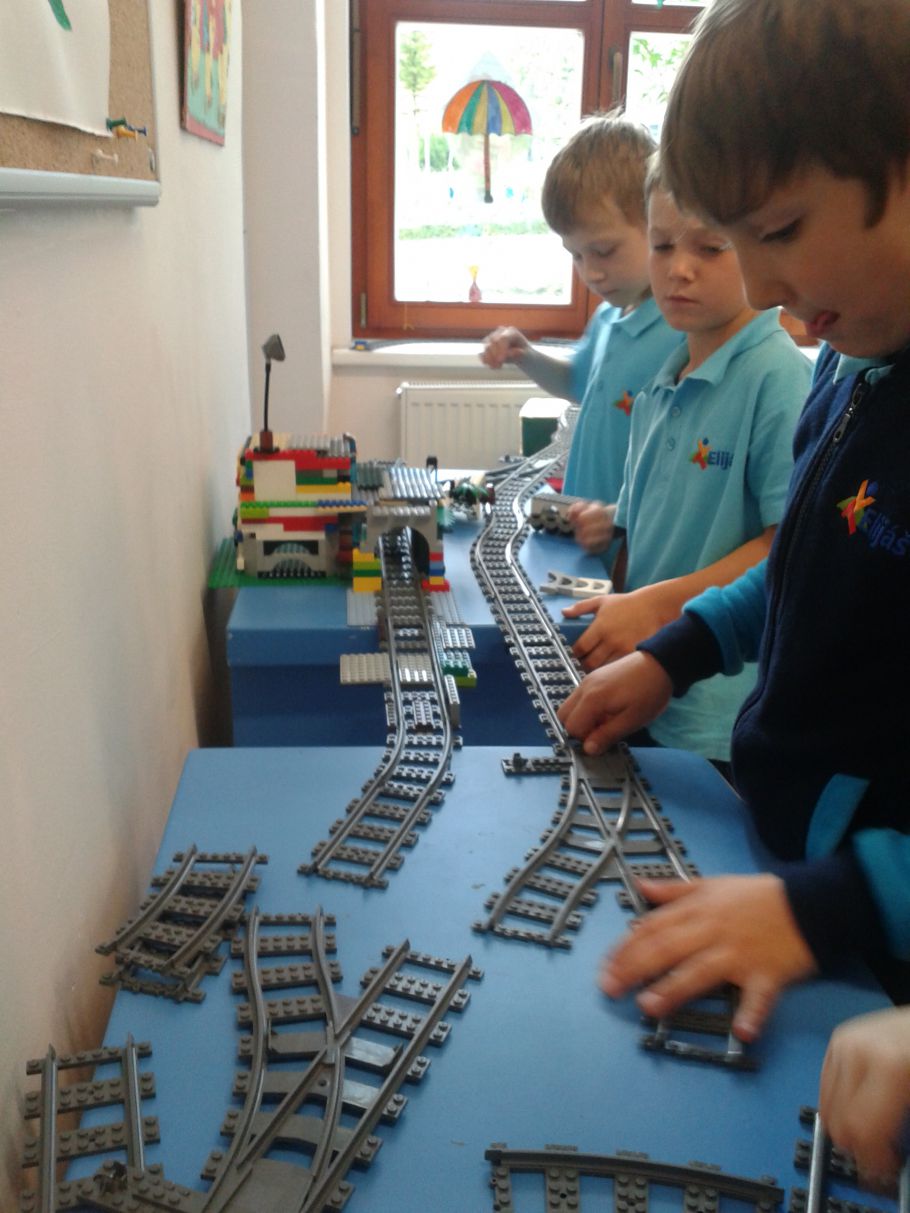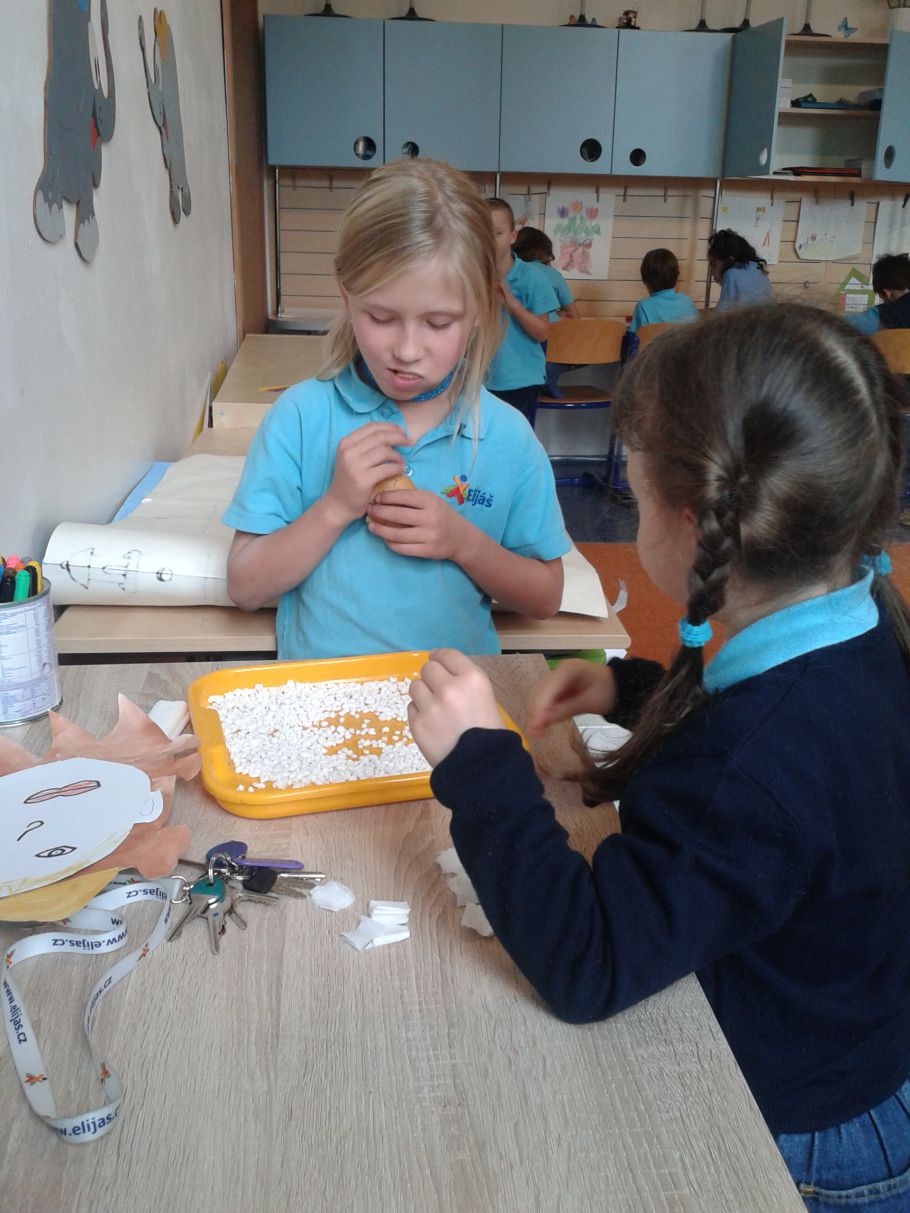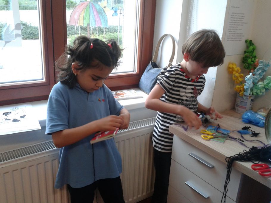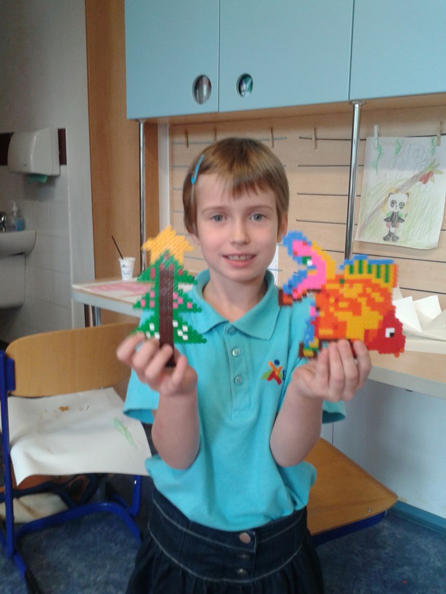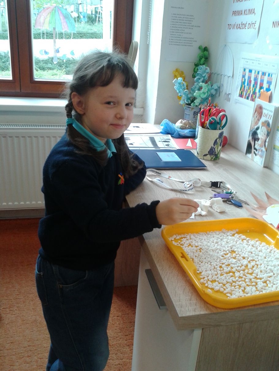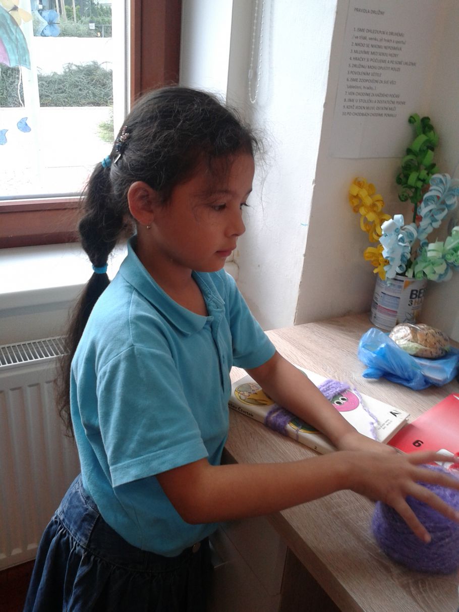 Dnes jsme pokračovali ve vyrábění kuliček z krepového papíru, abychom mohli dokončit náš obraz. Když nás už bolely prstíky, tak jsme vyráběli panenky z vlny. Jsou rozmanité. Kluci se pustili do stavby železnice. Strávili na tom hodně času. Kdo se nezapojil do žádné činnosti, ten si maloval, nebo se hrál, nebo vyráběl z korálků obrázek. Když zkončili kroužky vybrali jsme se ven, kde na nás čekaly kaštánky, barevné listy a teploučko podzimního sluníčka.