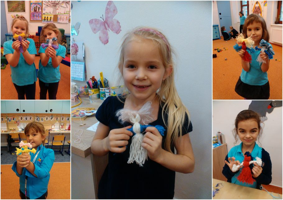 Dnešní ráno se sněhovým popraškem nás mnohé překvapil, a proto jsme si přečetli příběh o Svatém Martinovi na bílém koni. Děti vybarvili koníčka a povídali jsme si o tradicích, o posvícení a husích hodech. Jelikož máme měsíc zaměřený na to, jak se kdysi žilo a o řemeslech, povídali jsme si také o hračkách kdysi a dnes. Vyrobili jsme si panenku z vlny, s kterou si děti hráli do konce družiny v domečku od Ádi. Kluci si postavili hezkou dráhu pro autíčka a krásně jim to jezdilo. Byli u toho tak hluční, že jsme museli jít na chvíli ven, abychom nepřišli o uši.