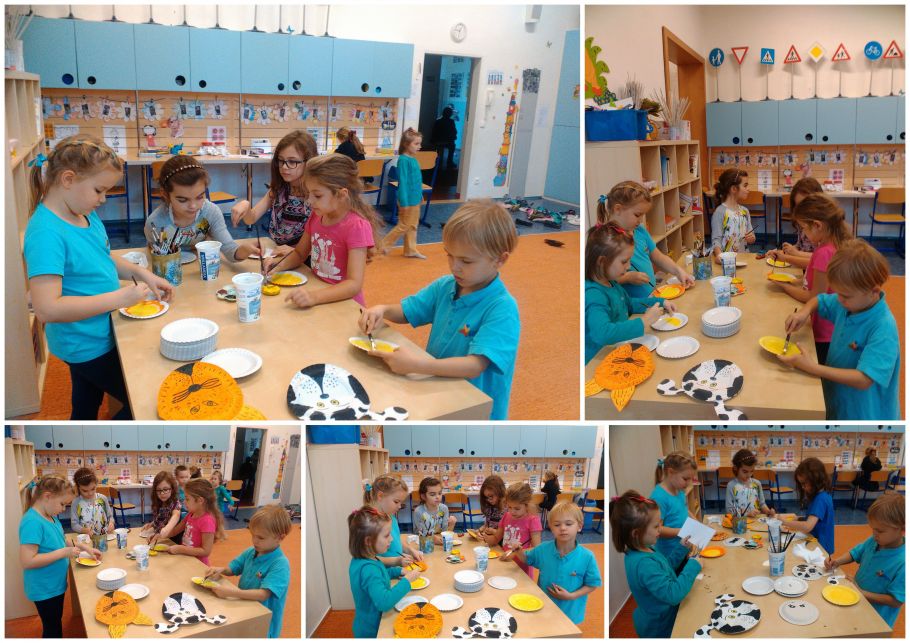 Páteční odpoledne jsme vyráběli zvířátka z papírových talířků. Děti krásně malovali, lepily a hotová zvířátka jsou také moc pěkné. Děti si hrály s domečky, hodně u toho povídaly, běhaly a nedaly se zastavit. Museli jsme jít ven vybít energii nashromážděnou po celé dopoledne ve tříde. V hale bylo zpoustu času na hru, skupinky, fotbal a honěnou. Nakonec jsme se vrátili do teplé družiny a počkali tak na své rodiče.