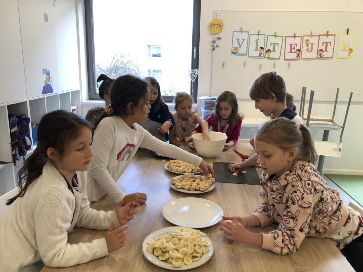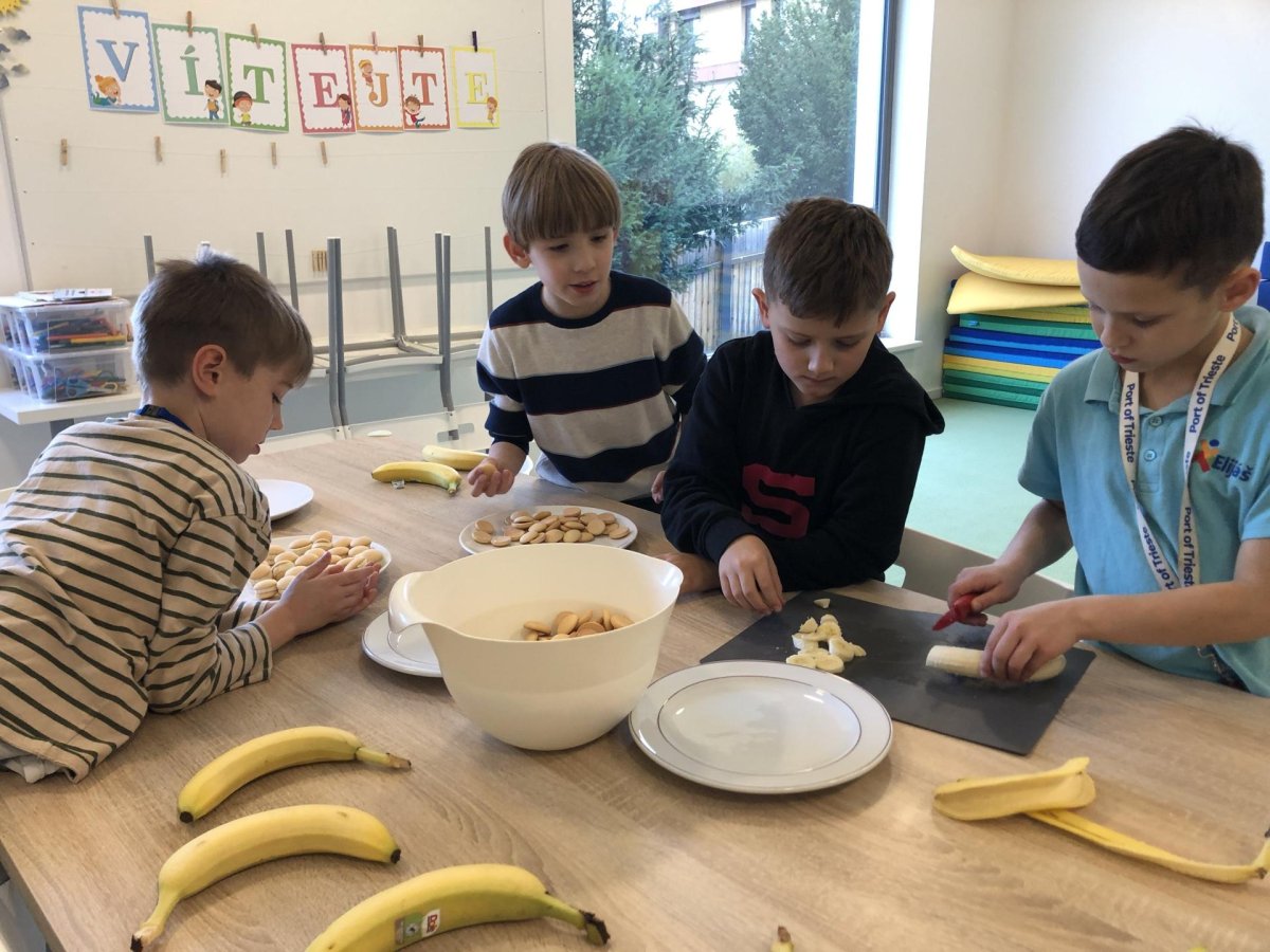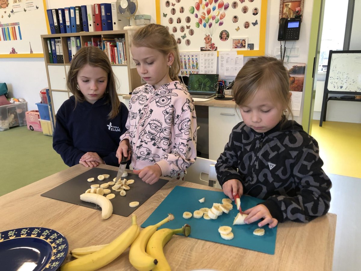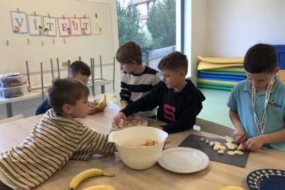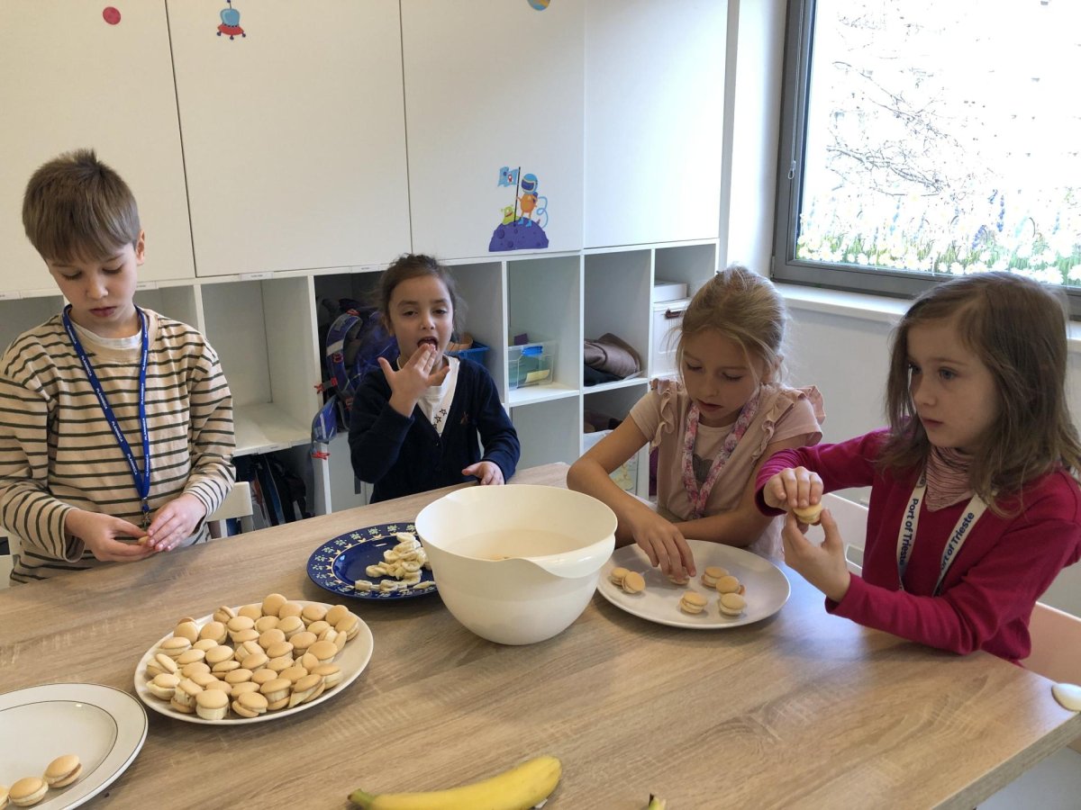 Dnešní den jsme si opravdu užili – proměnili jsme se totiž v cukráře! Společně jsme si připravili jednoduchou, ale velmi chutnou dobrotu: banán v piškotu a v čokoládě.