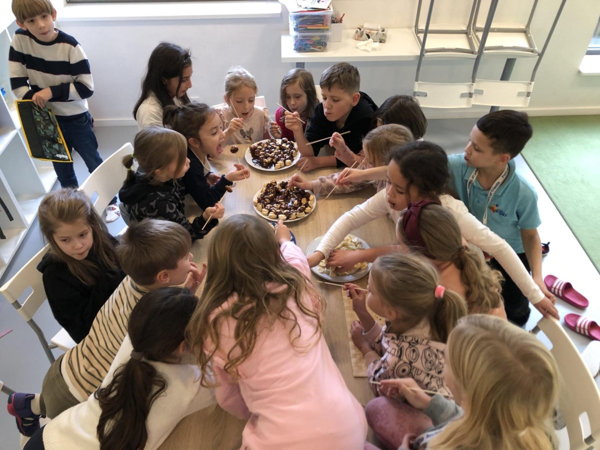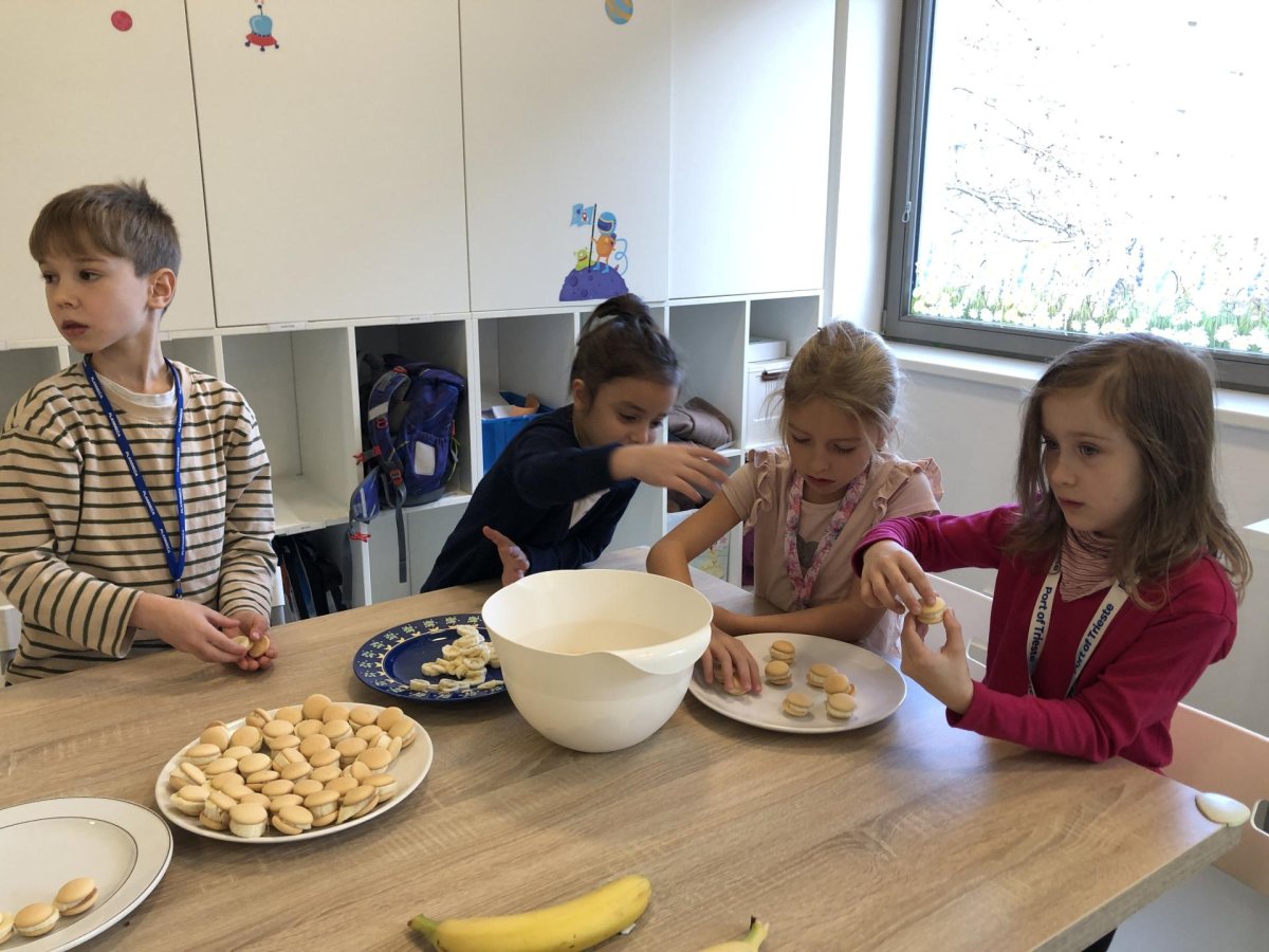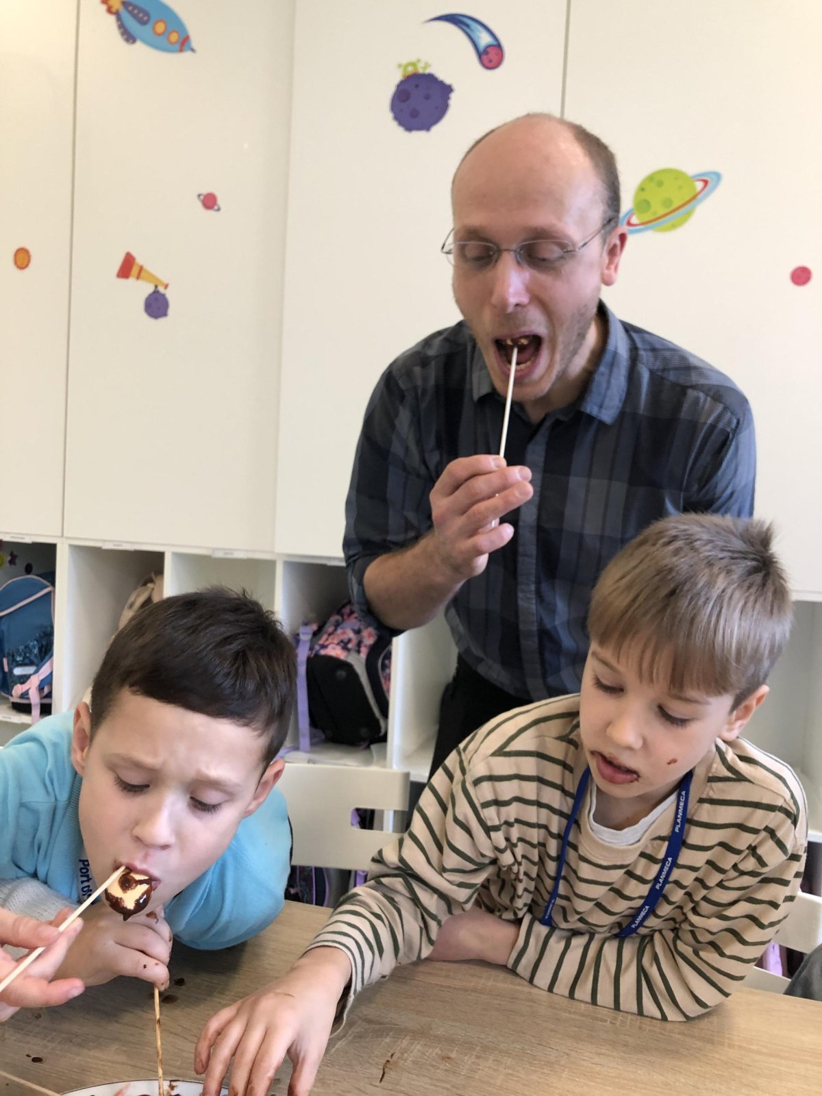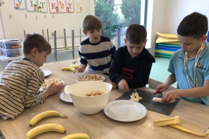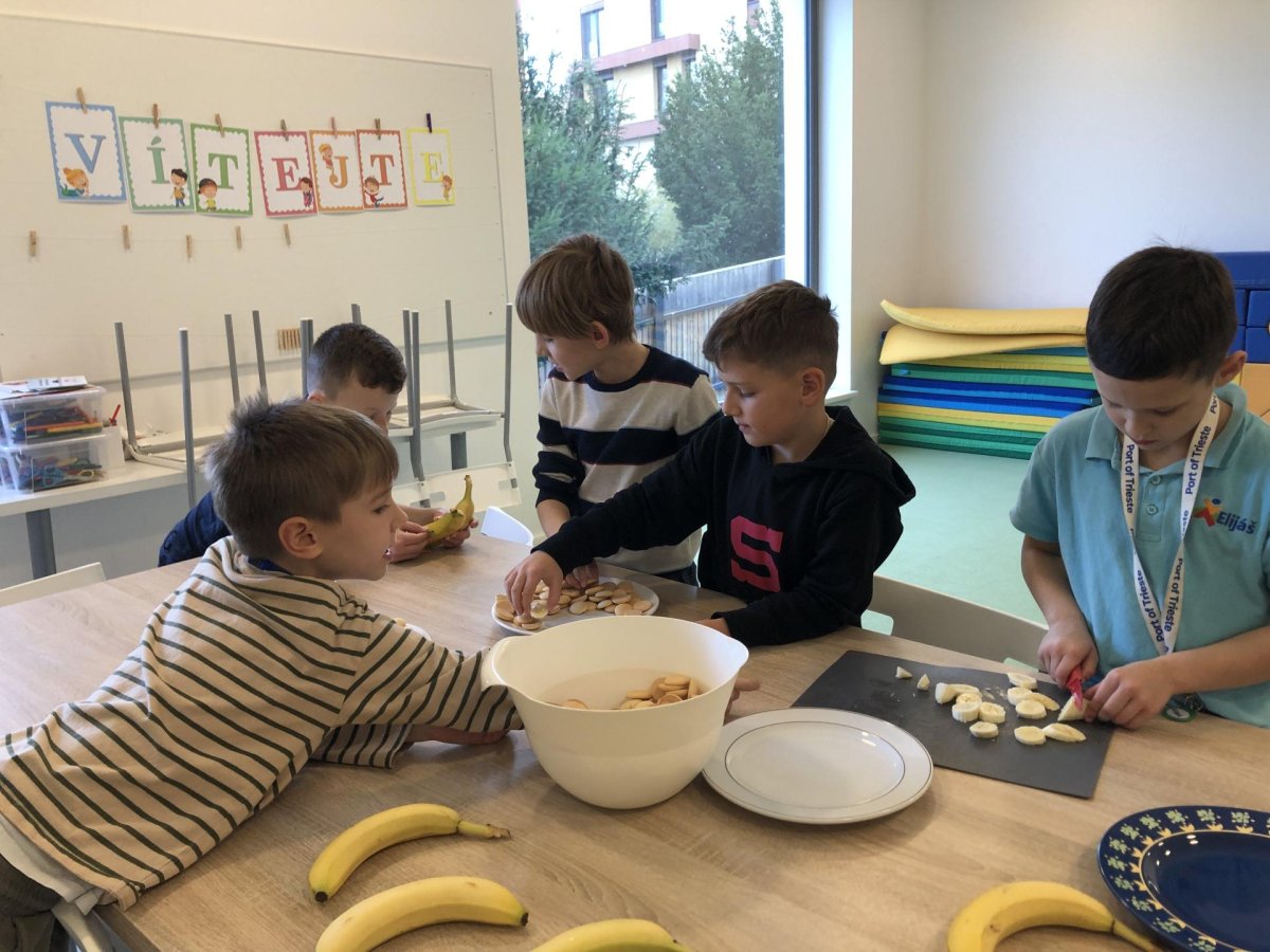 Dnešní den jsme si opravdu užili – proměnili jsme se totiž v cukráře! Společně jsme si připravili jednoduchou, ale velmi chutnou dobrotu: banán v piškotu a v čokoládě.
